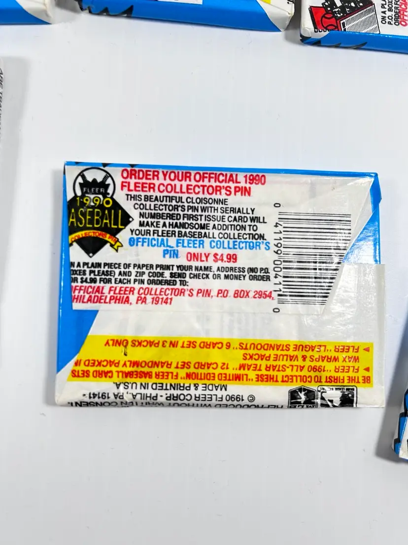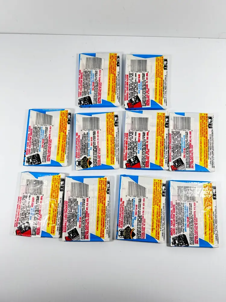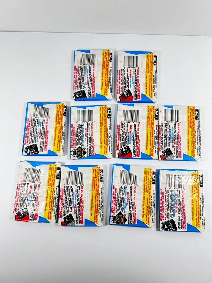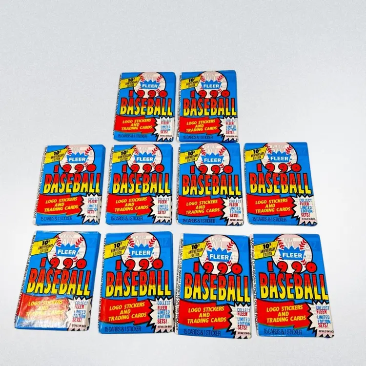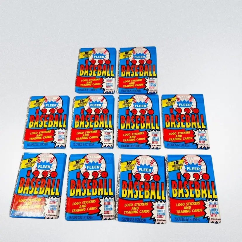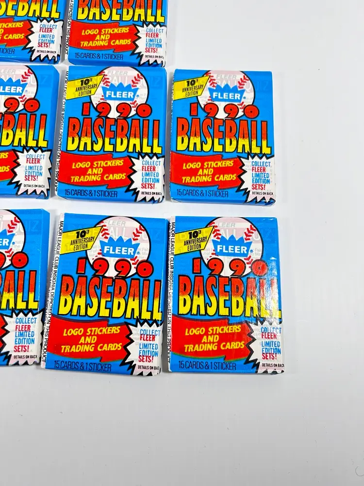 lot of 10 Fleer 1990 Baseball Card Wax Packs, new unopened. 10th Anniversary Edition. Each pack contains 15 cards and 1 sticker. Cards are vintage with possible players like Barry Bonds, Ken Griffey Jr, Mark McGwire and more. Sold as shown.