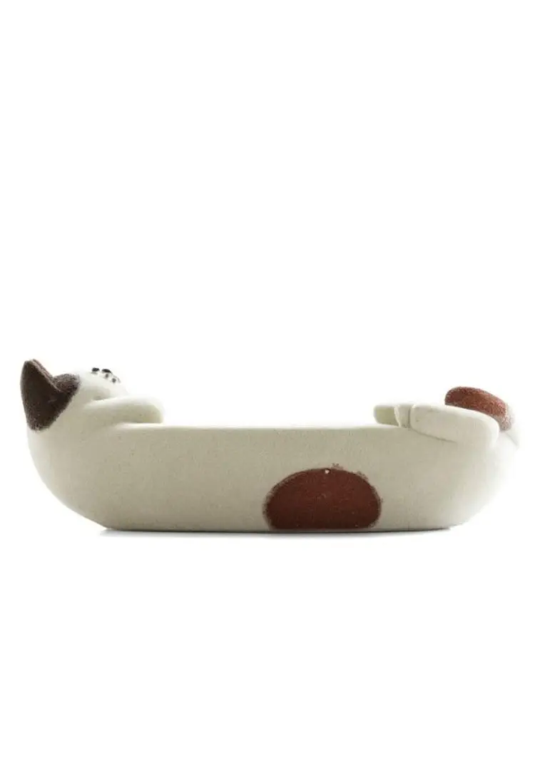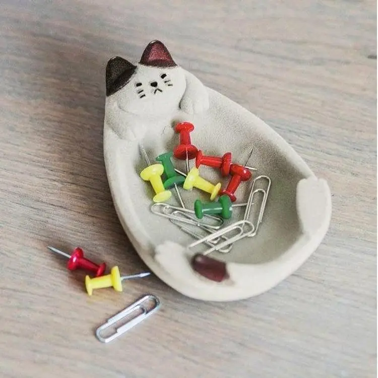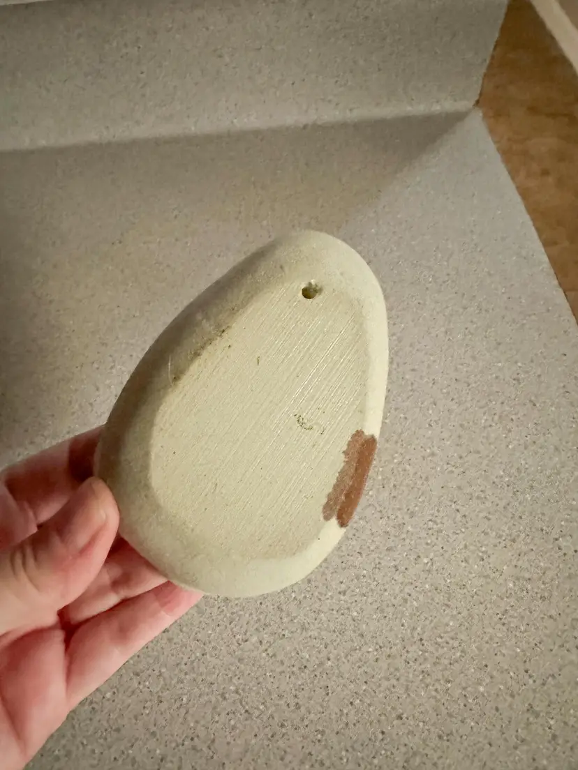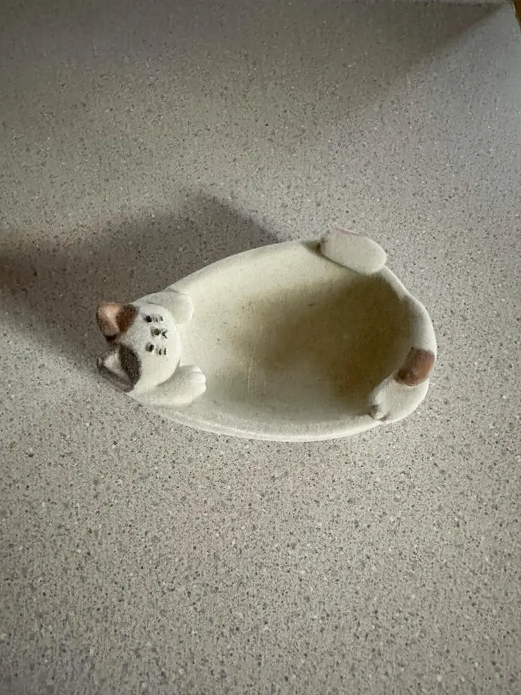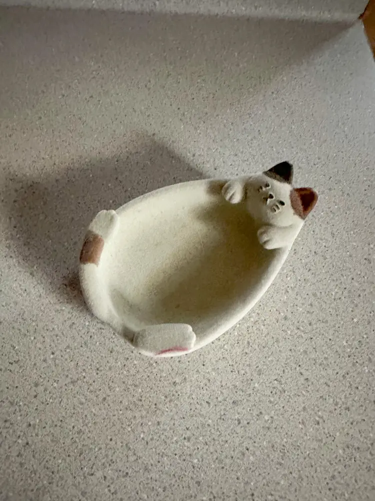Was on display in my office for years, but never really used. Has been in storage about 6 years. Order from Mod Cloth. Flocked texture (velvety) over hard mold, catch all jewelry dish. About 3x5. Has good weight to it. I will keep this if it doesn't sell.