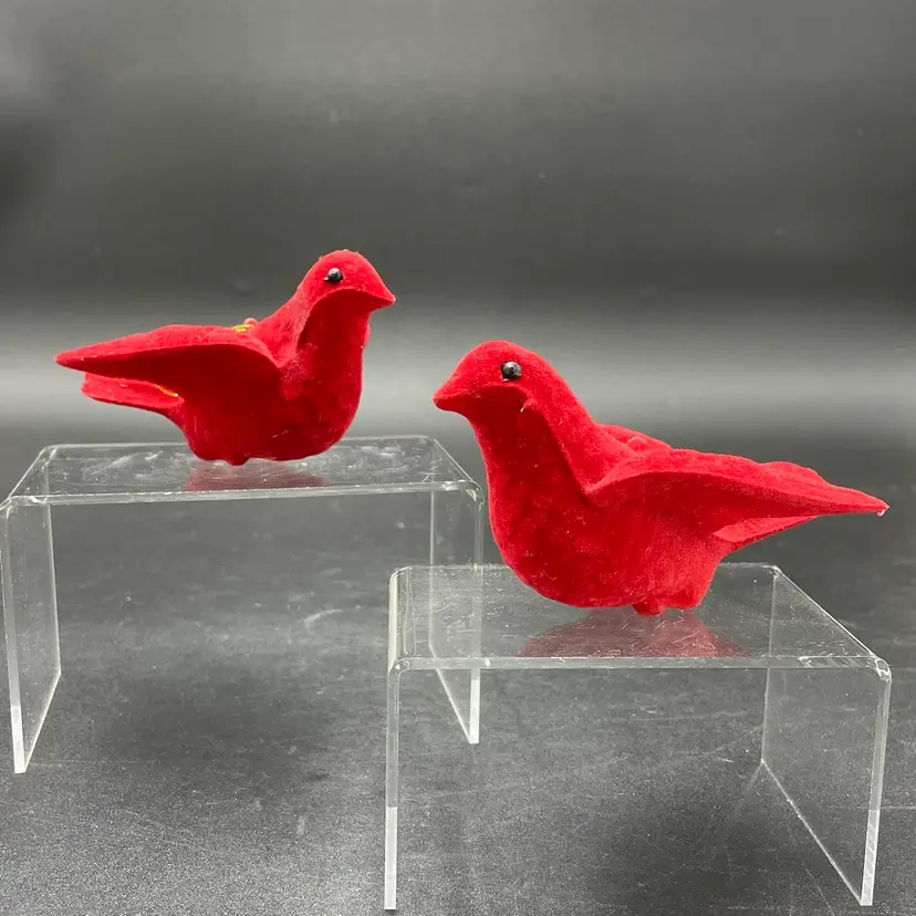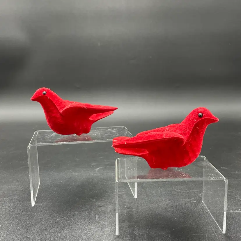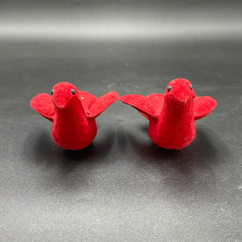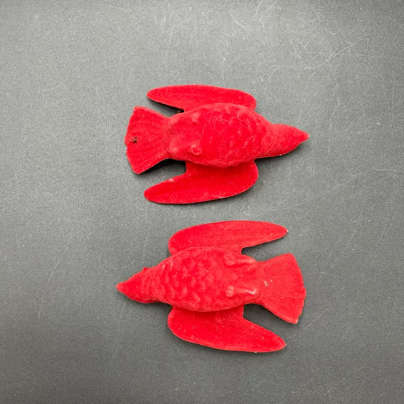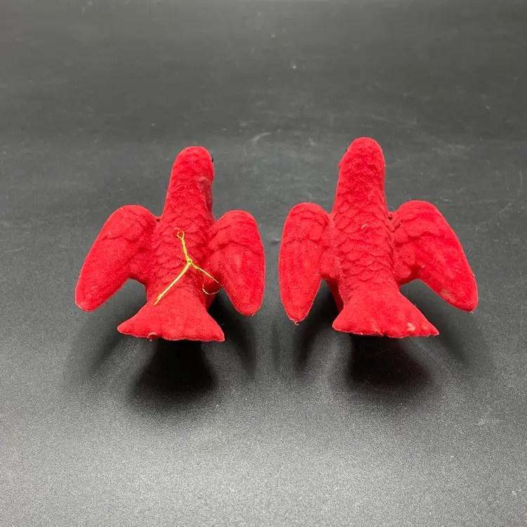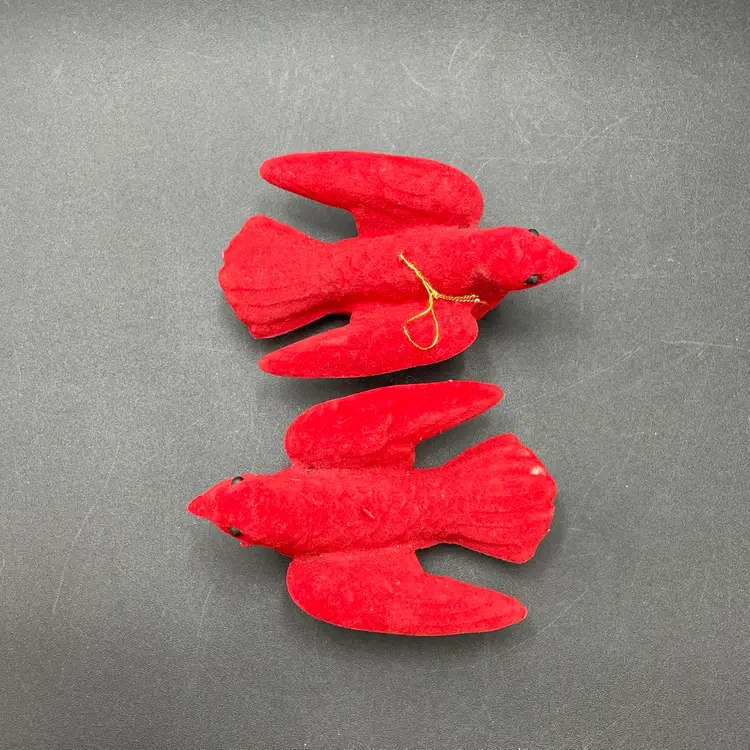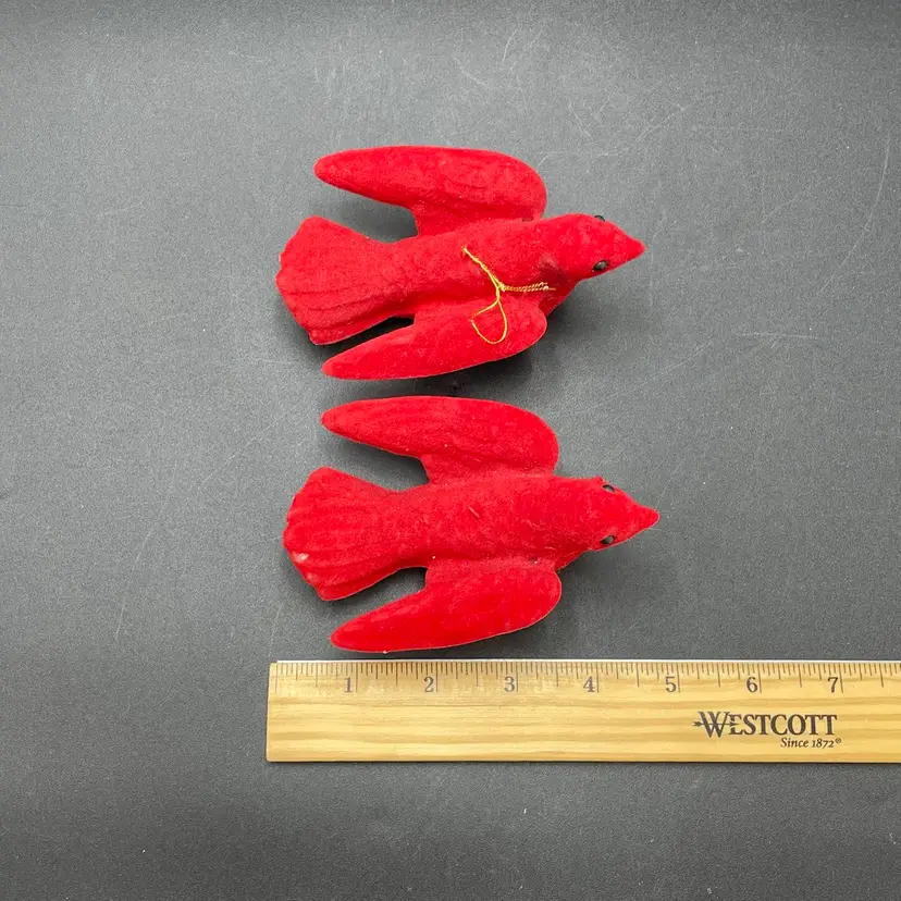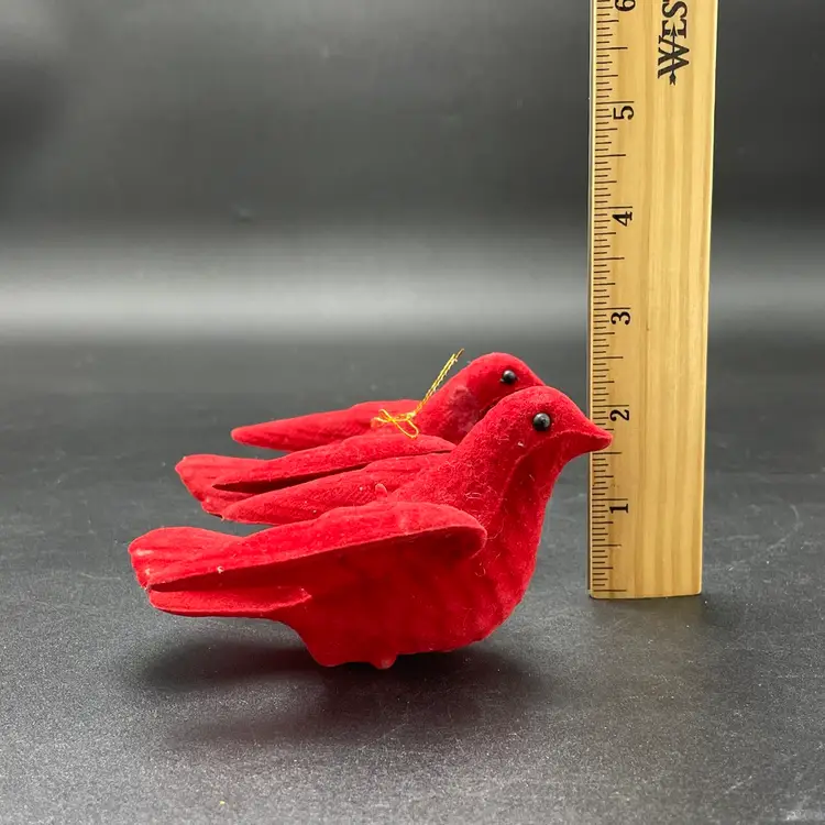 This is a set of 2 vintage red flocked blow mold bird hanging ornaments. Each measure approximately 4.5" long x 2" tall. There is a little flock loss on the tail of one as shown in pictures. No other major flaws.