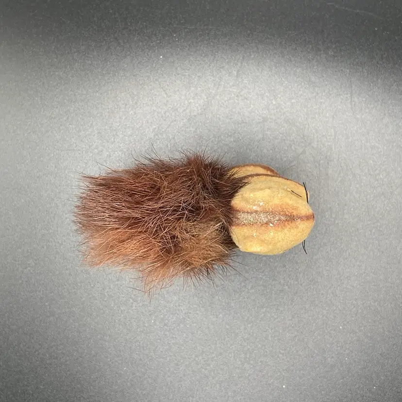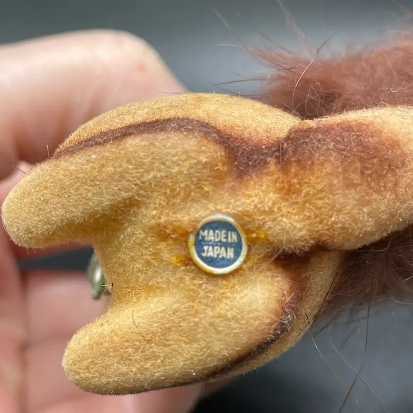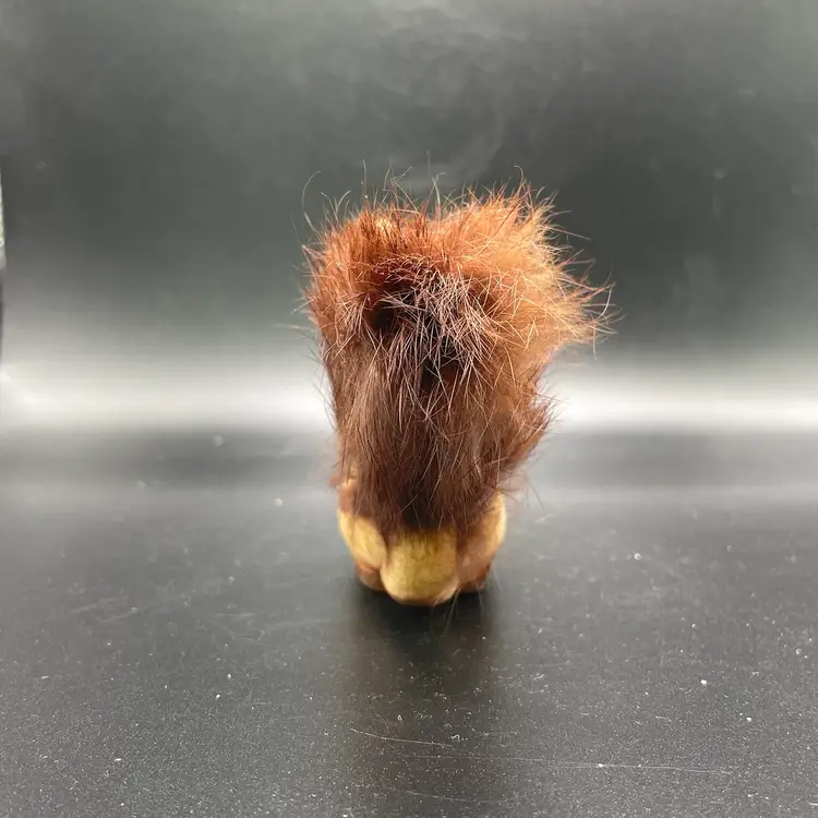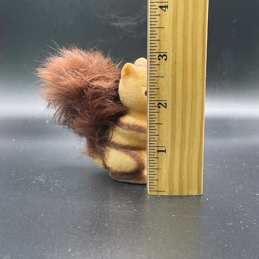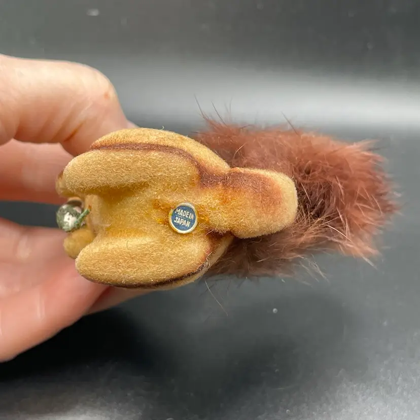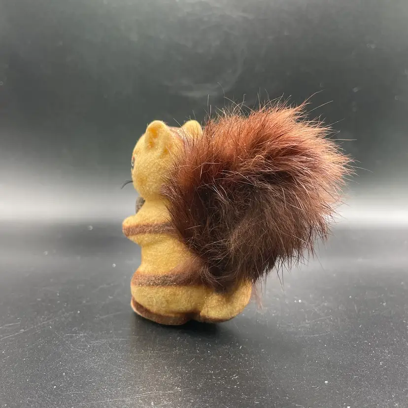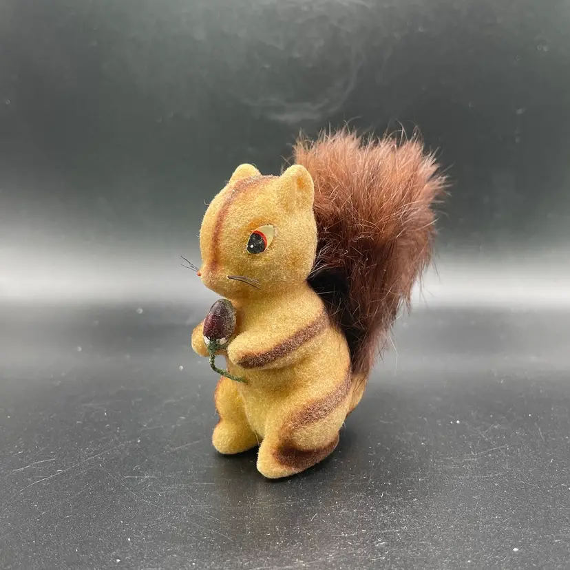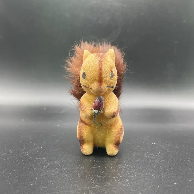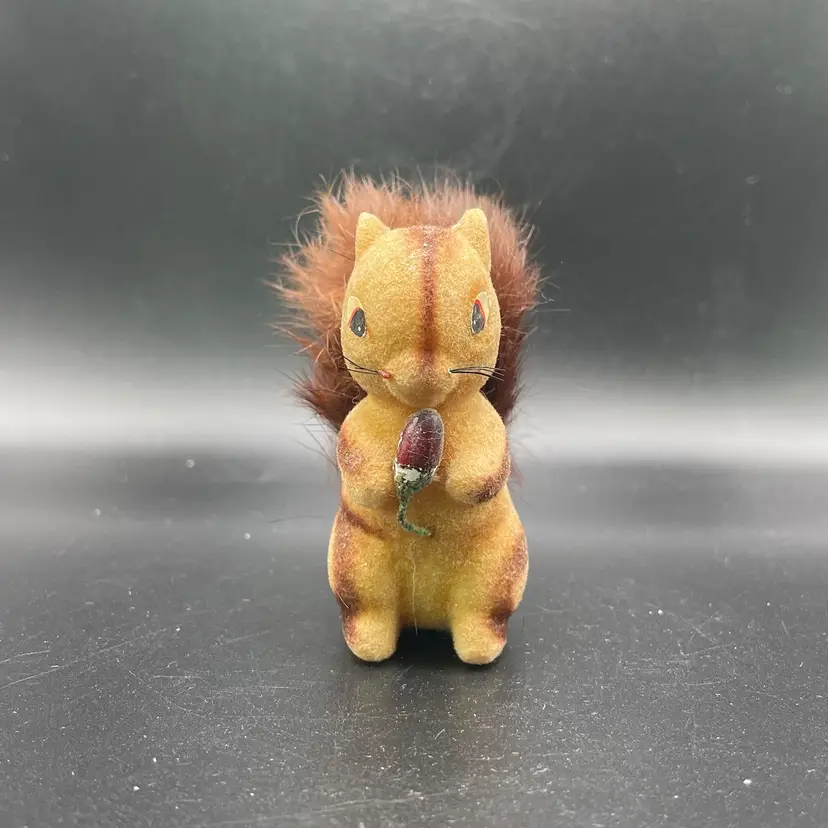 This is a vintage miniature flocked squirrel with faux fur tail holding an acorn figurine. Made in Japan. Measures approximately 3" tall. There is a little paint loss on the acorn as shown in pictures. No other major flaws.