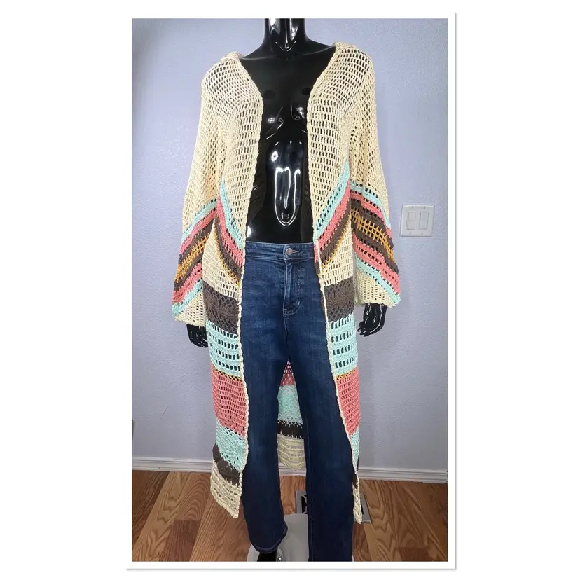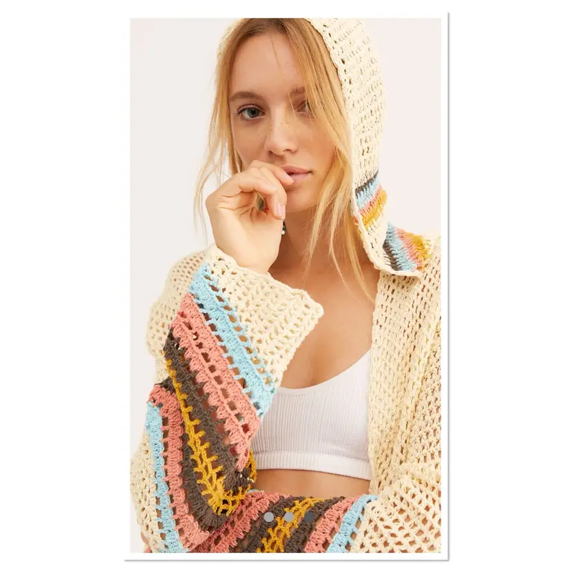 Retro-inspired crochet cardi featured in a stripe pattern.