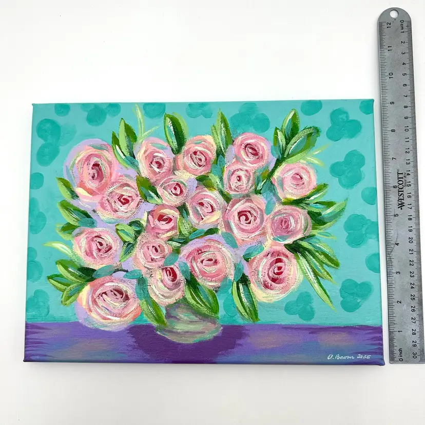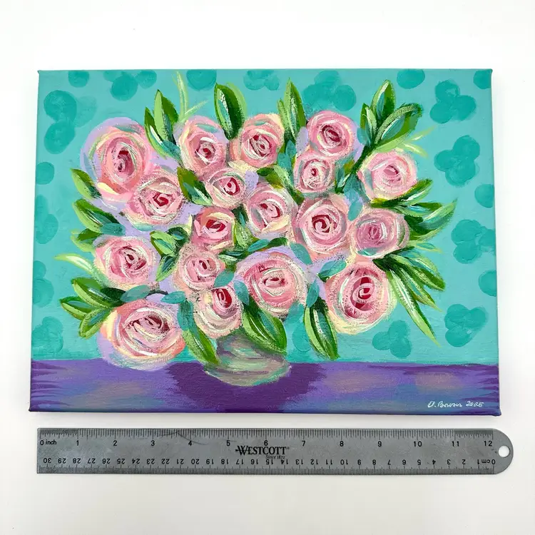 Floral acrylic on canvas painting Features pink roses 9” x 12” Painted by me, new