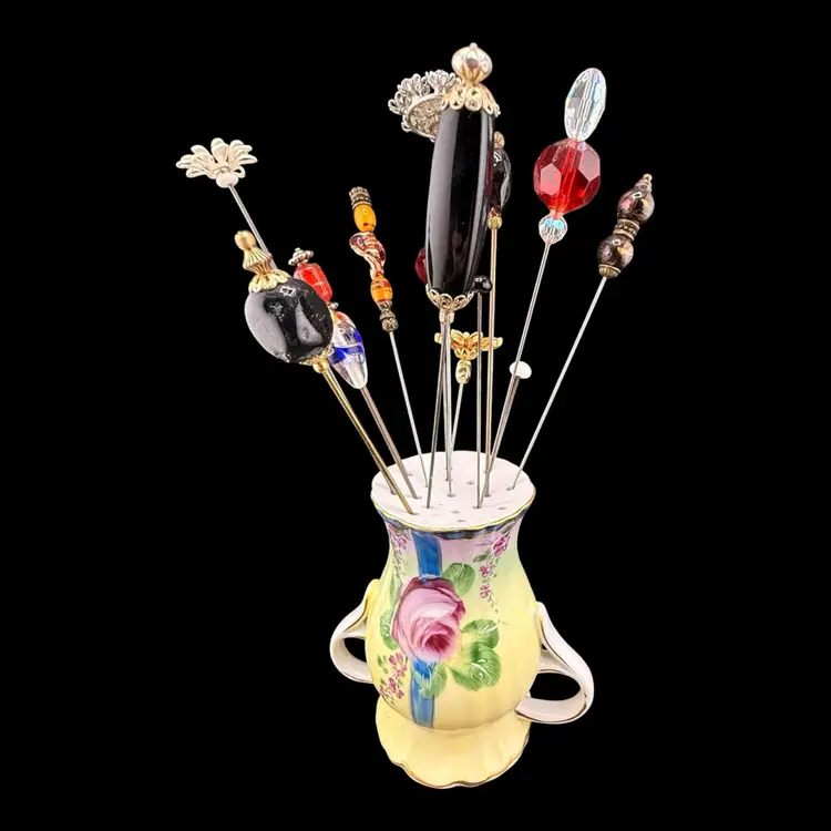 Two holes in base as manufactured. Hat pins are vintage or made from vintage materials.