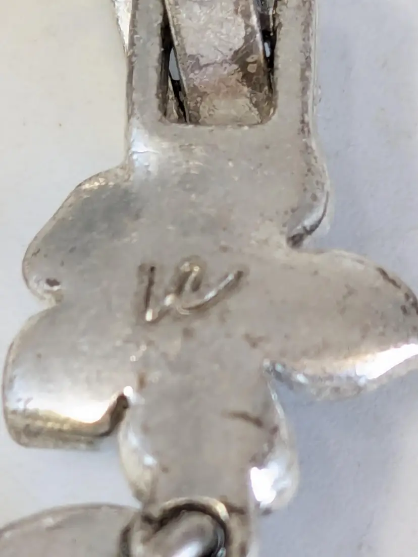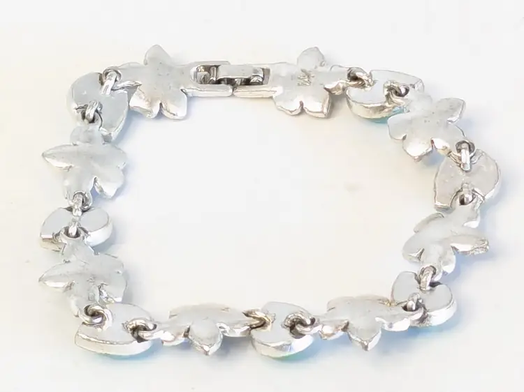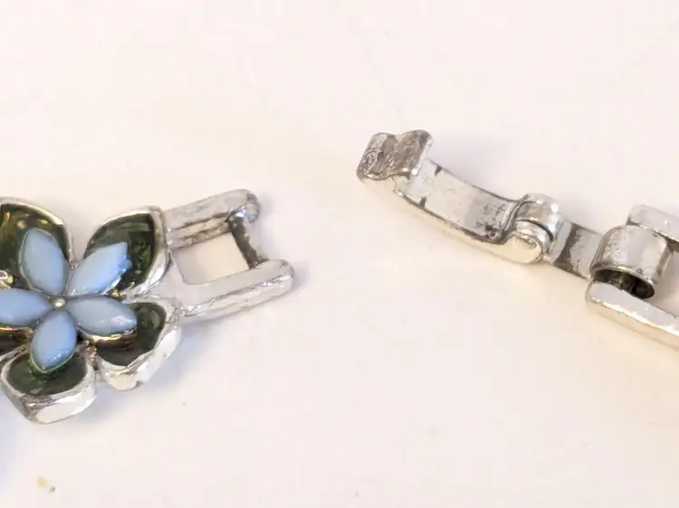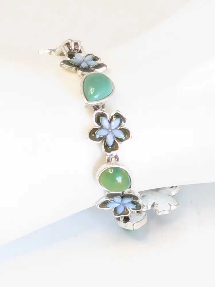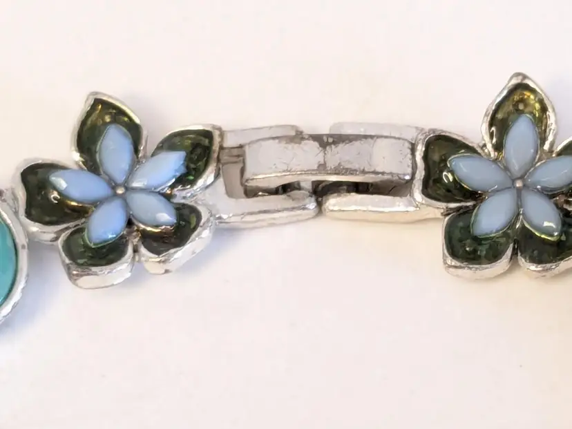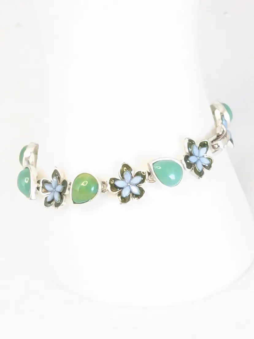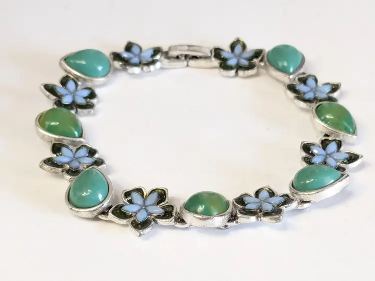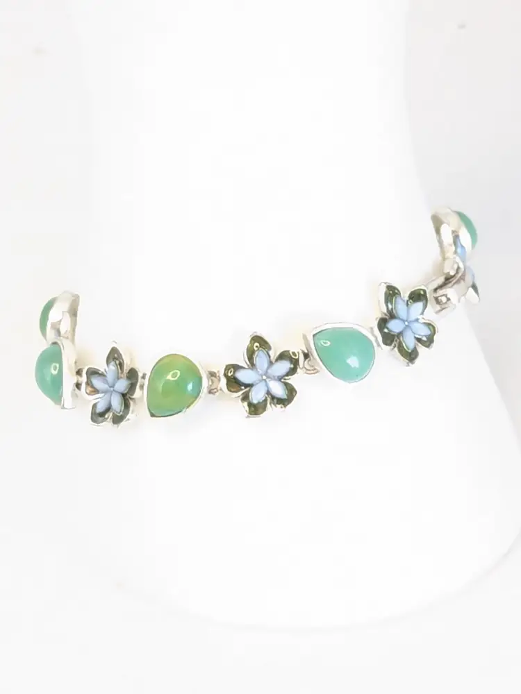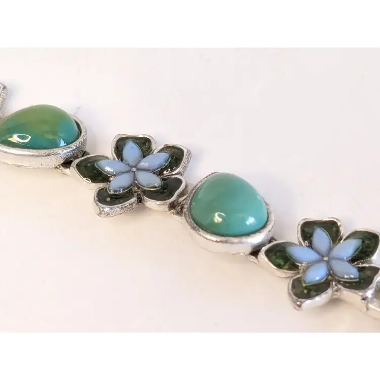 Good condition. Features alternating floral and teardrop-shaped gemstones in blue and green tones. Tested sterling silver but is not marked as such. Stamped LC, perhaps Liz Claiborne? Measures 7". EN2