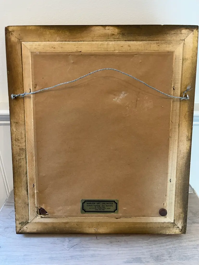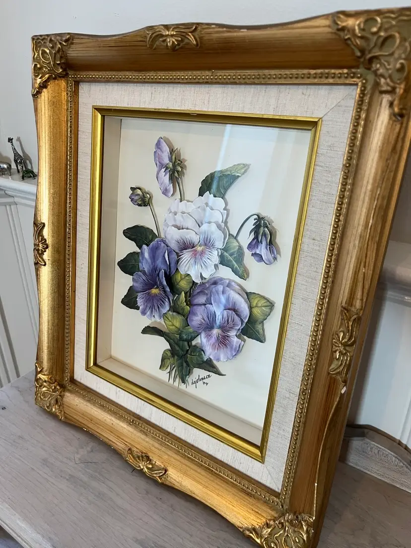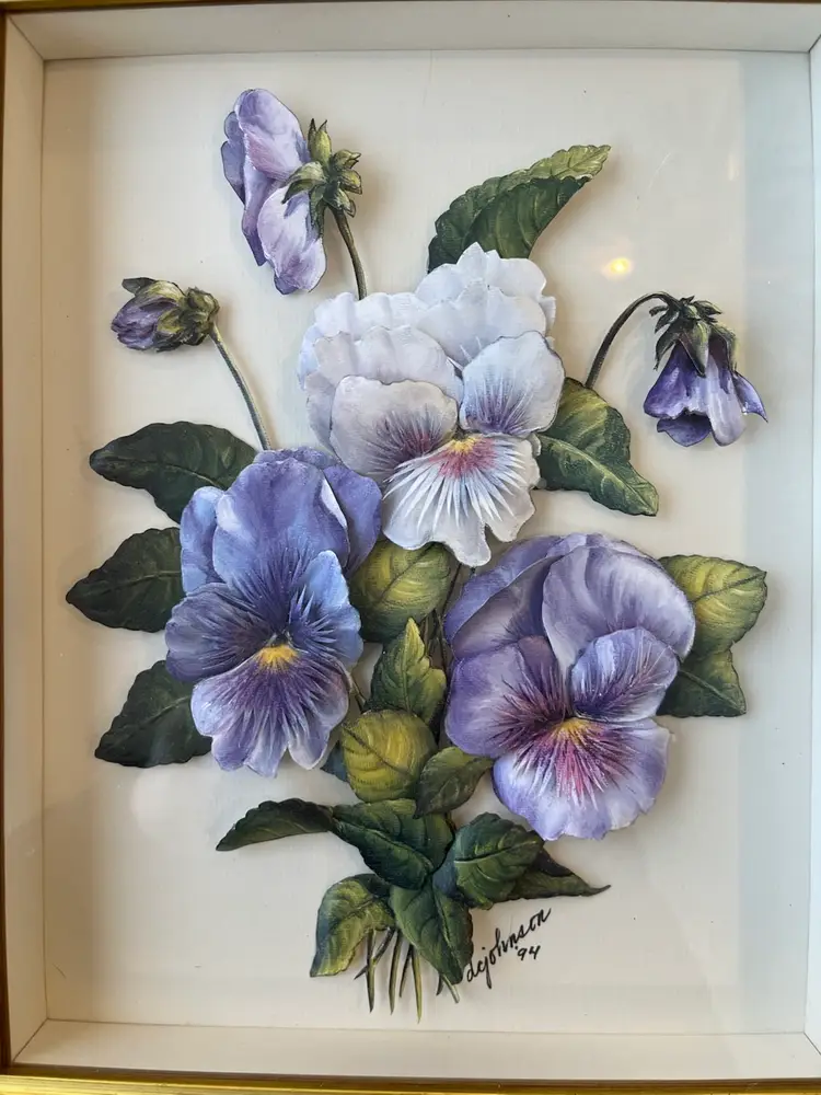 Three-dimensional paper art shadow box featuring pansy flowers crafted from layered paper to create a 3D effect. Housed in a classic, ornate gold-toned, wooden frame & signed by the artist, "dejohnson," and dated '94. 14” x 12”