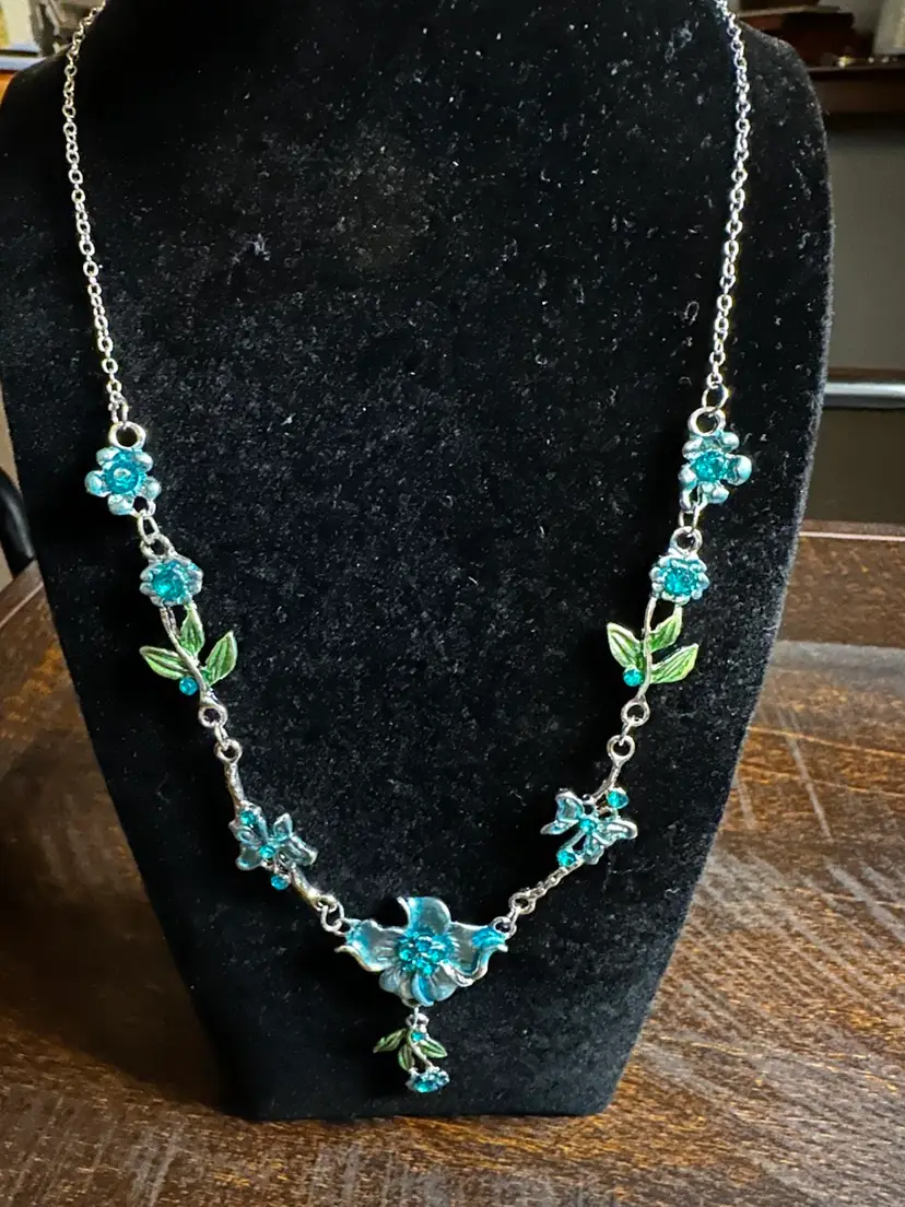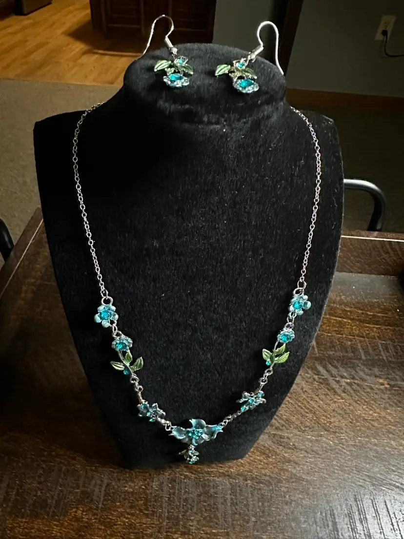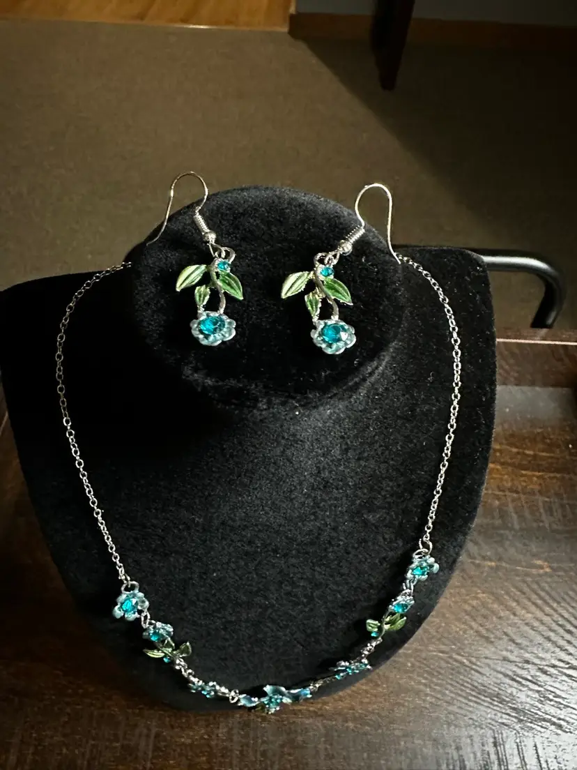 Elegant necklace and earrings featuring blue and green floral designs. Perfect for adding a touch of nature-inspired beauty to any outfit.