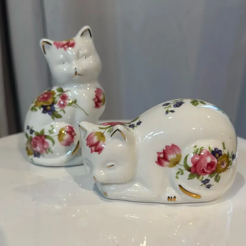 Beautiful vintage floral cat pair. Amazing florals, and gold accents. The standing cat measures 3 1/2 inches tall. The snoozing cat measures 2 inches tall. Cute decor pieces.