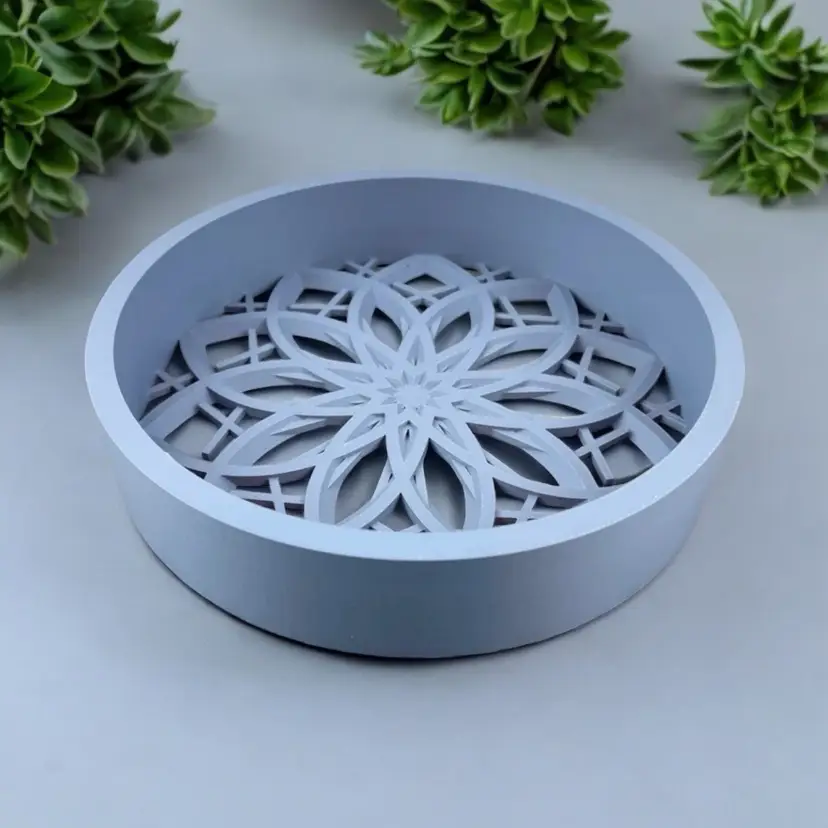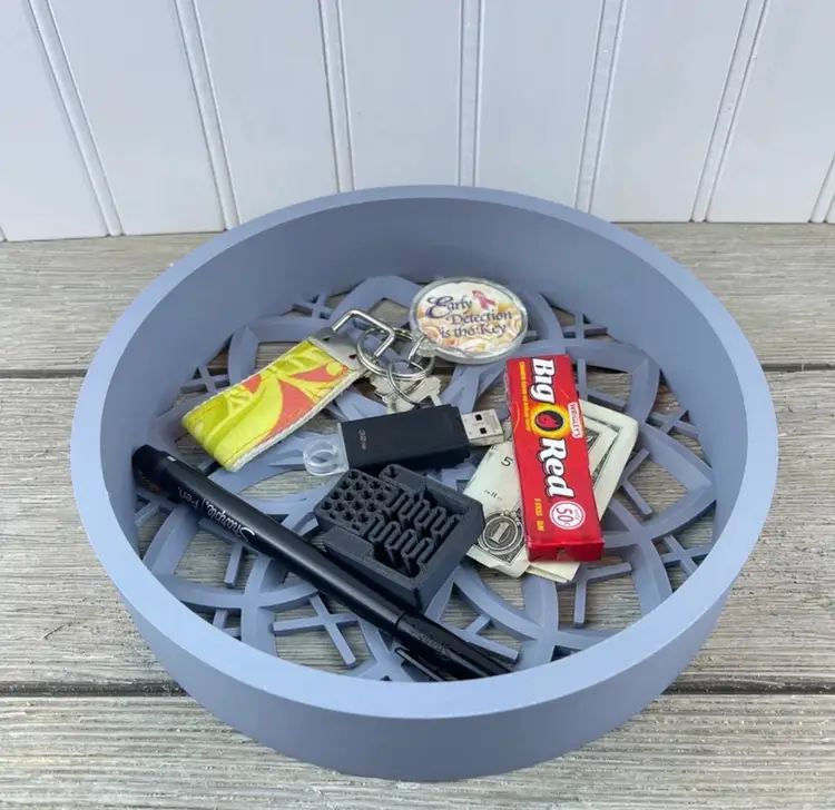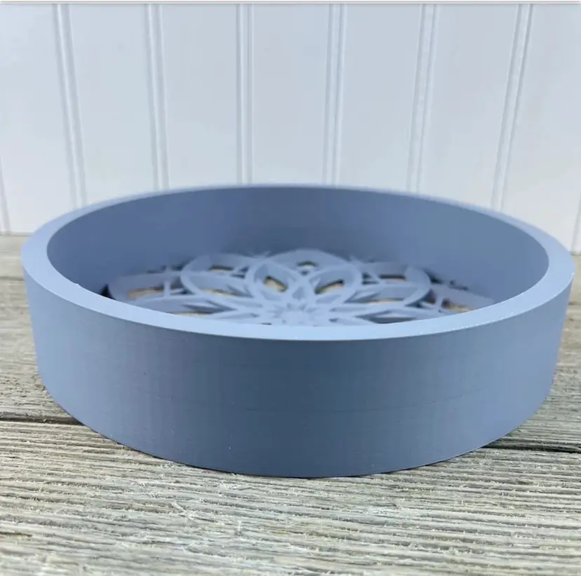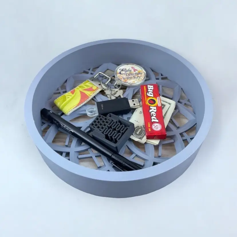 The tray is 3D printed using eco-friendly, biodegradable PLA plastic filament. 3D printing is done by printing layer upon layer of filament to build up and create the print.
