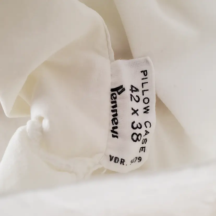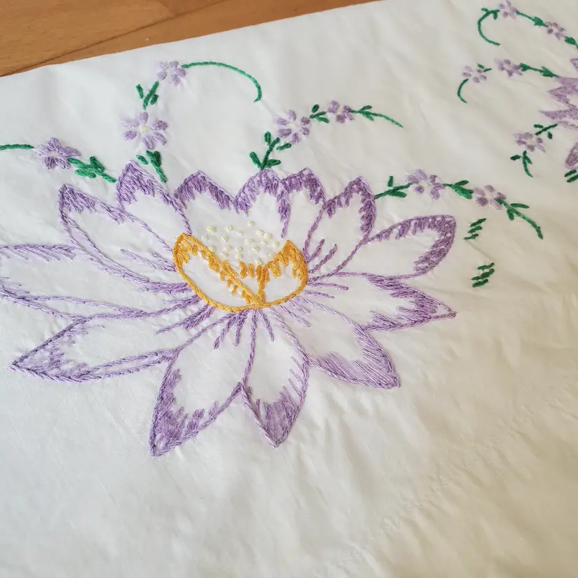 White standard size pillowcase embroidered with purple lotus flowers. No holes, rips or stains.