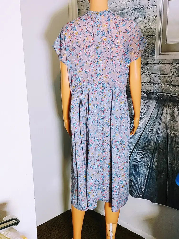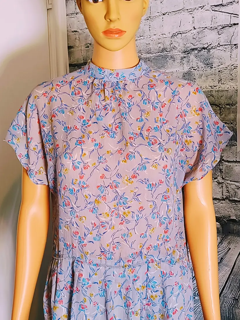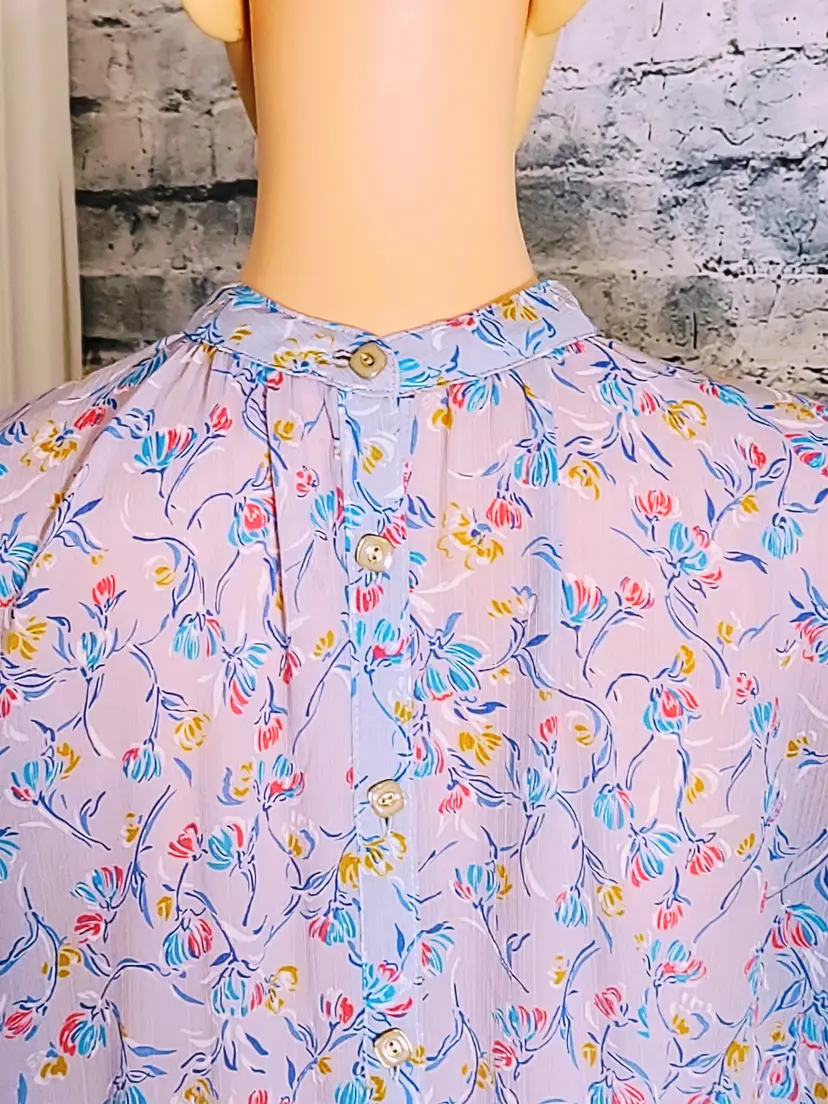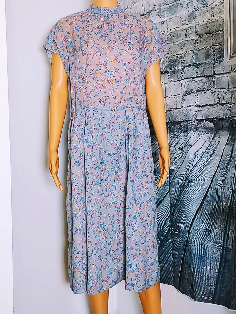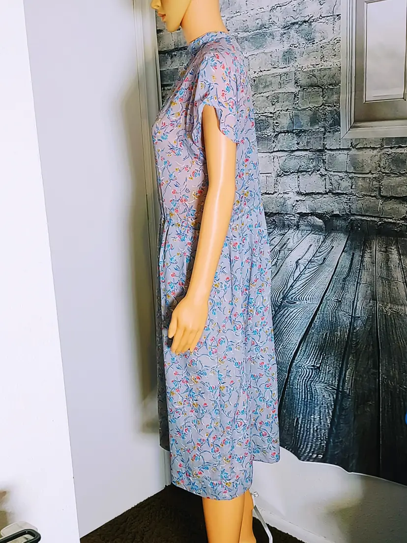 This vintage periwinkle blue sheer dress in size 11 features a floral feminine design with short flutter sleeves and a high neckline. Made from a silk blend chiffon fabric, this A-line dress is perfect for casual or business occasions in the summer, fall, or spring. The dress has a button closure and pleated accents, adding to its charming and cottage core style. Hand wash only to preserve its delicate beauty, this dress exudes elegance and sophistication with a touch of nostalgia.