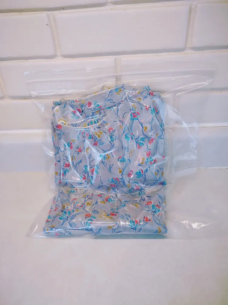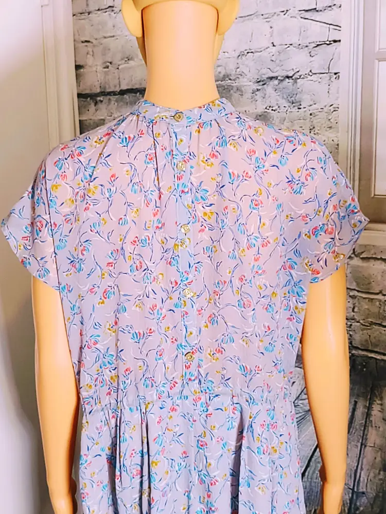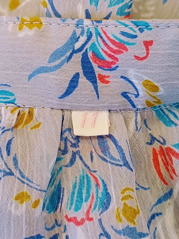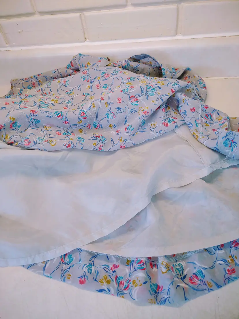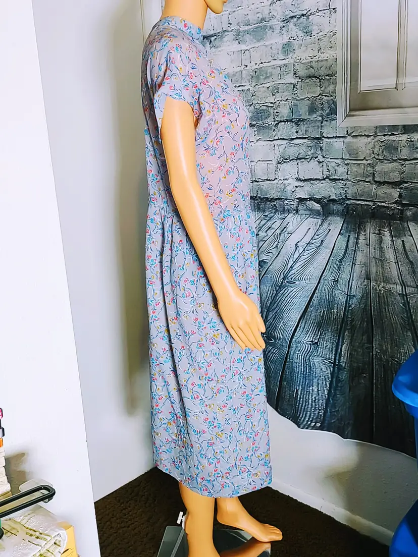 This vintage periwinkle blue sheer dress in size 11 features a floral feminine design with short flutter sleeves and a high neckline. Made from a silk blend chiffon fabric, this A-line dress is perfect for casual or business occasions in the summer, fall, or spring. The dress has a button closure and pleated accents, adding to its charming and cottage core style. Hand wash only to preserve its delicate beauty, this dress exudes elegance and sophistication with a touch of nostalgia.