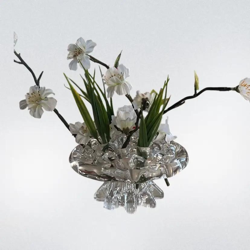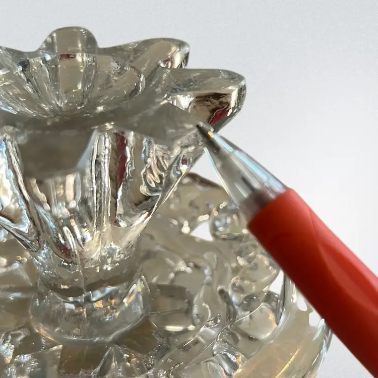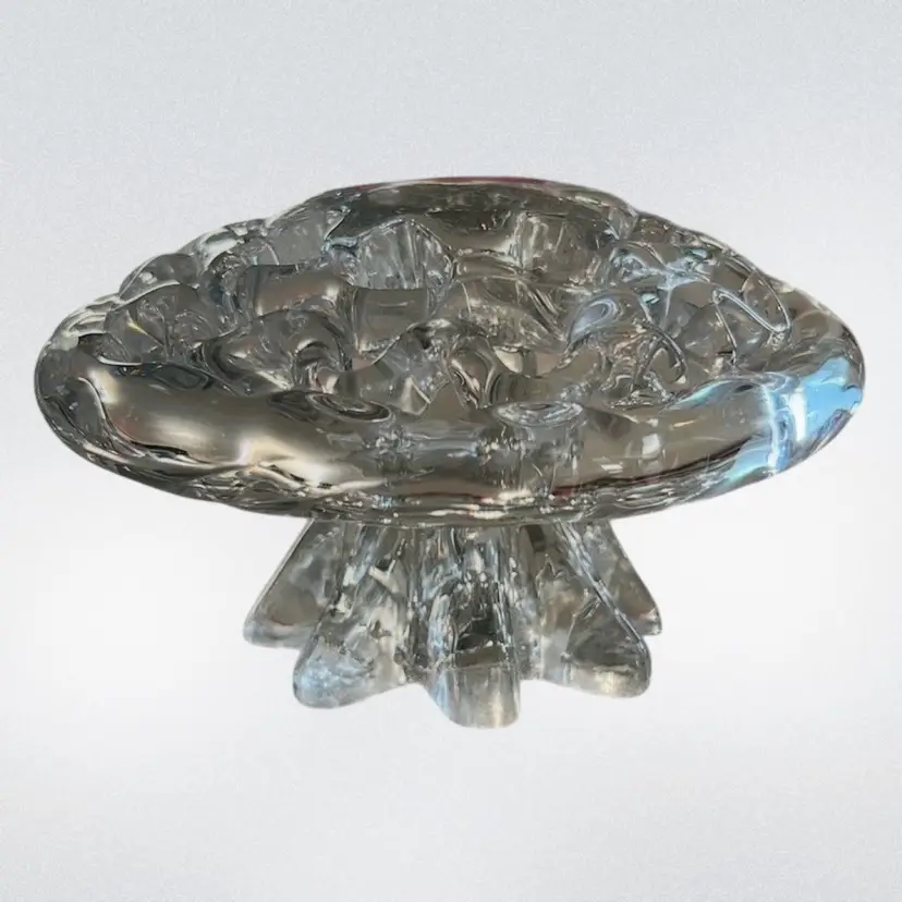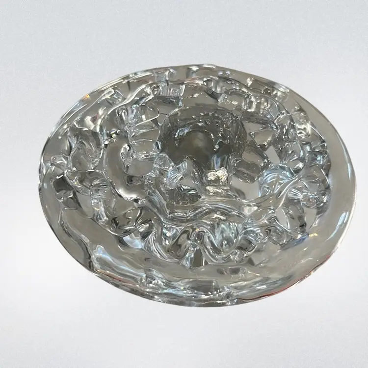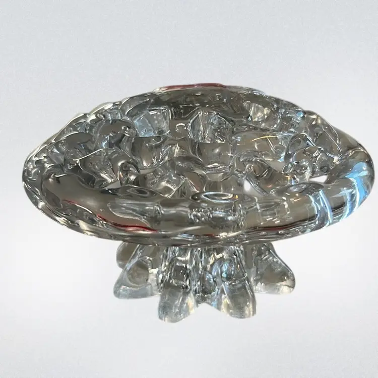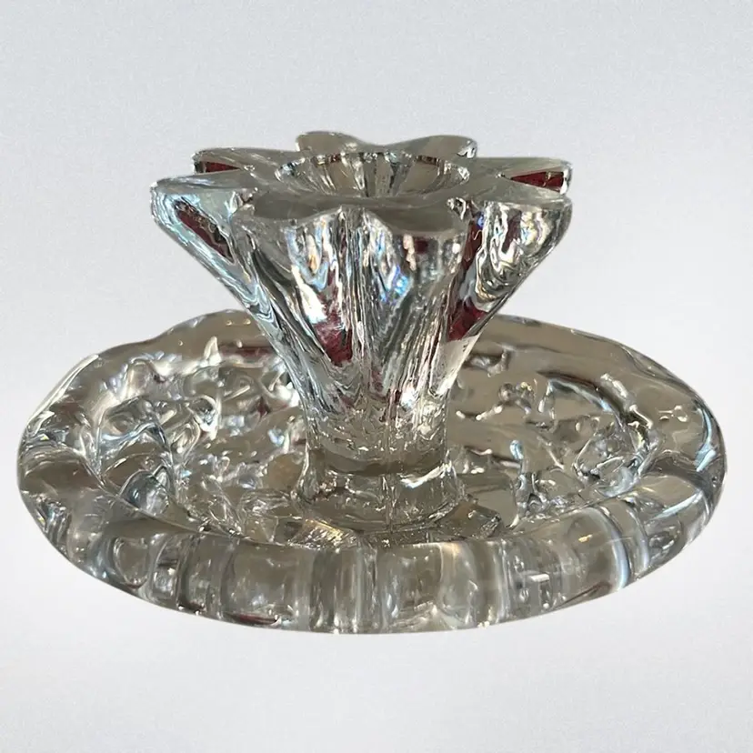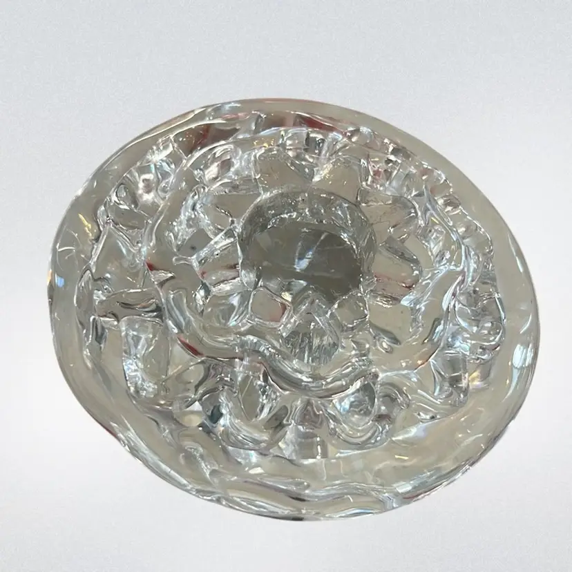 Beautiful crystal flower frog is likely from the Fostoria Glass Company's "American Clear" pattern, which has been in production since the 1910s. Features a distinctive sawtooth texture on a footed base. Primarily used as a flower frog to arrange stems as seen in the photo. It measures approximately 7 1/2 inches in diameter. This particular piece can be added to a clear bowl of water and then the flowers put through the holes of the frog. Very unique piece! There is only one issue I see and I tried to capture it in the photos. there is a chip at the bottom you would not see it because that would be immersed in water, but I tried to point it out in the photo with the pencil.