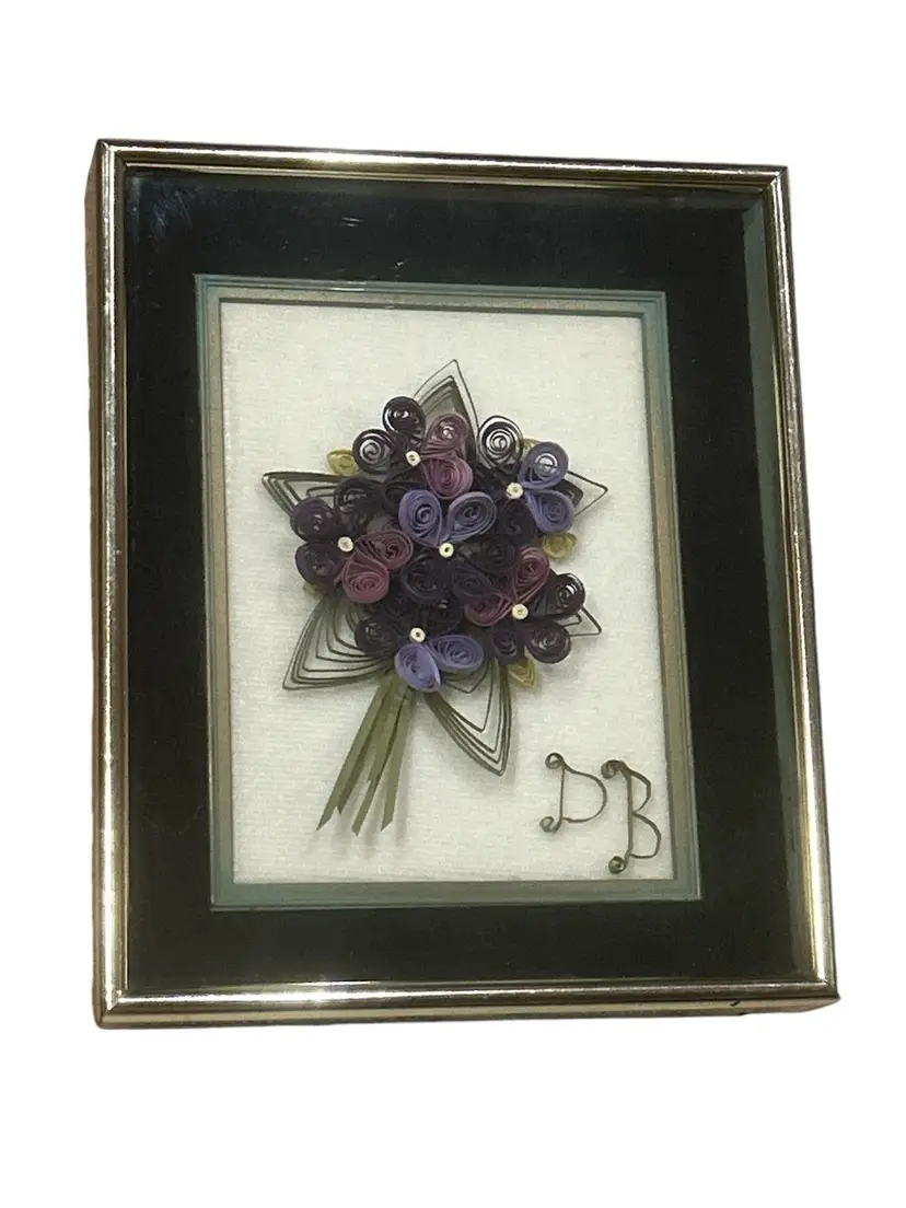 Purple flowers quilling with gold tone frame. Good condition. 6x5x1.