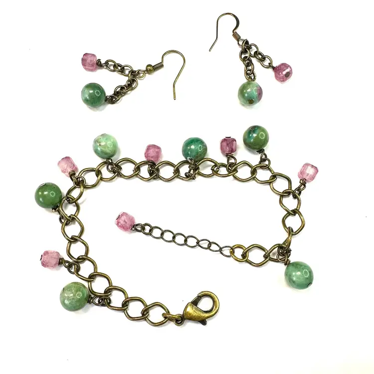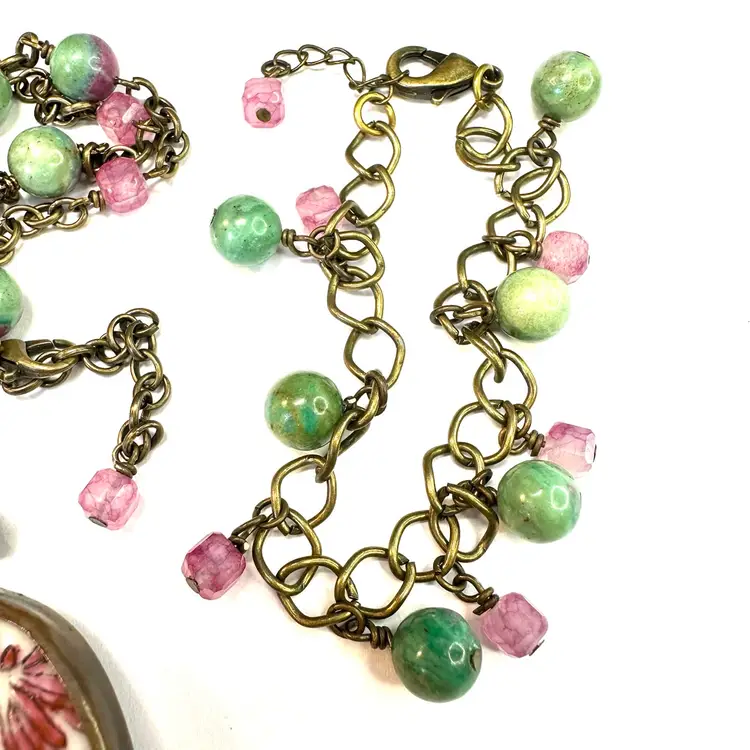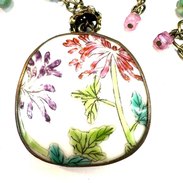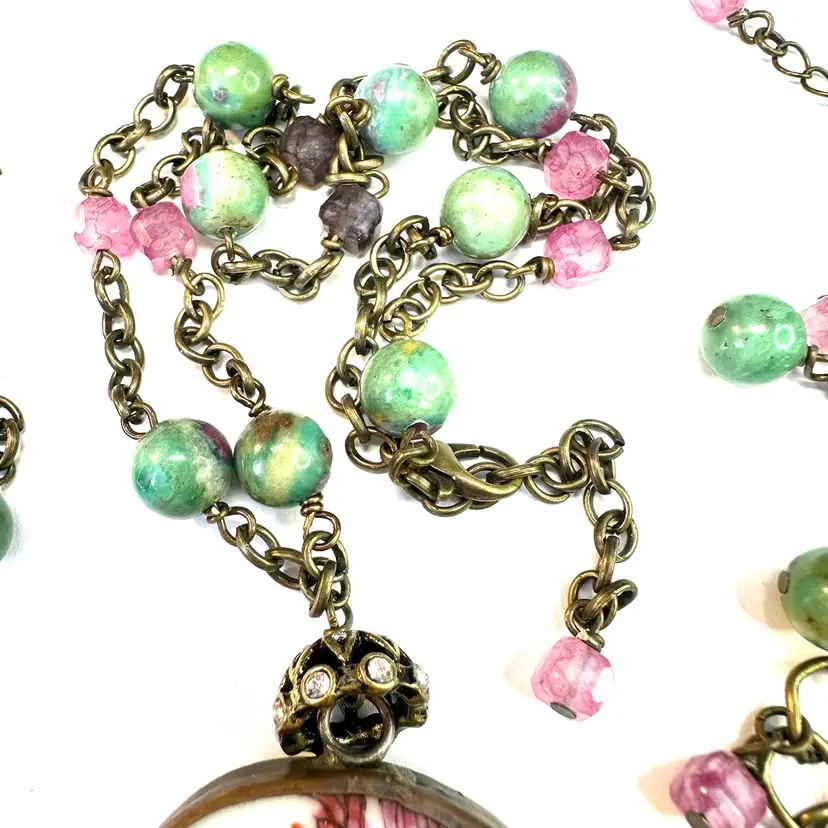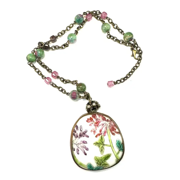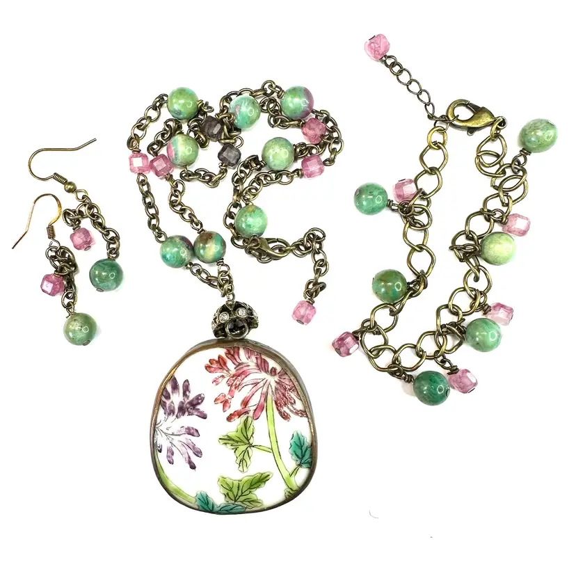 Features a repurposed pendant and beaded chain, bracelet and earrings made by me Necklace is 18-20” adjustable length, lobster clasp Bracelet is 7.5-9” adjustable length, lobster clasp Earrings are approximately 2”L, pierced with fish hook Pendant is possibly artisan made with repurposed ceramic or glass with a floral print