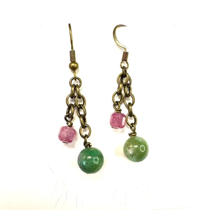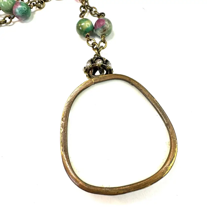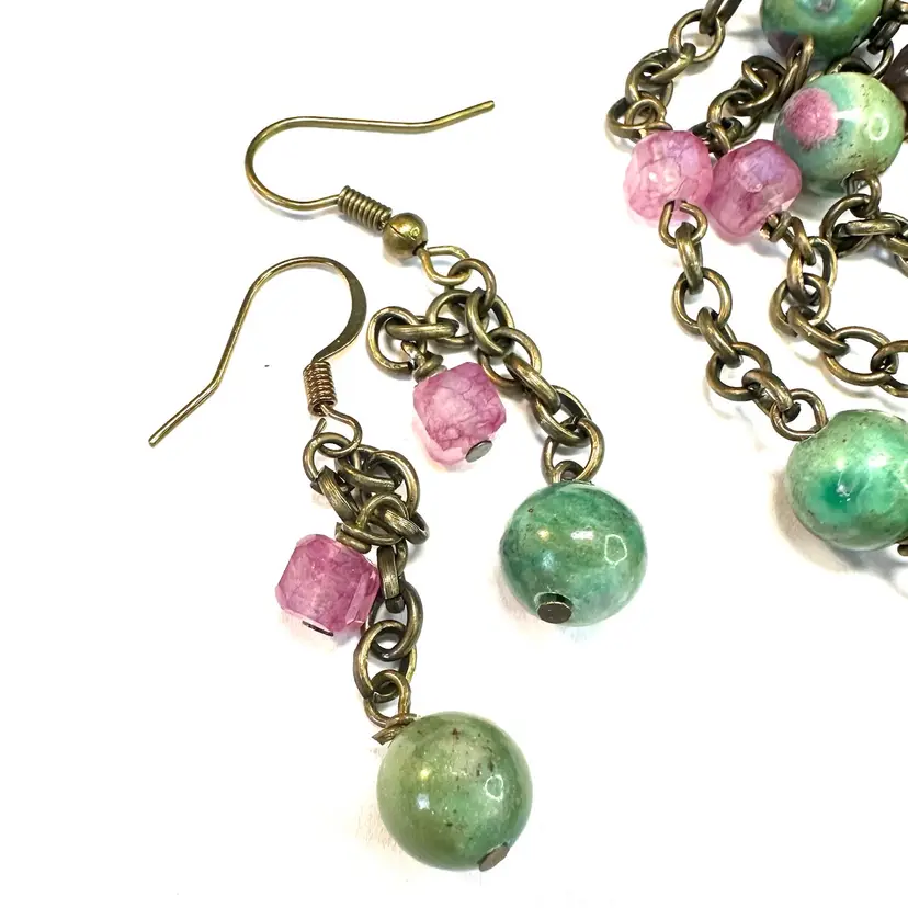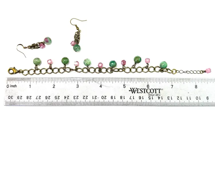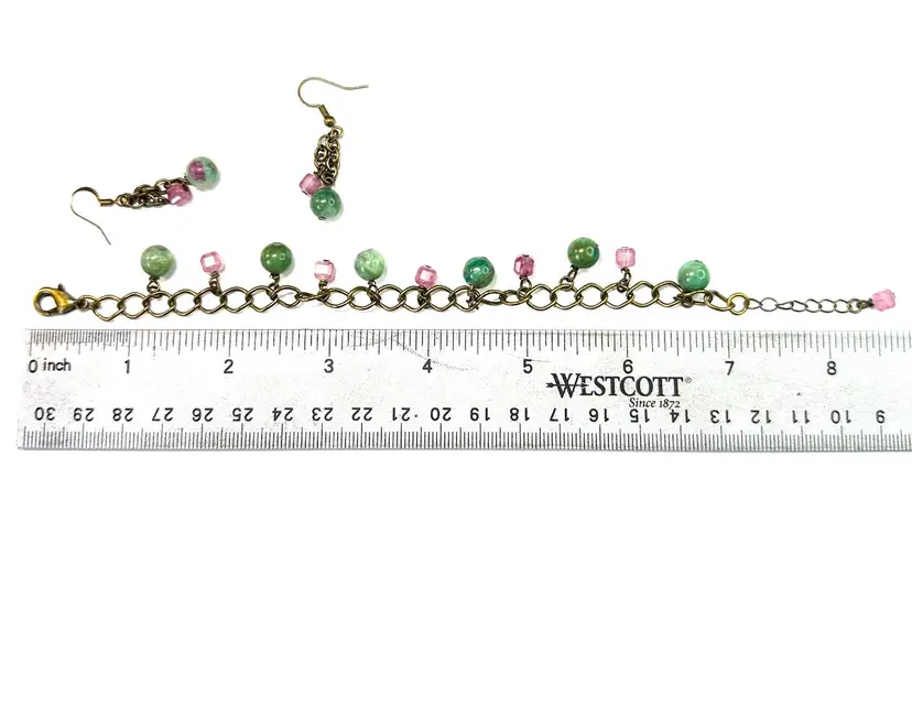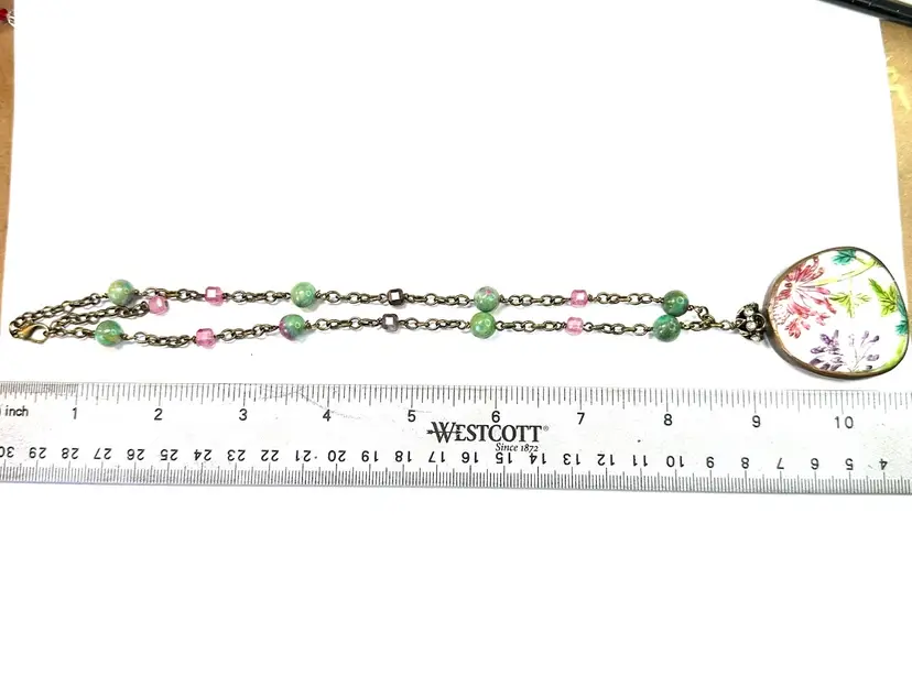 Features a repurposed pendant and beaded chain, bracelet and earrings made by me Necklace is 18-20” adjustable length, lobster clasp Bracelet is 7.5-9” adjustable length, lobster clasp Earrings are approximately 2”L, pierced with fish hook Pendant is possibly artisan made with repurposed ceramic or glass with a floral print