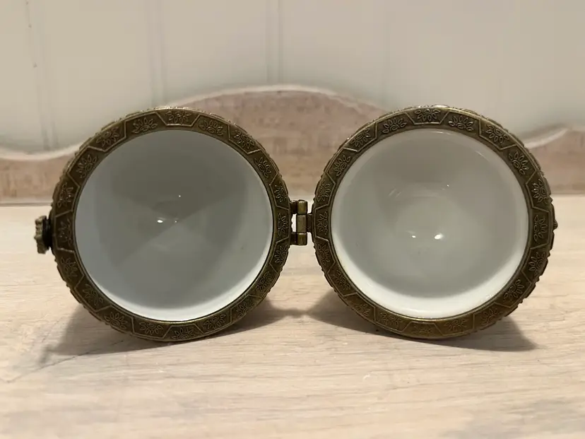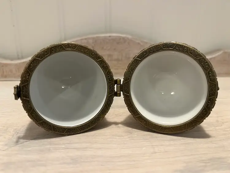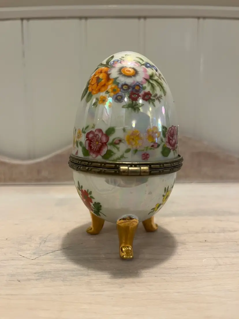 Beautiful decorative porcelain egg trinket box with hand-painted floral design and iridescent finish. Features brass-tone hinge and trim with three gold-tone feet. Opens at the center for storing small jewelry or keepsakes.