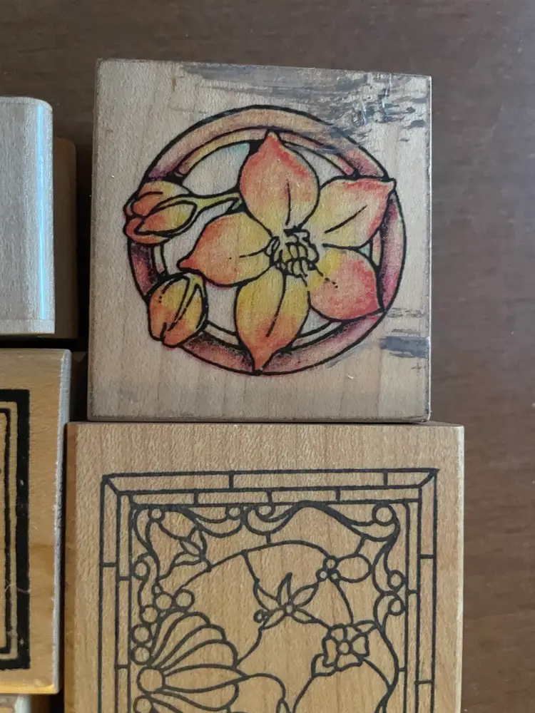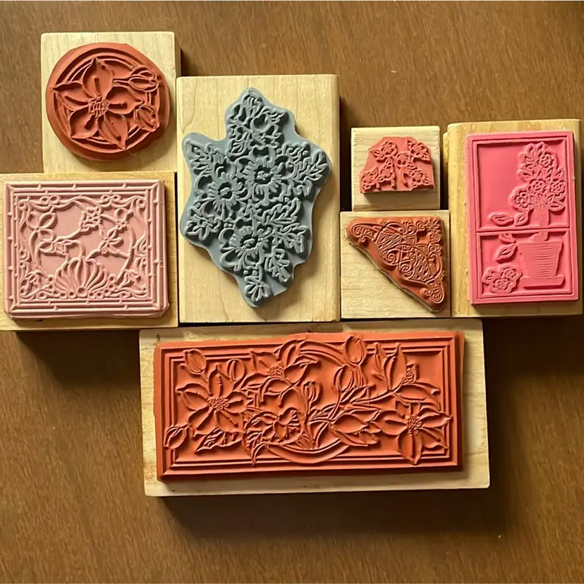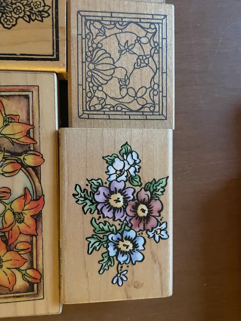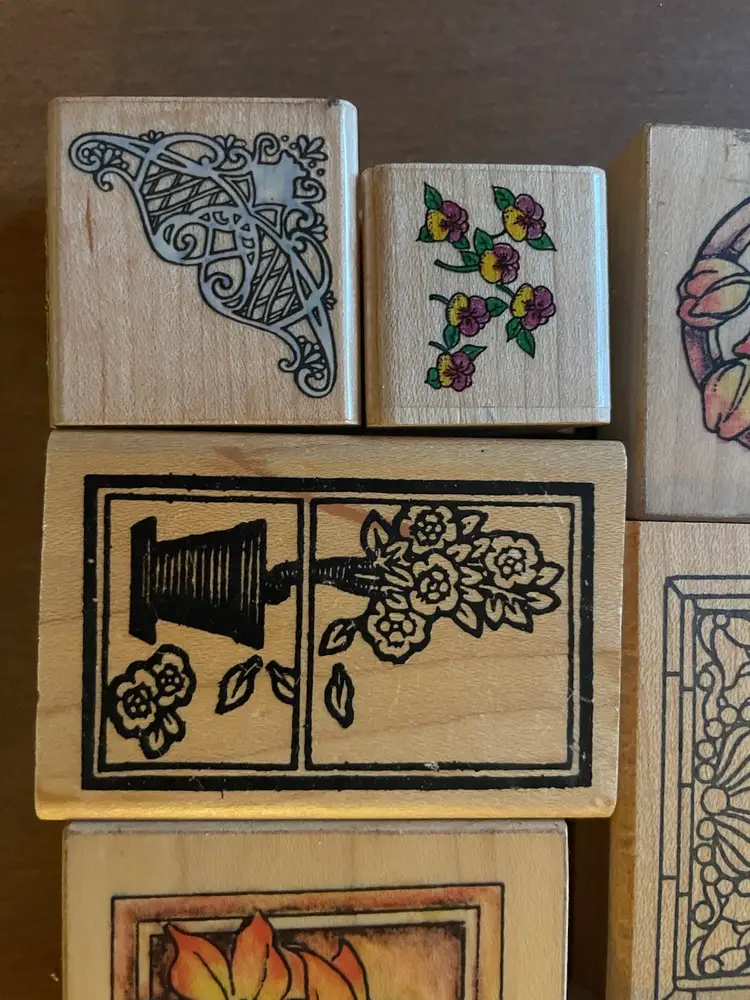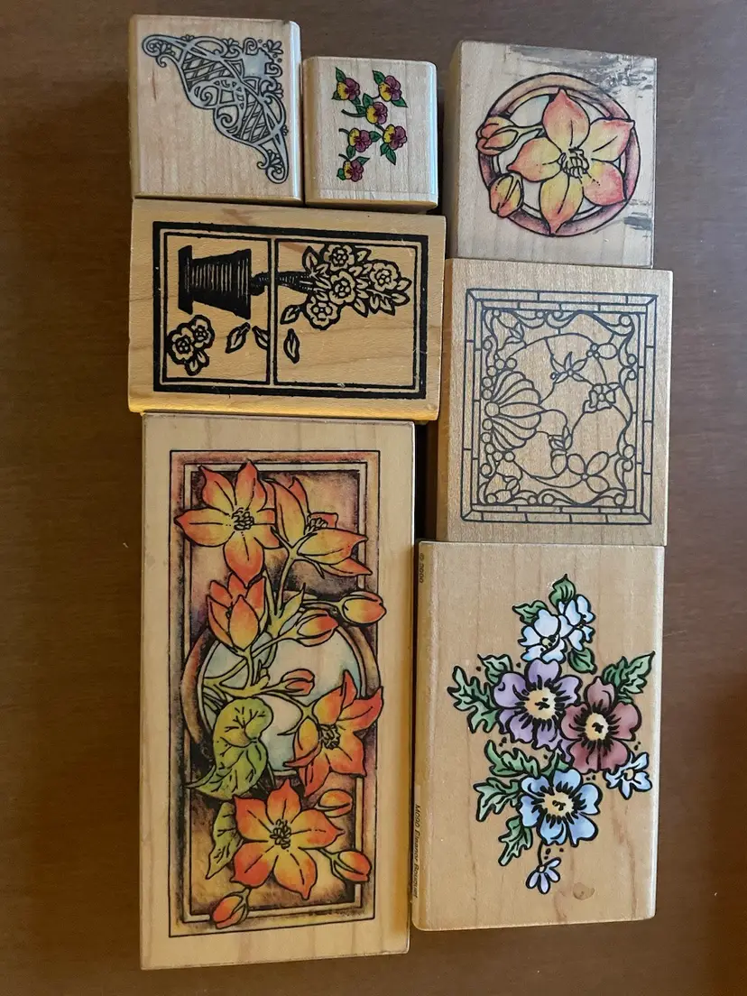 This lot contains 7 vintage floral stamps is versions sizes. The stamps feature an array of beautiful flower arrangement of flowers and designs. These stamps are in good condition. There are markings on a couple wooden blocks. These would make a great edition to your collection. Great for your favorite craft.