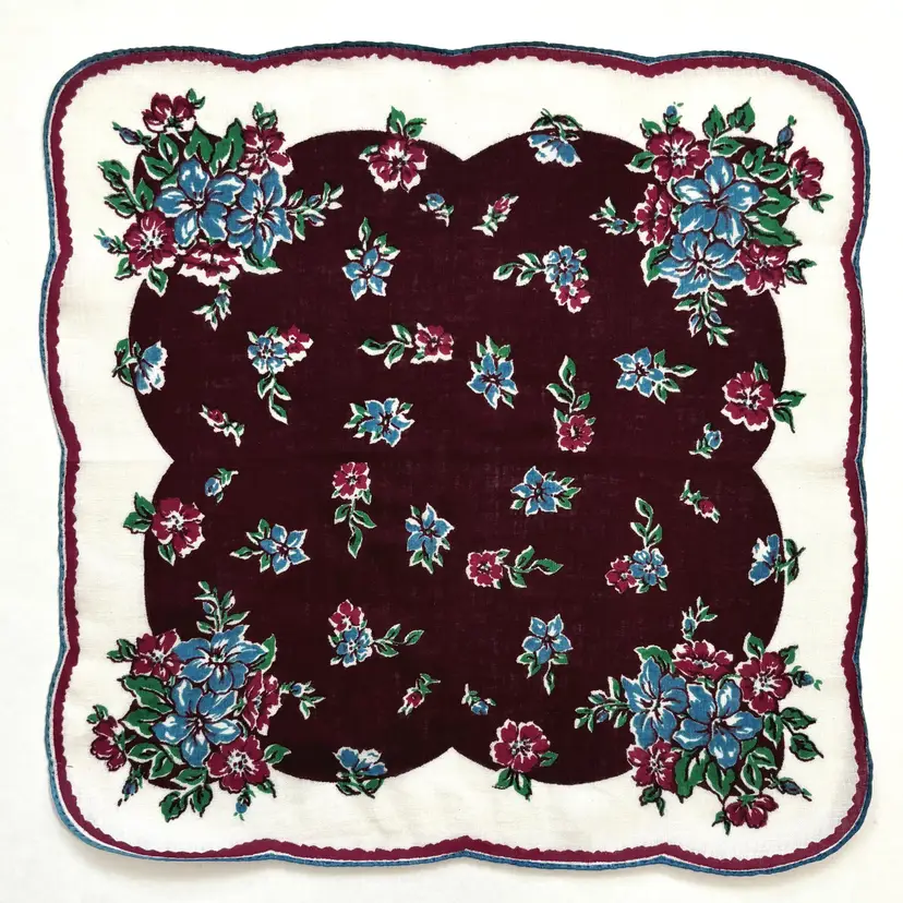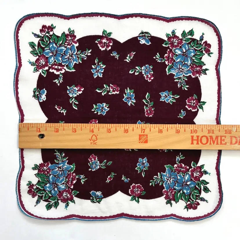 Hand rolled hem, measures approx. 12” x 12”, made of cotton.