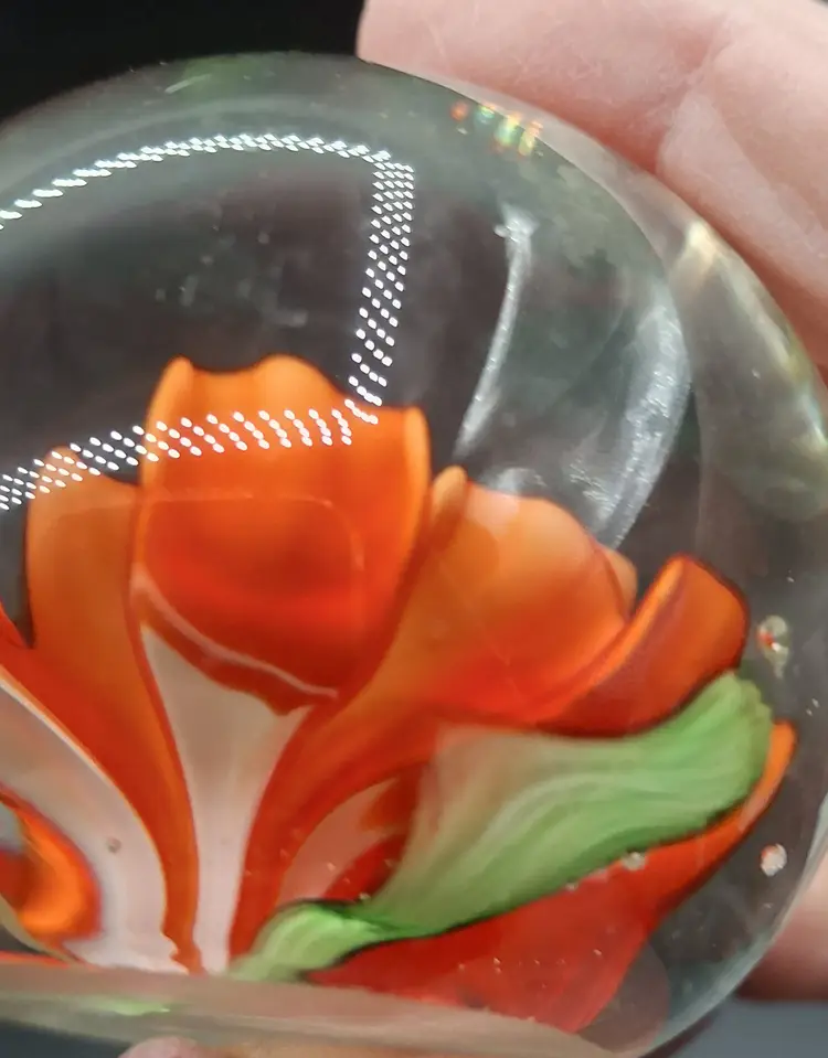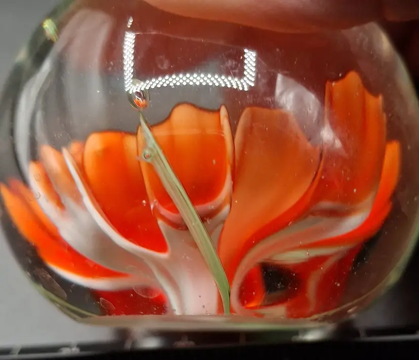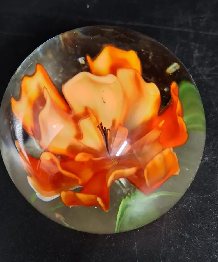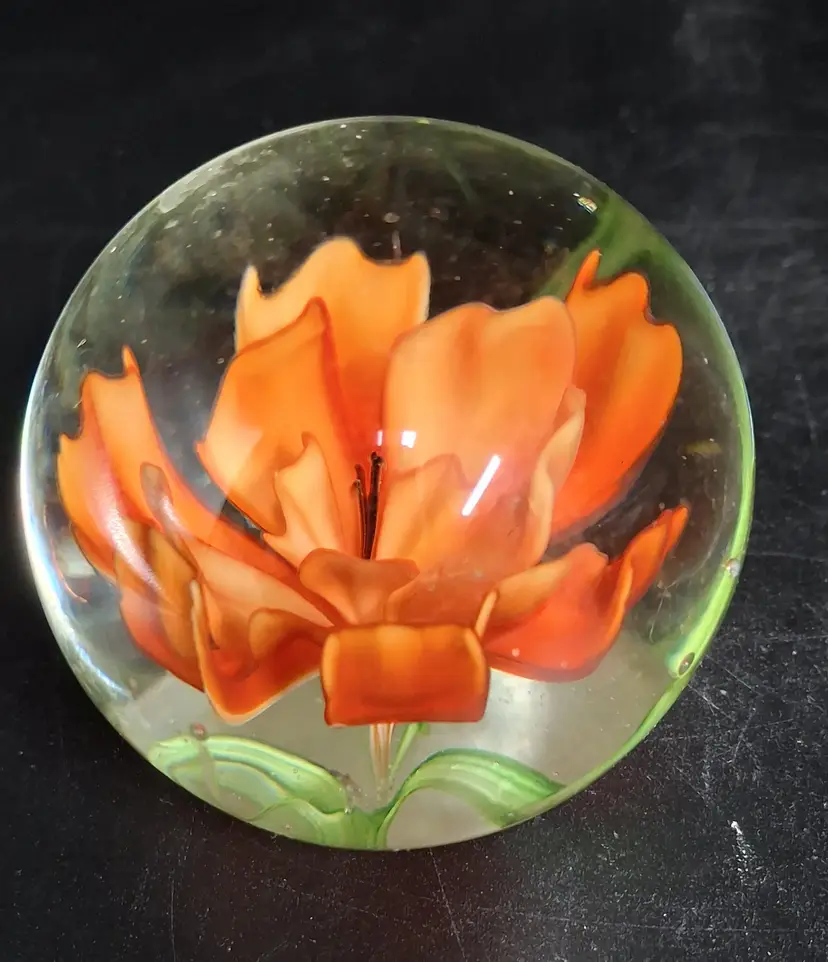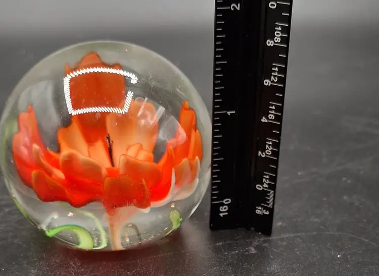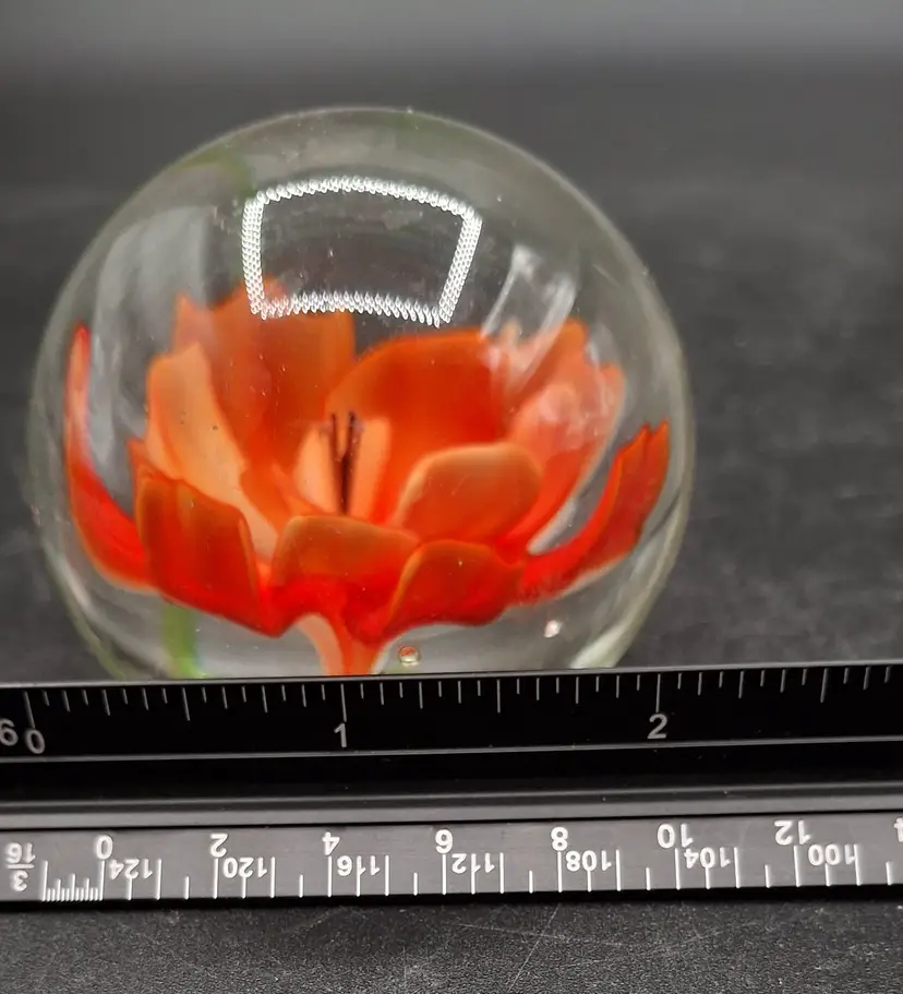 Add a touch of vibrant artistry to your desk, shelf, or display case with this Floral Scarlet Art Glass Paperweight. Encased within the clear glass dome is a beautifully crafted scarlet flower, complete with layered petals and delicate color transitions that give it a lifelike, glowing presence.