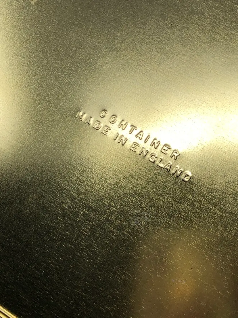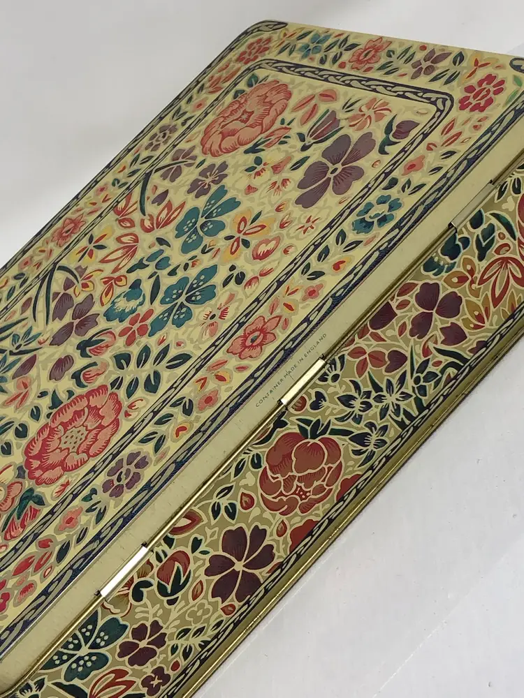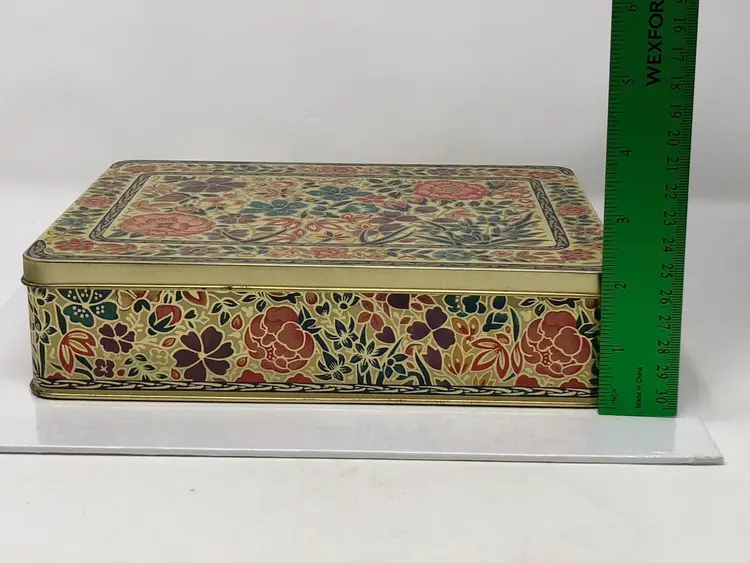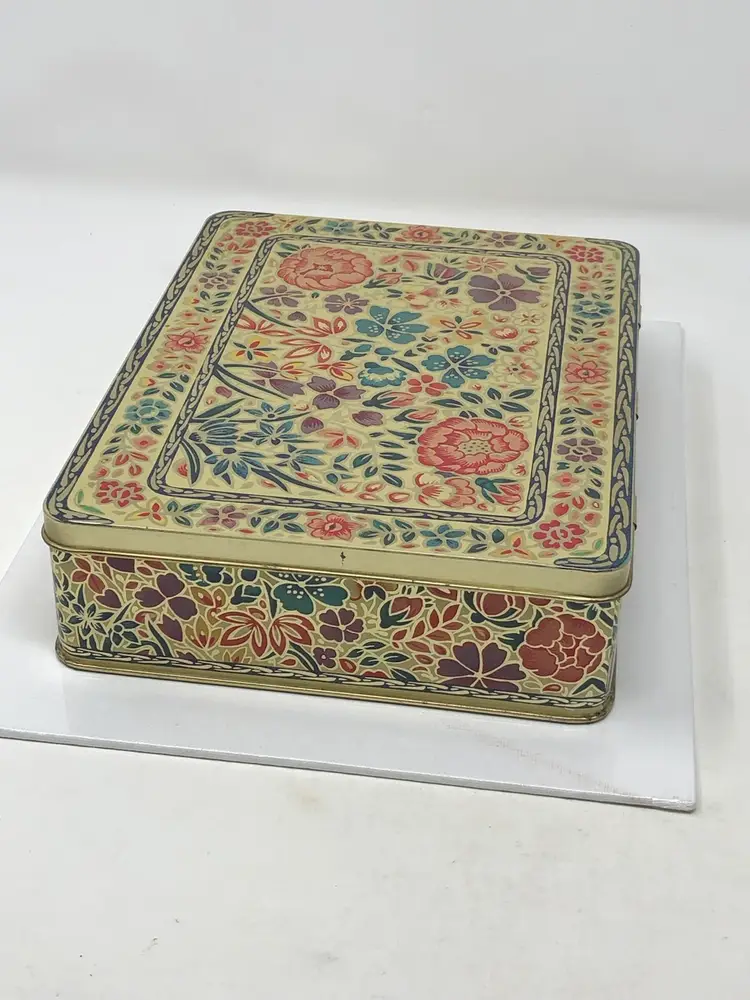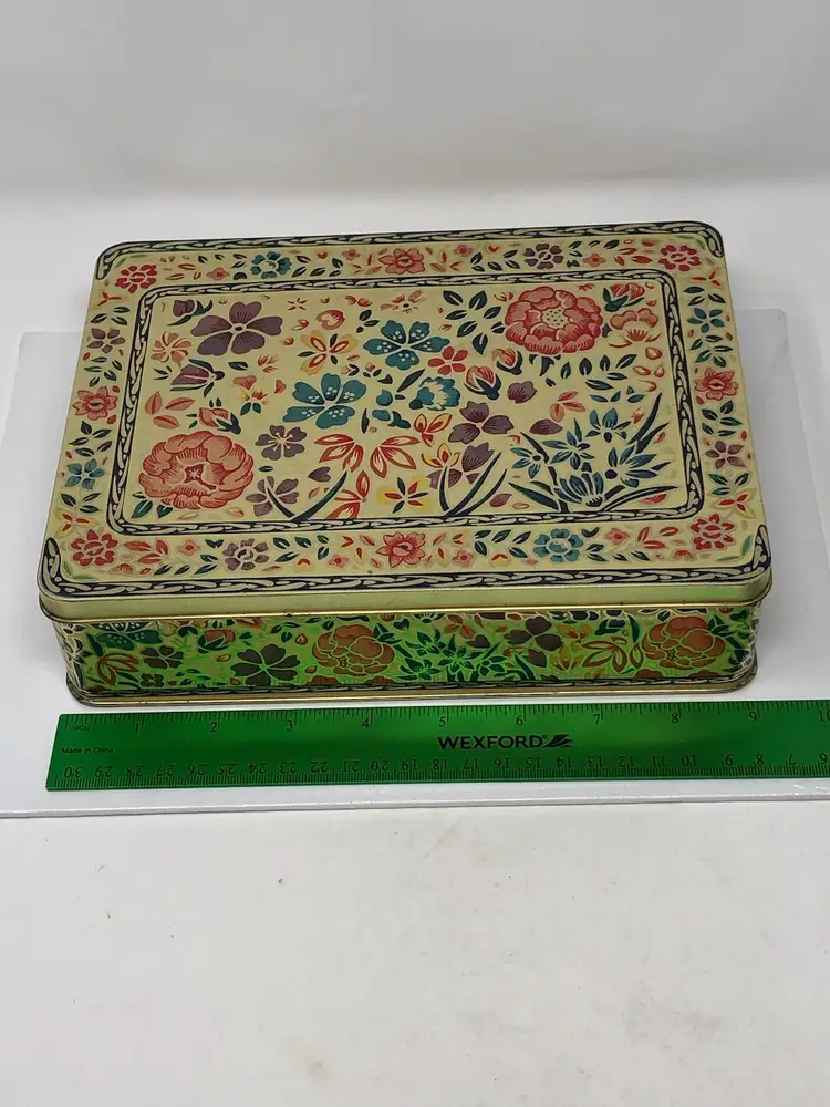 9" x 7" x 2" storage tin with beautiful floral design and hinged lid. Gold tone stamped Container made in England on base. Slight curve in the front panel as shown in photos