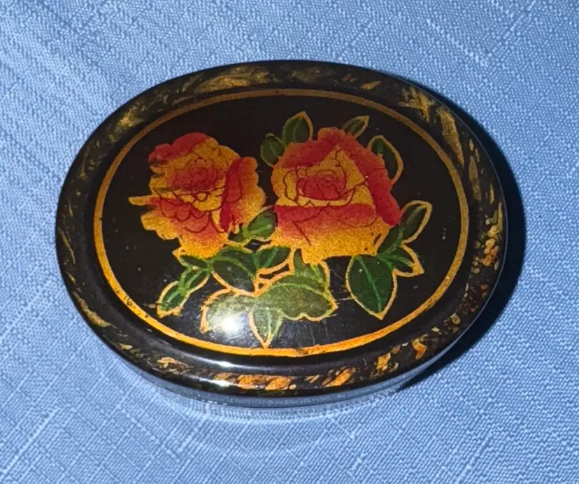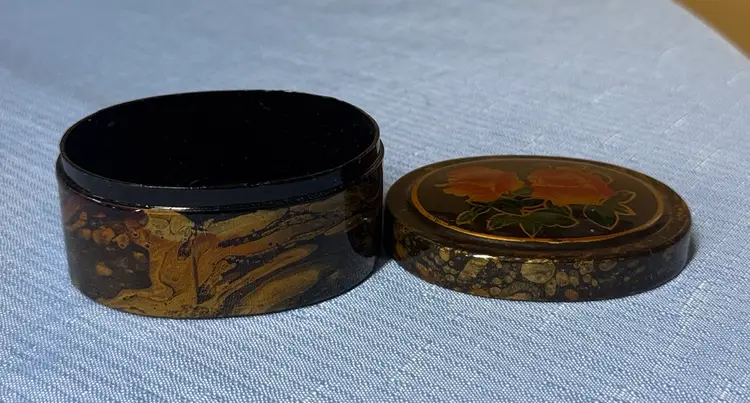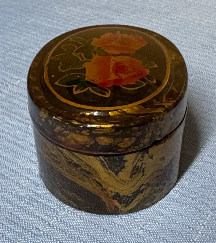 Beautiful vintage decorative box with floral design. Lacquered box Features flowers and a unique marbled pattern. Oval Floral Trinket Jewelry Knick Knack Ring box 3” by 2.25” by 1.5” Excellent condition (221227260)