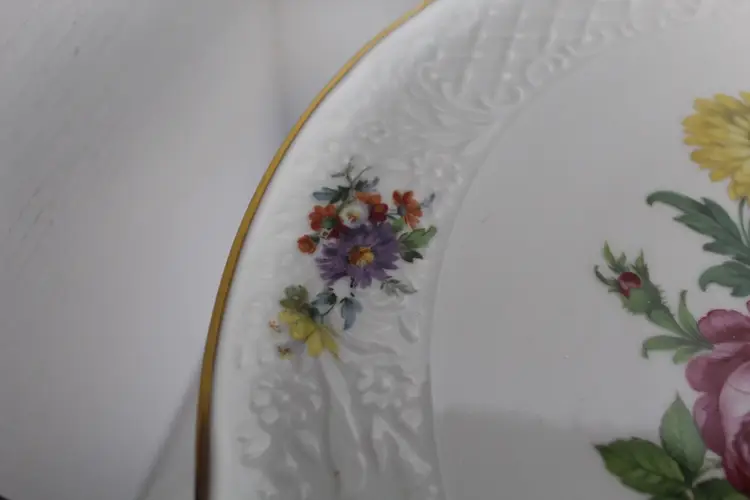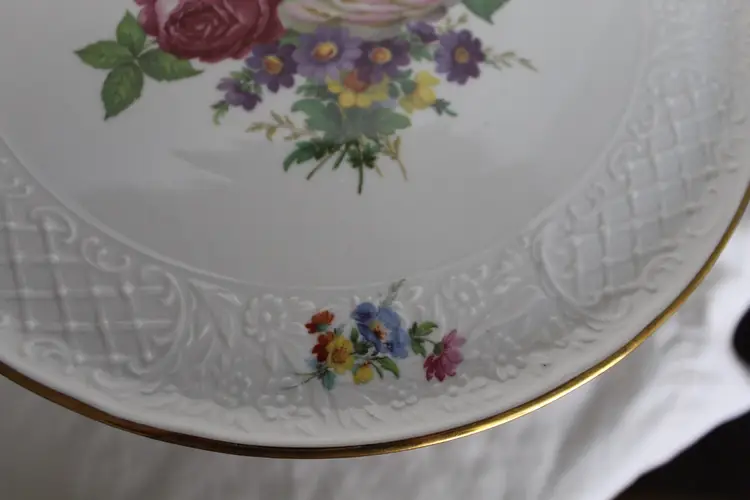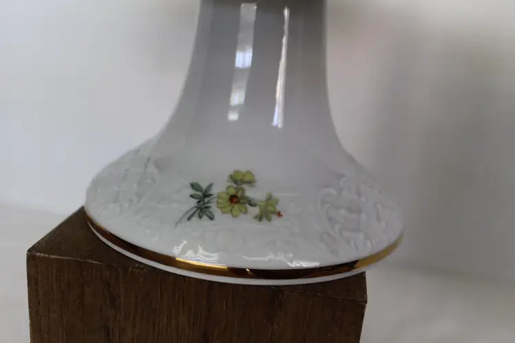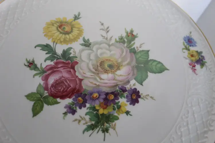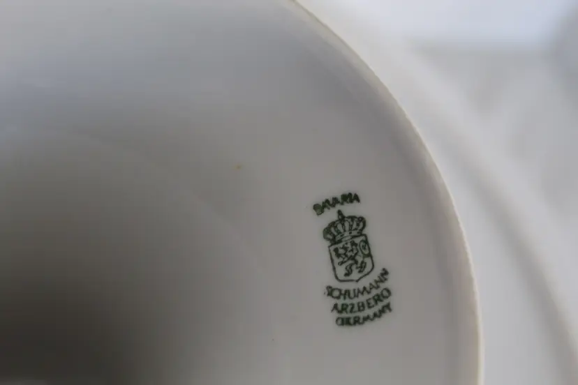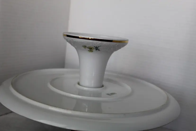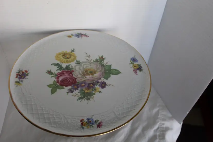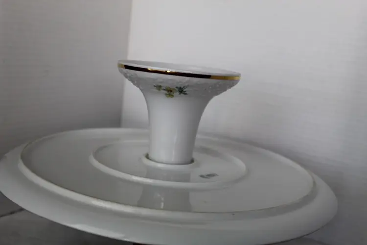 The Floral Pedestal Cake Stand from Schumann Arzberg Germany is a vintage piece perfect for all occasions. Made of porcelain with a glossy finish, this round cake stand features a beautiful multicolor floral pattern, adding a touch of elegance to any tablescape decor. With a diameter of 12 3/8 inches and a height of 4.5 inches, this 1960s piece is a charming addition to your collection, showcasing the art pottery production style of the time period. Made in Bavaria, Germany, this cake stand is a true testament to German craftsmanship and design.