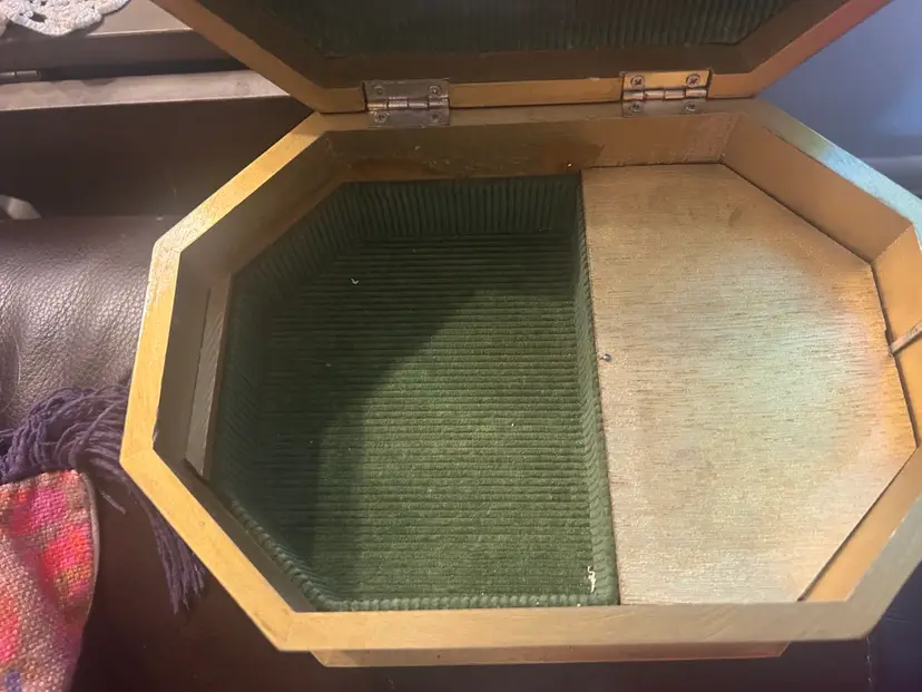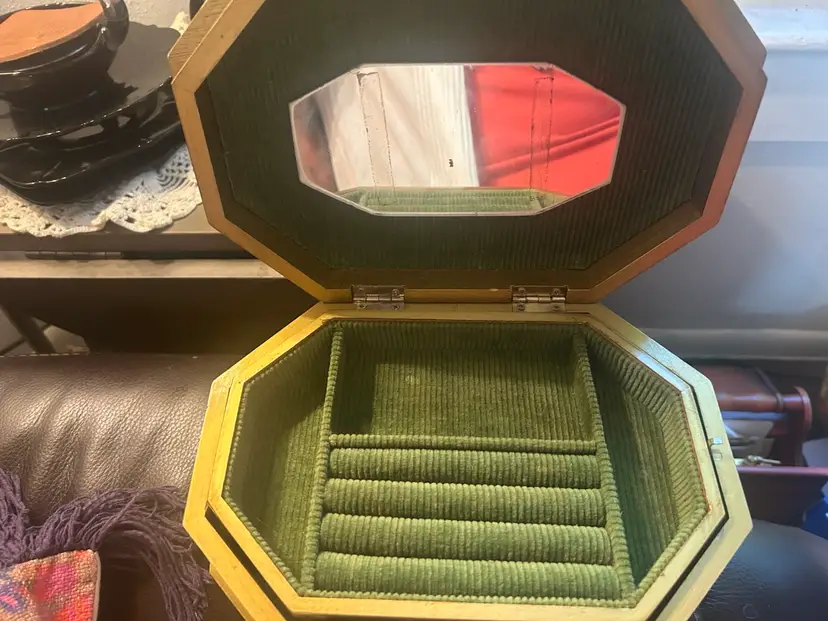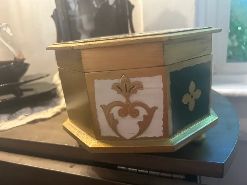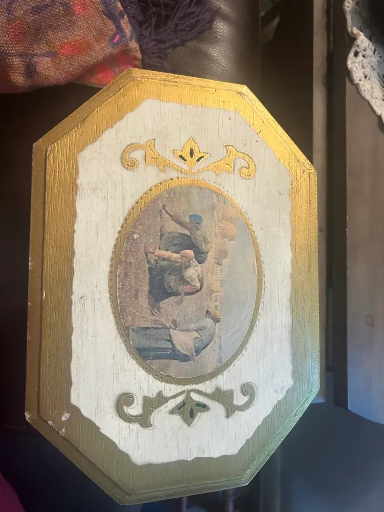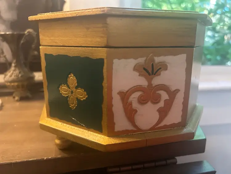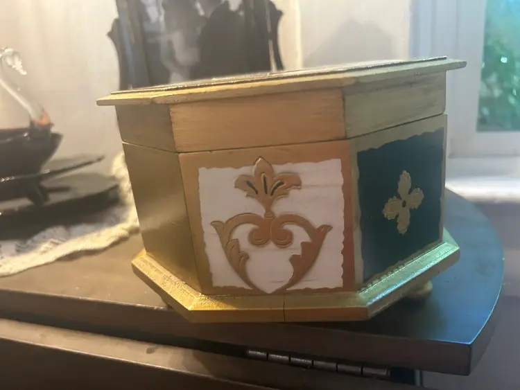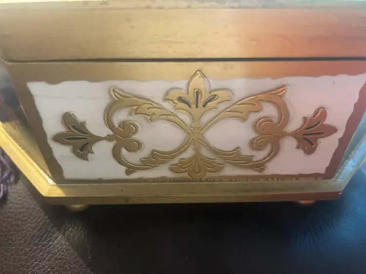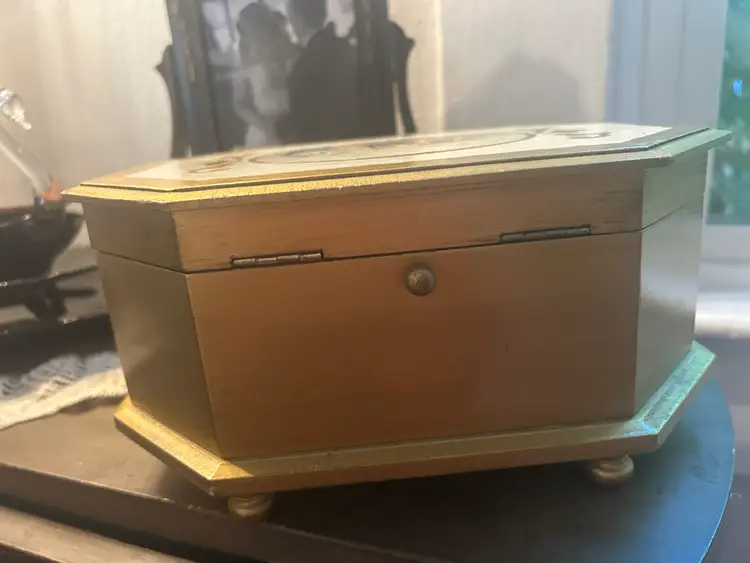 Vntage Florentine-style wooden jewelry or music box, featuring a decoupage image of "The Gleaners wind up music box is in working condition see video