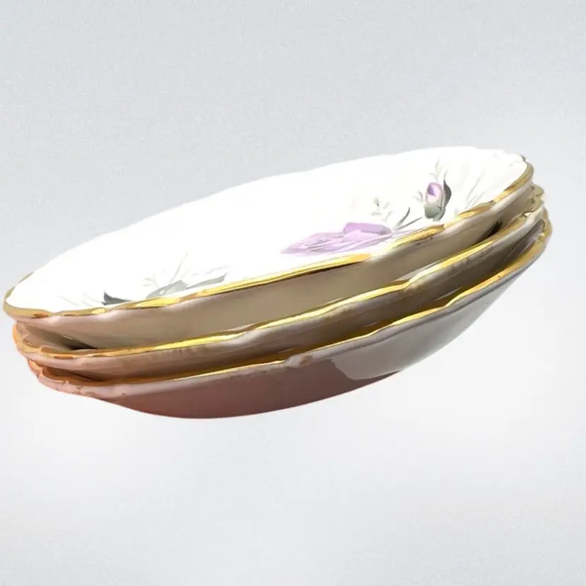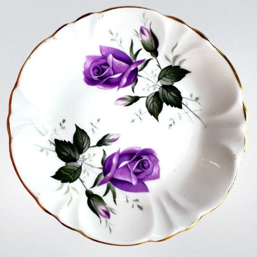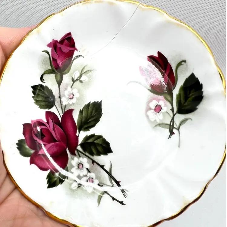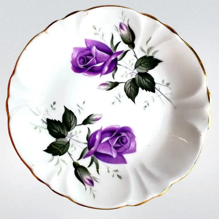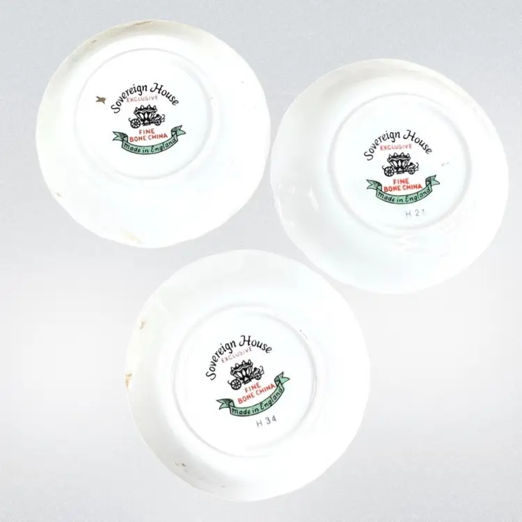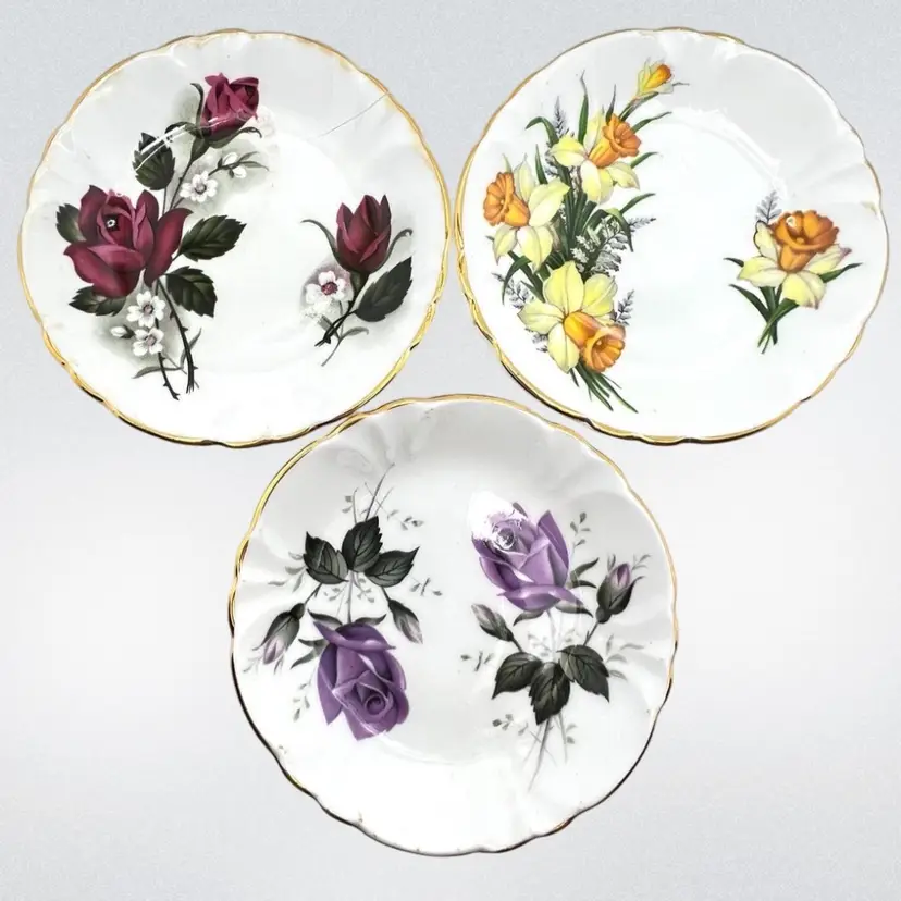 Set of 3 Sovereign House Bone China Plates. Made in England. 3-1/2” diameter. No chips or cracks on the purple and yellow plates. Red rose plate is badly cracked (see photo) but included as part of set. Price reflects reduction based on fatal crack. No guarantee it will arrive intact but we’ll take as much care in shipping it as possible.