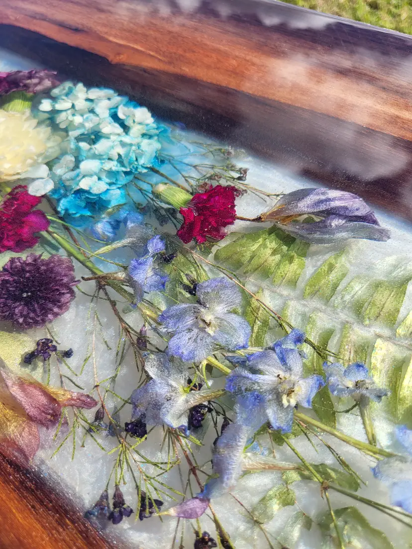 This Walnut table is 16in x 20in, with a lovely arraignment of flowers inlayed in epoxy.
