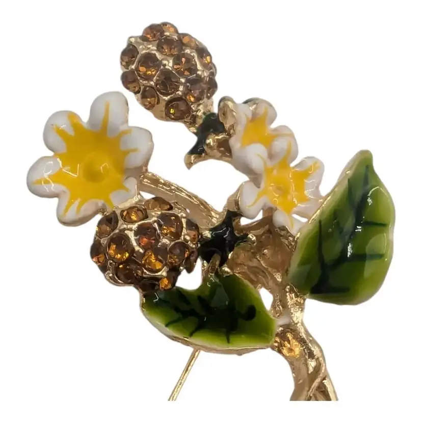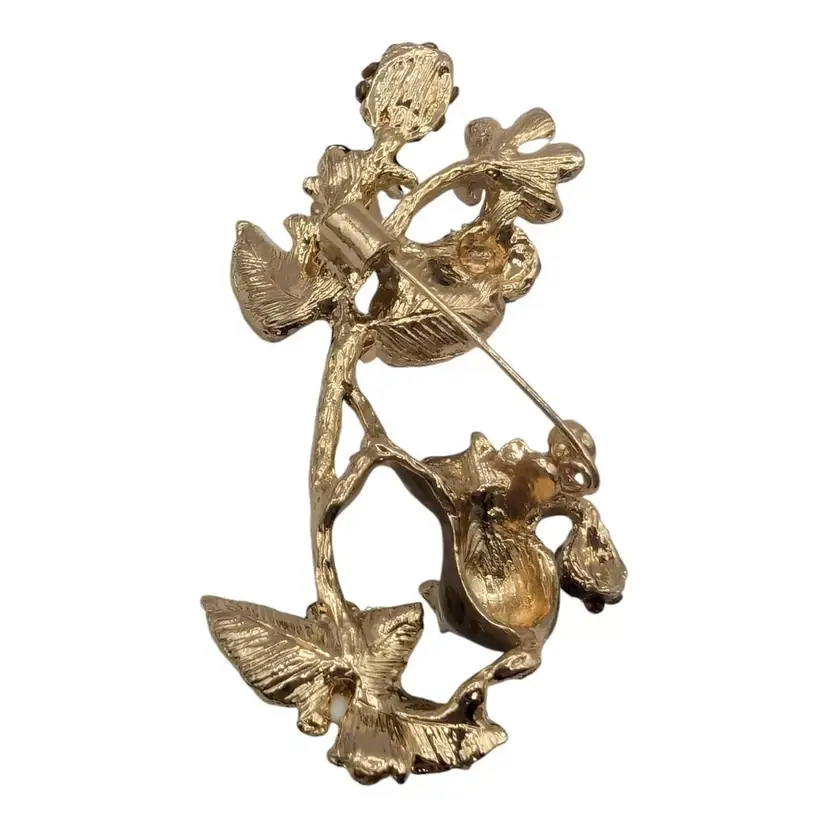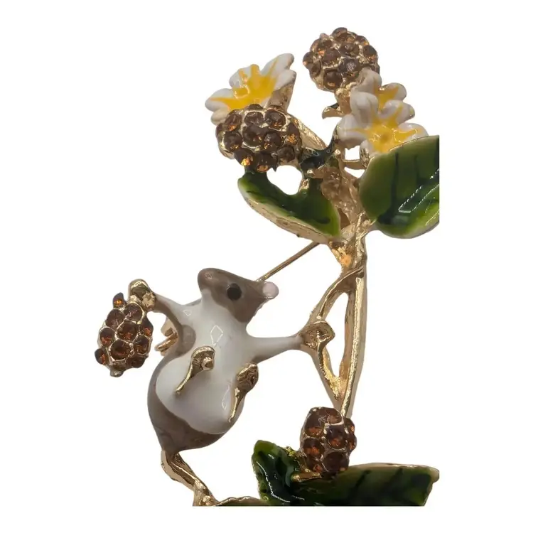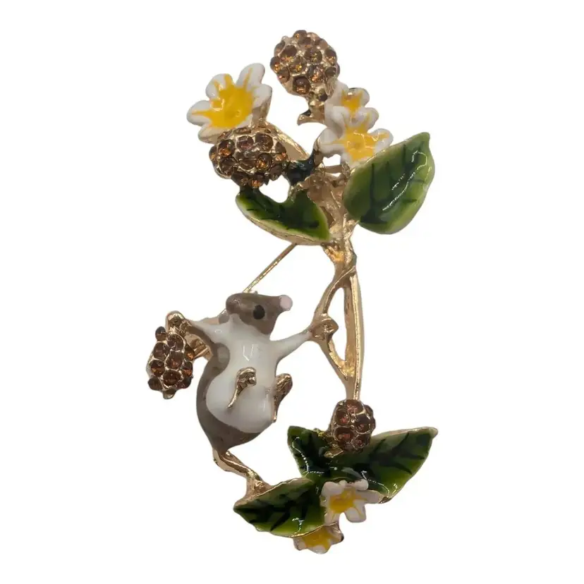 This whimsical brooch tells the story of a curious mouse exploring a bouquet of flowers. Crafted in vibrant enamel, it captures a moment of nature's charm.