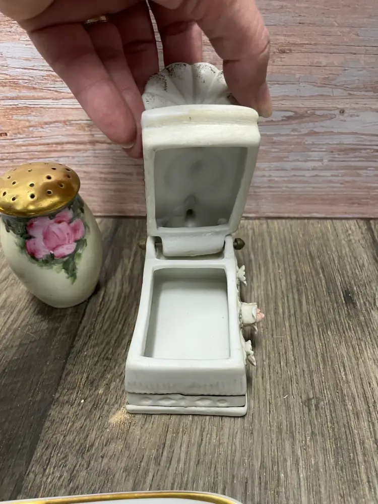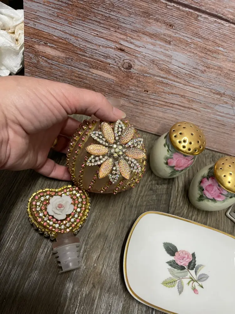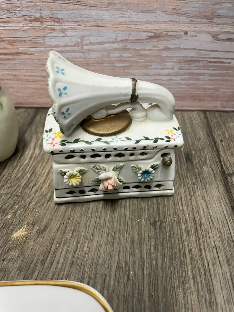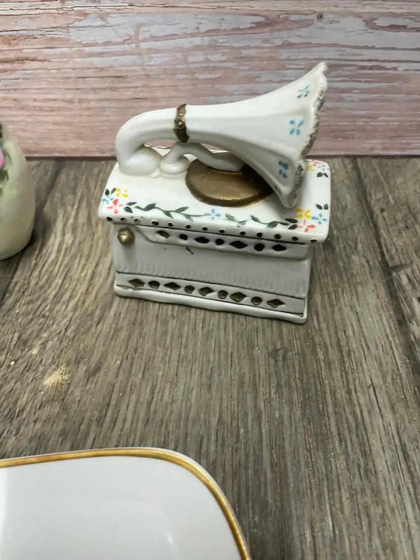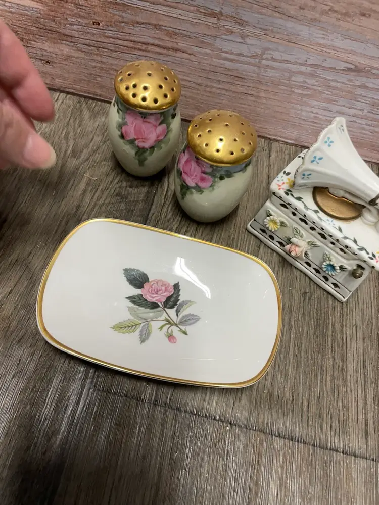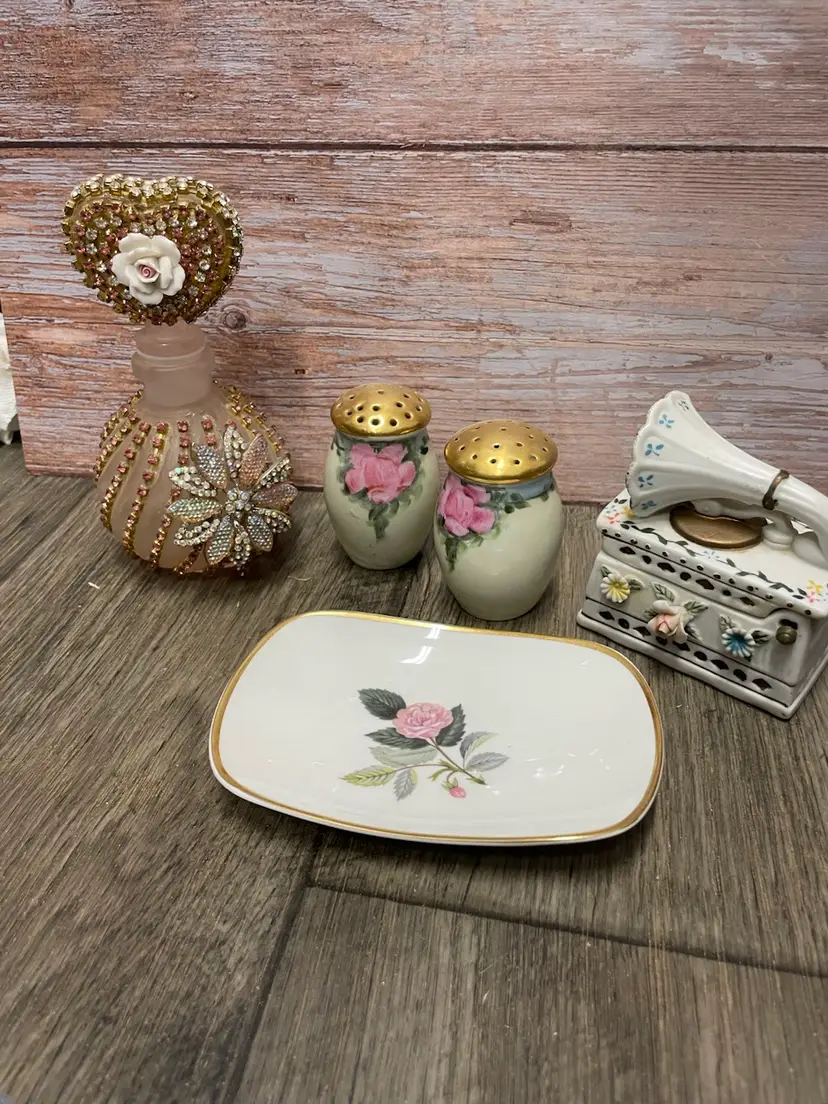 Glass pink perfume bottle decorated with beads and flowers. Made in Germany, salt and pepper shakers with pink flowers and gold top – missing the corks. Wedgewood bone China made in England. Hathaway rose, trinket dish or soap dish. Phonograph Made in Taiwan trinket box with flowers