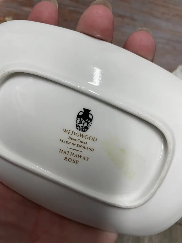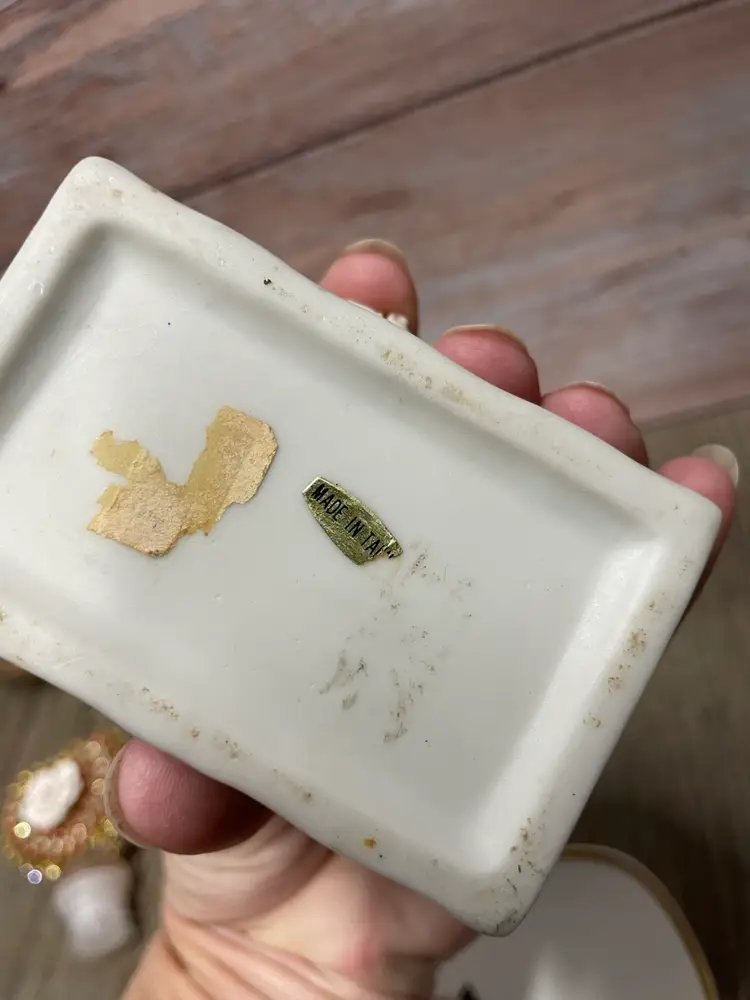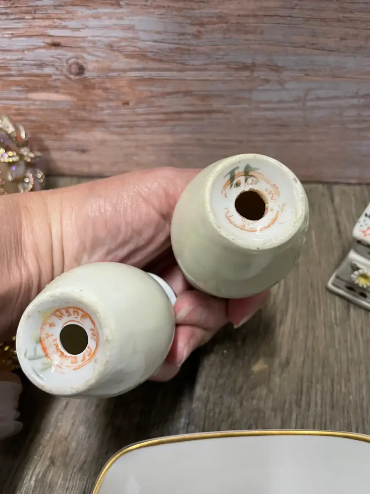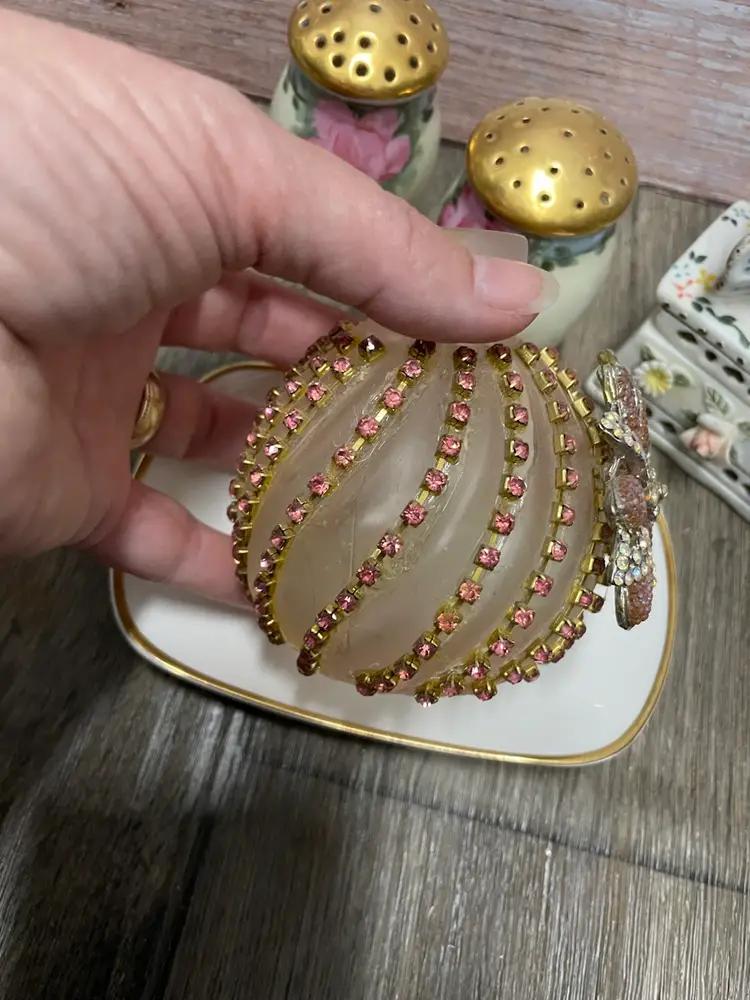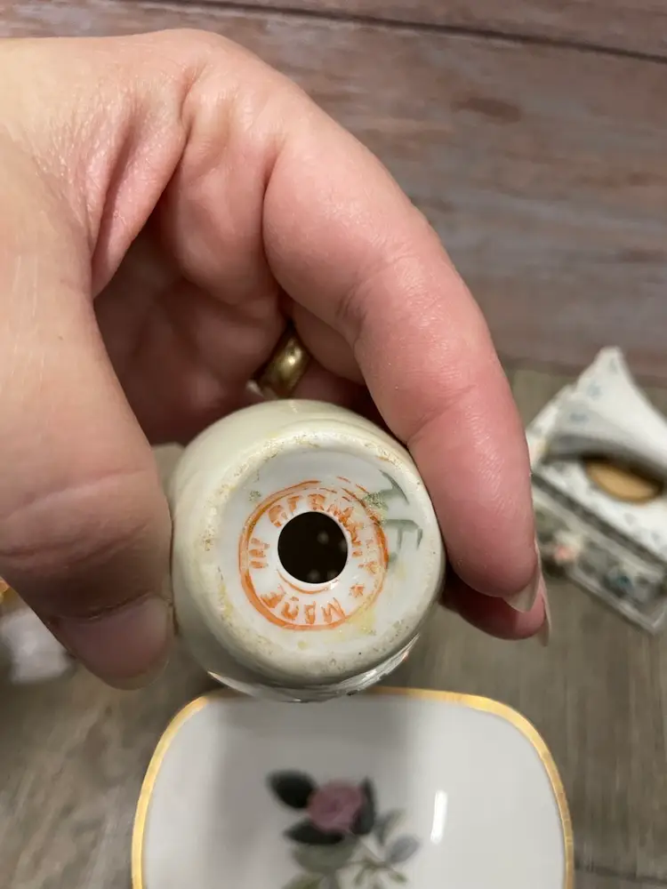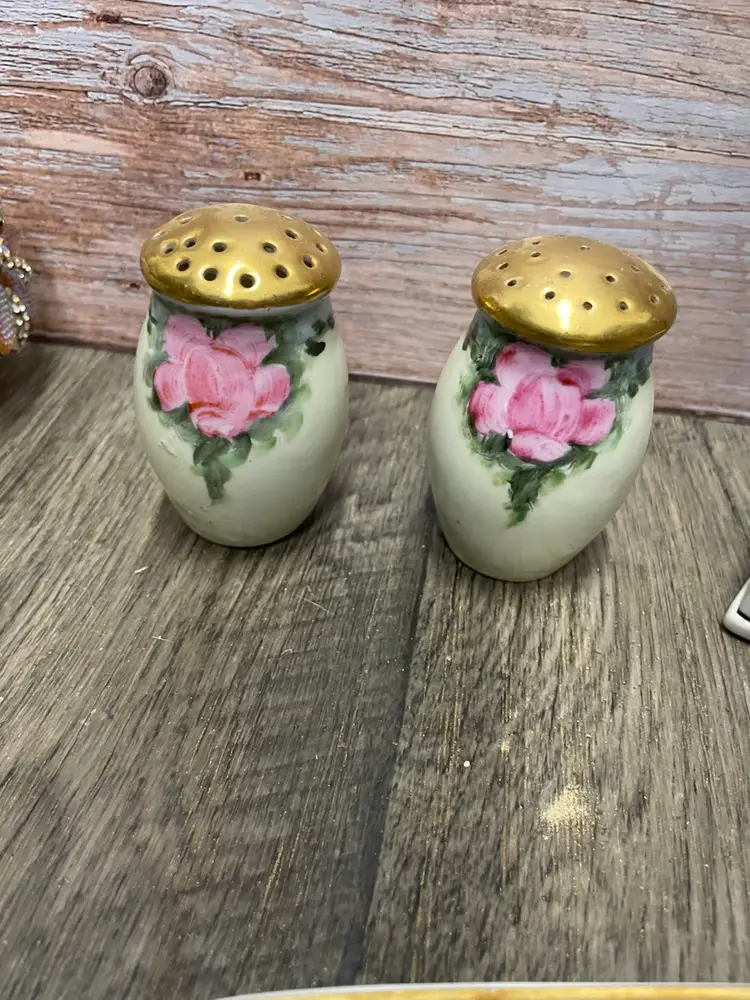Glass pink perfume bottle decorated with beads and flowers. Made in Germany, salt and pepper shakers with pink flowers and gold top – missing the corks. Wedgewood bone China made in England. Hathaway rose, trinket dish or soap dish. Phonograph Made in Taiwan trinket box with flowers