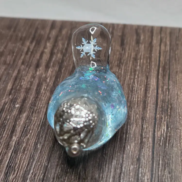 She is made with a seed bead beak, a silver toned filigree bead that came off of a necklace. It reminded me of icy cold winters. Her wings and tailfeather has snowflake accents and her center has sparkle like you see when the sun shines on the snow.