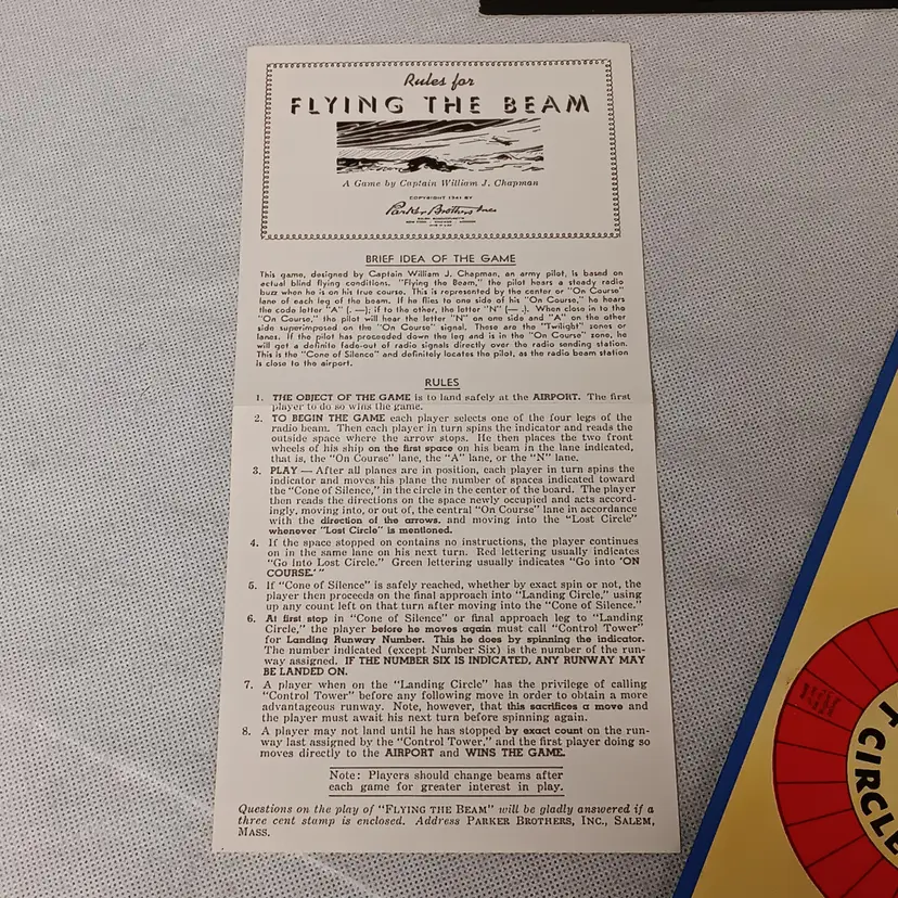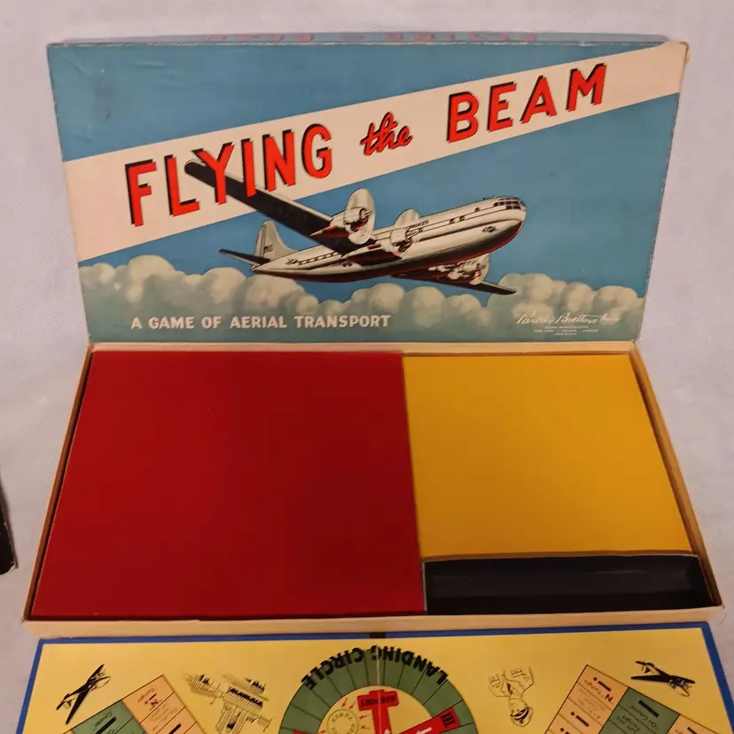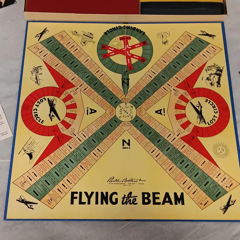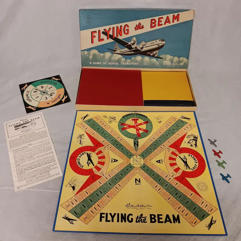 Vintage Board Game Complete Flying The Beam A Game of Aerial Transport Parker Brothers Inc 1941 Complete For 2-4 Players Includes Game Board 4 Metal Die Cast Planes Spinner Rules With Original Box 18.25" x 9.5" x 1.5" Good Condition One Plane Does Have Broken Tail Wing Piece Included See Pictures A RARE Estate Find Thank You For Looking