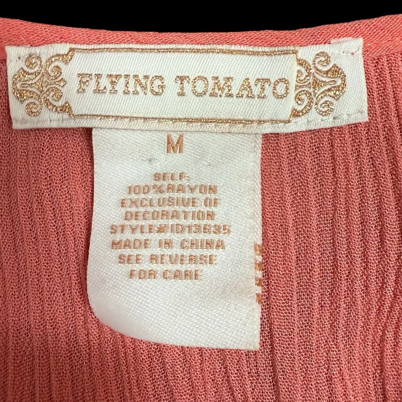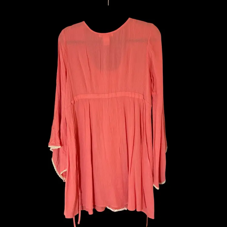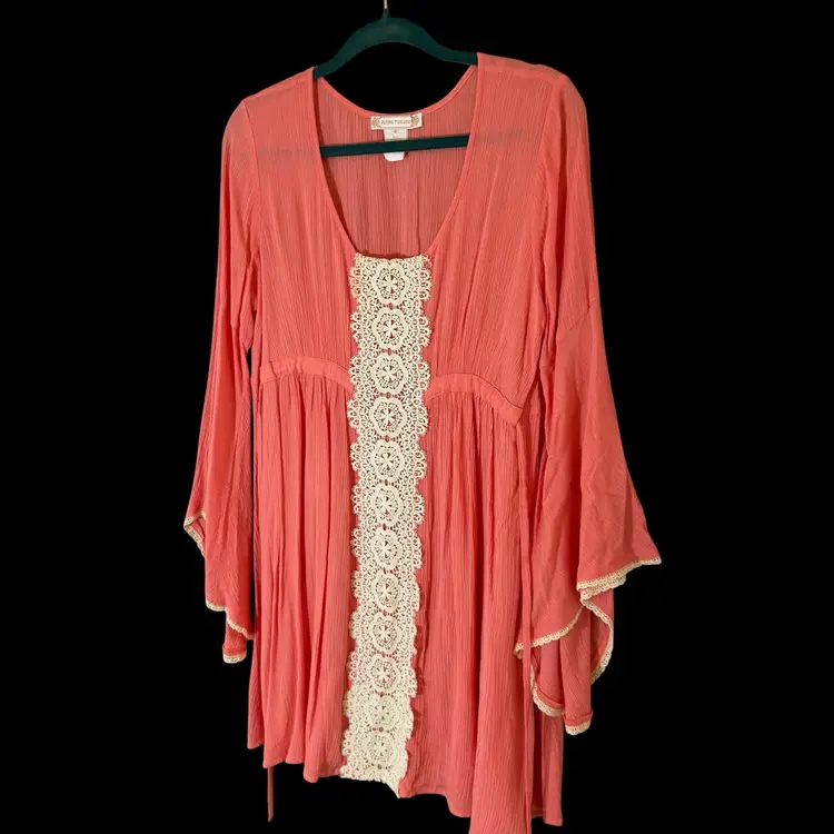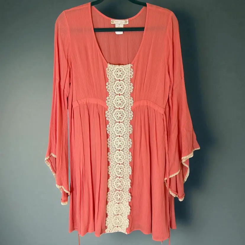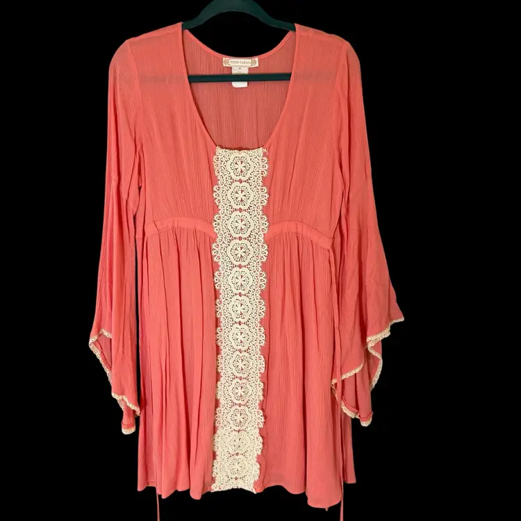 The Flying Tomato Boho Bell Sleeve Tunic Dress is a stylish and comfortable option for women looking for a unique addition to their wardrobe. This peach-colored dress or tunic top features a geometric embroidered crochet lace front panel, a scoop neckline, and flowy bell sleeves, giving it a bohemian and hippie-inspired look. Made from lightweight rayon chiffon fabric, this dress is perfect for travel, parties, or casual wear during the summer, fall, or spring seasons. The semi-sheer design and front and back ties add a touch of flair to this mini dress, making it a versatile and eye-catching choice for any occasion.