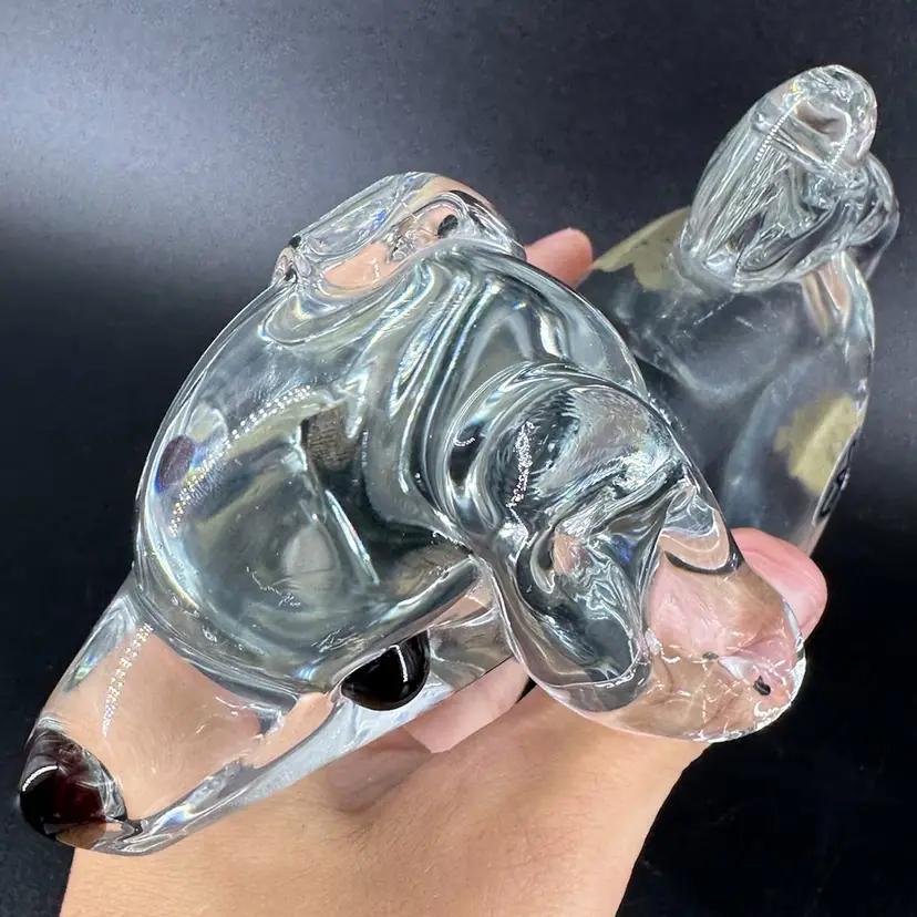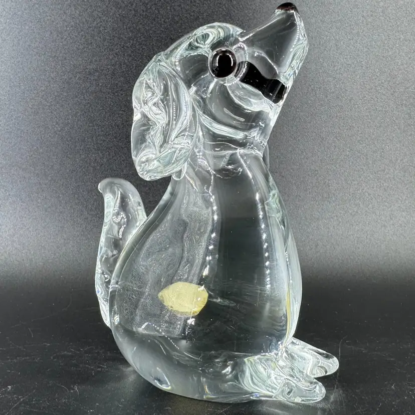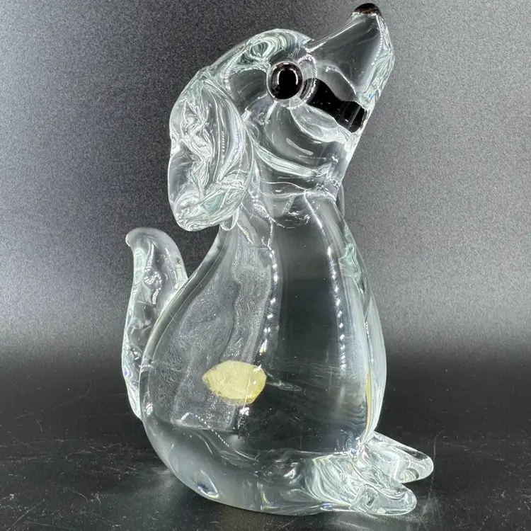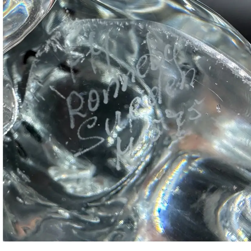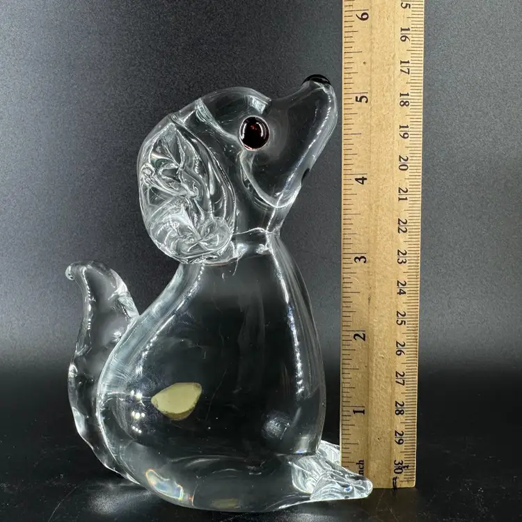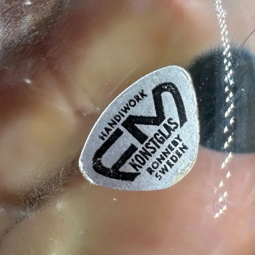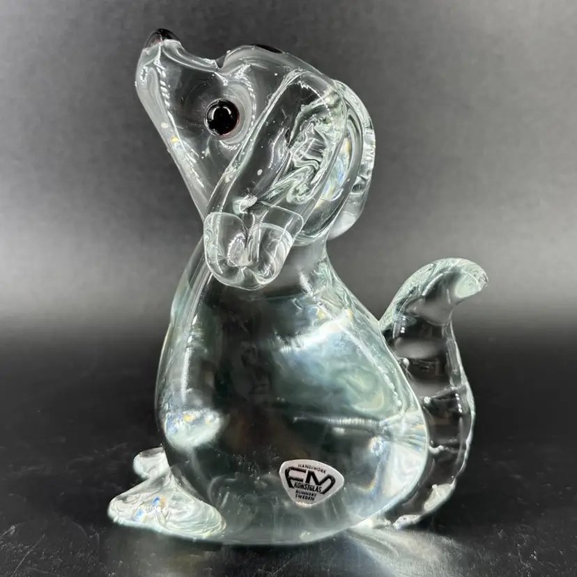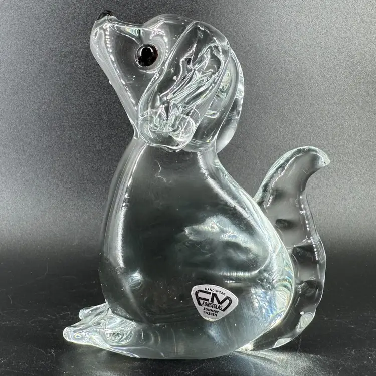 This FM Konstglas dog figurine has brown nose and eyes. There are NO chips or cracks anywhere. It is marked with a sticker that says (Handwork FM Konstglas Ronneby Sweden) does also have a signature on the bottom that says “FM Ronneby Sueden” can be seen in the pictures