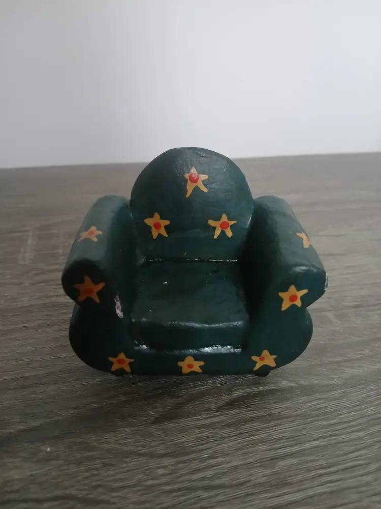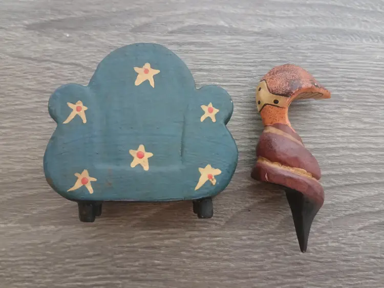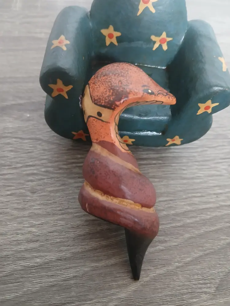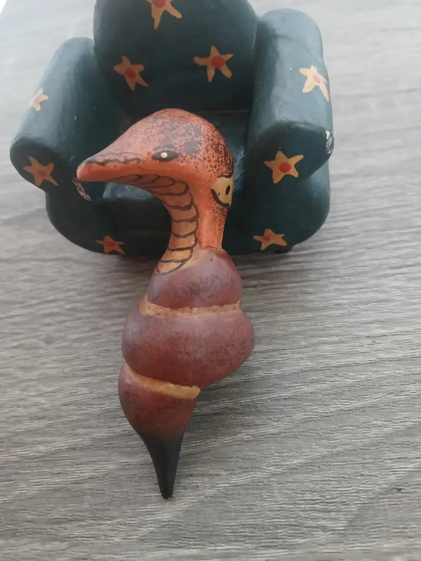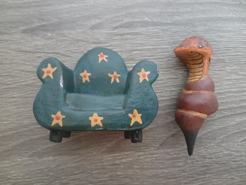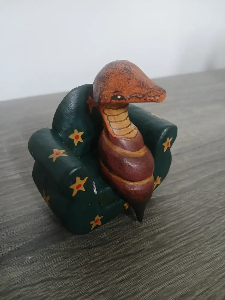It's a cobra on a chair! Fun handpainted folk art animal figurine sitting on an occasional chair. The handmade wooden snake (looks like a cobra to me) is carved so that it nestles nicely on the chair. This figurine adds a unique and whimsical touch to any collection. Measures 2.75" long x 2.5" high. See my other ads for fun animals on couches!