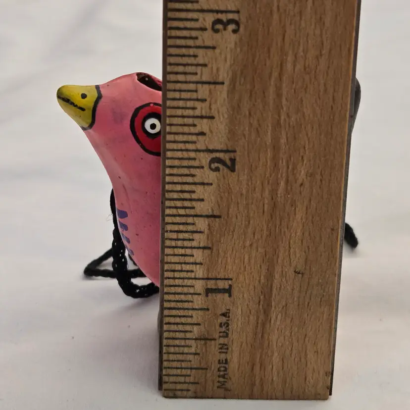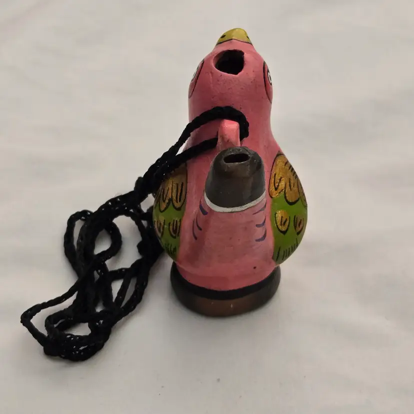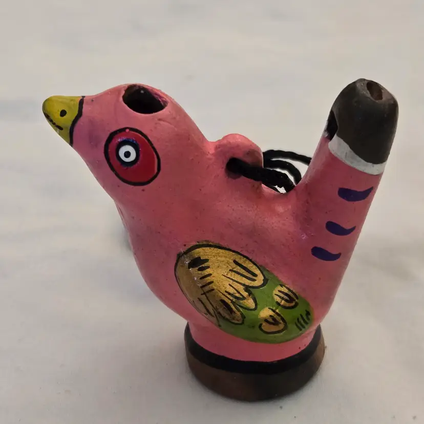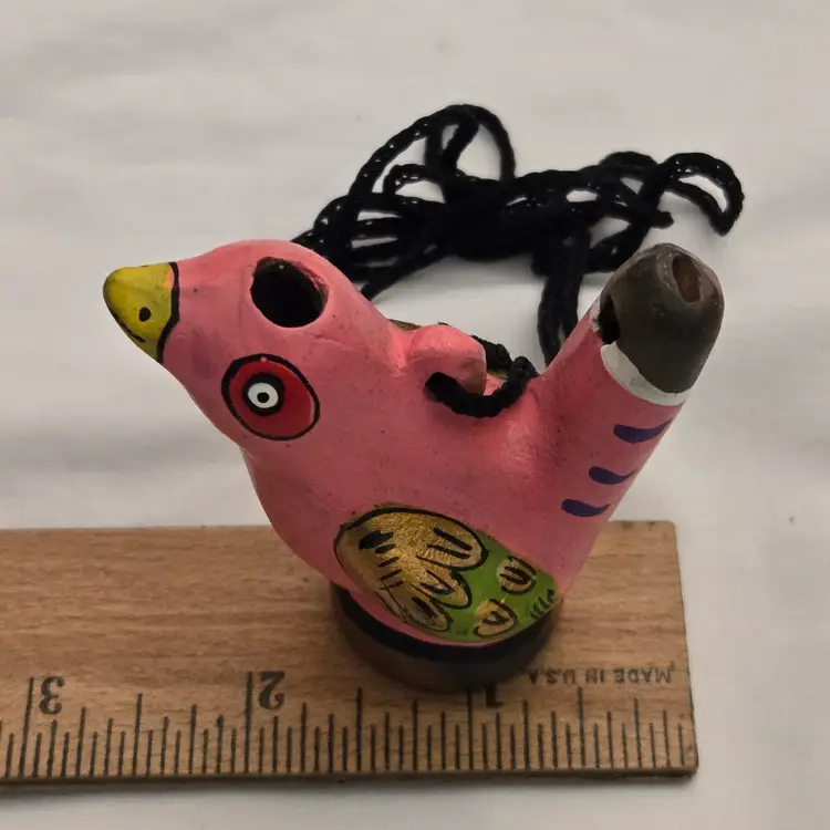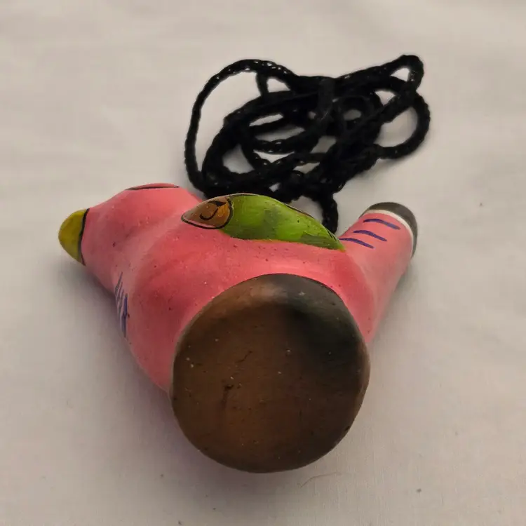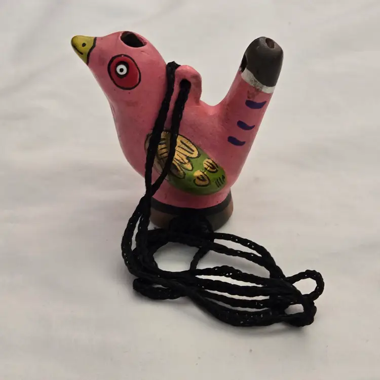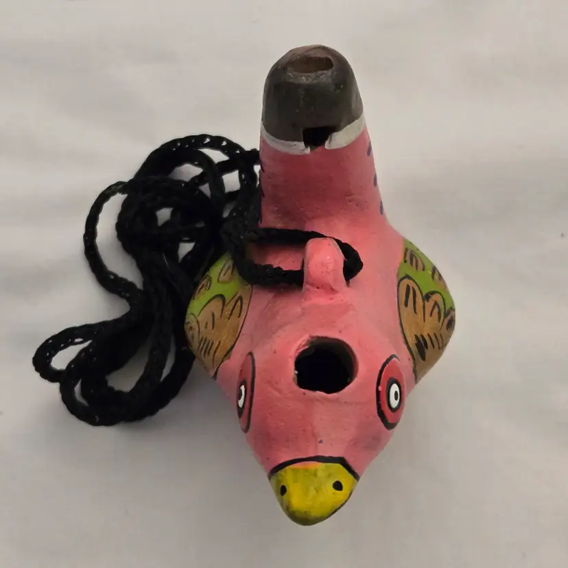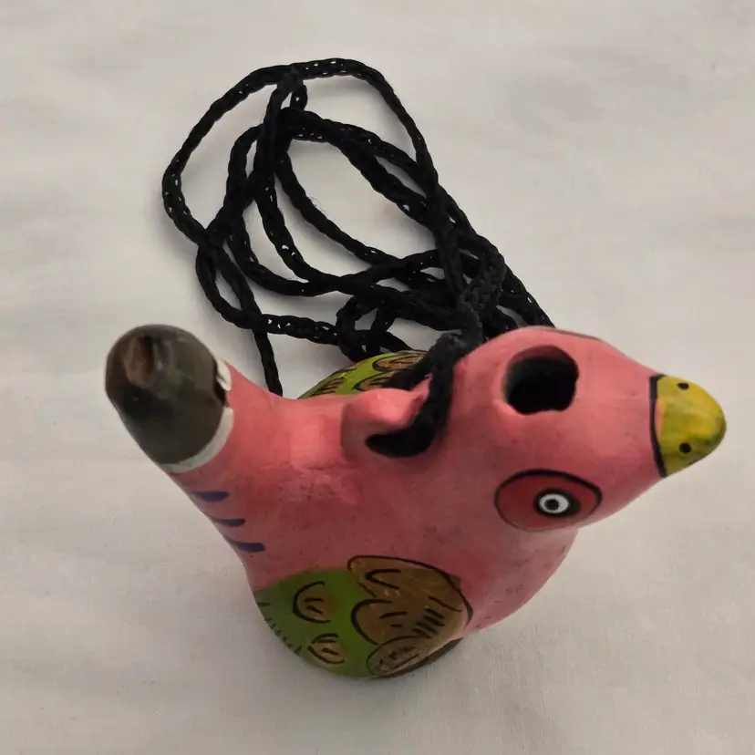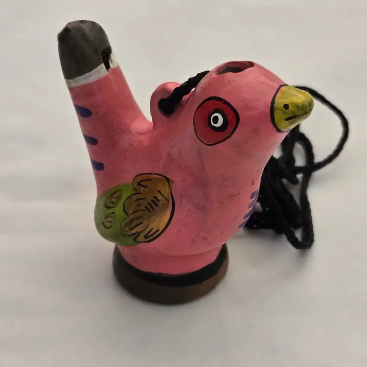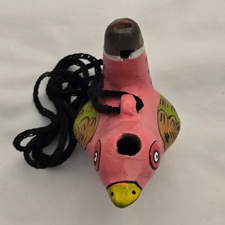 Folk Art Bird Whistle Ocarina Hand Painted Ceramic Pink Multicolored Figurine Musical Toy with string made in Mexico. Used condition with scratches, dirt, stains. Please view all the photos and please ask any questions prior to purchase when possible.