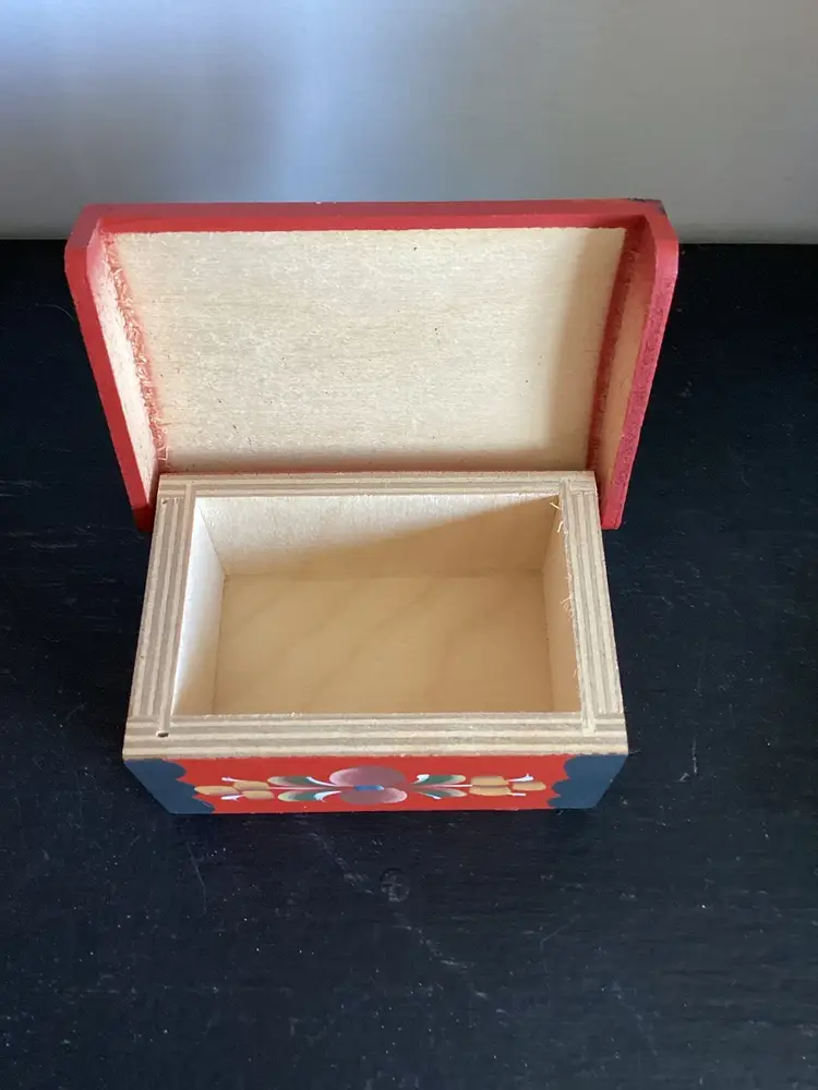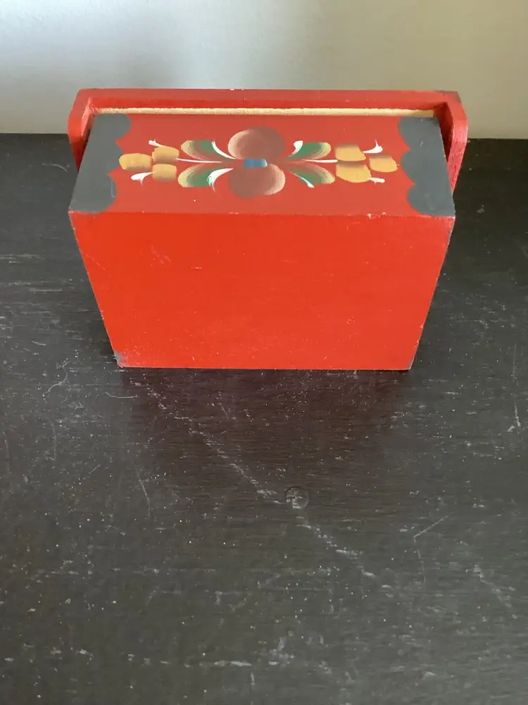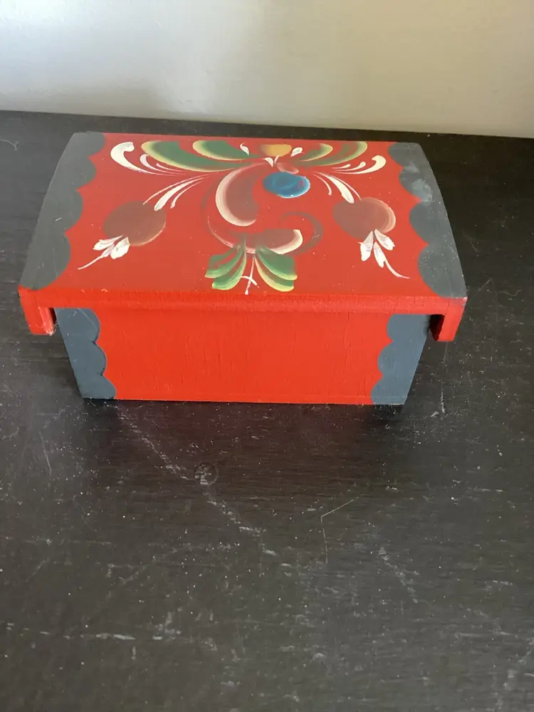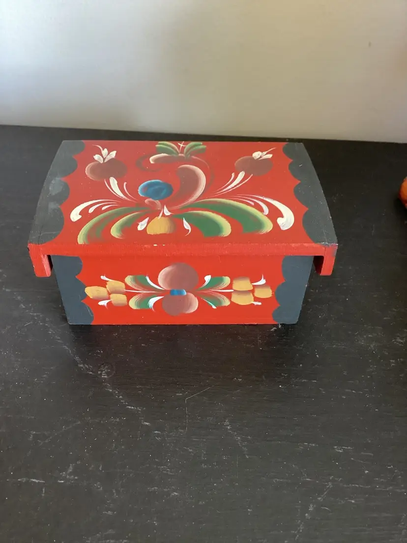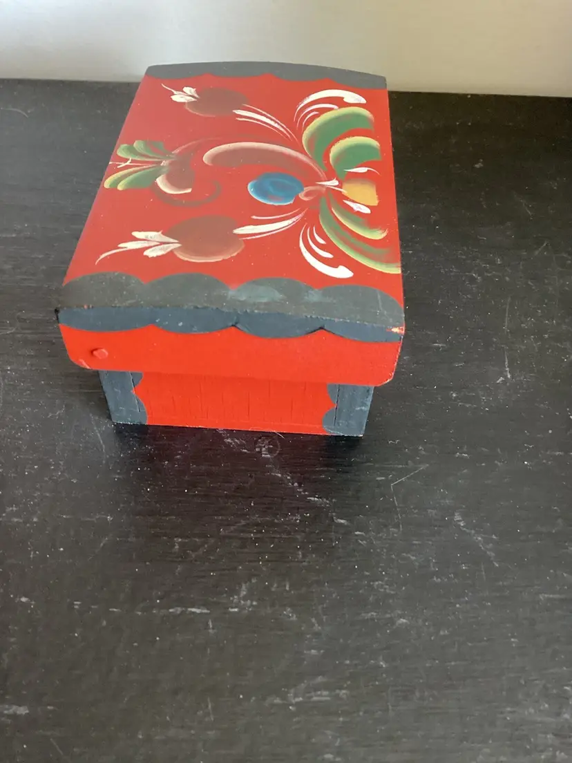 Hand painted folk art box. Some wear in the paint but good graphics.