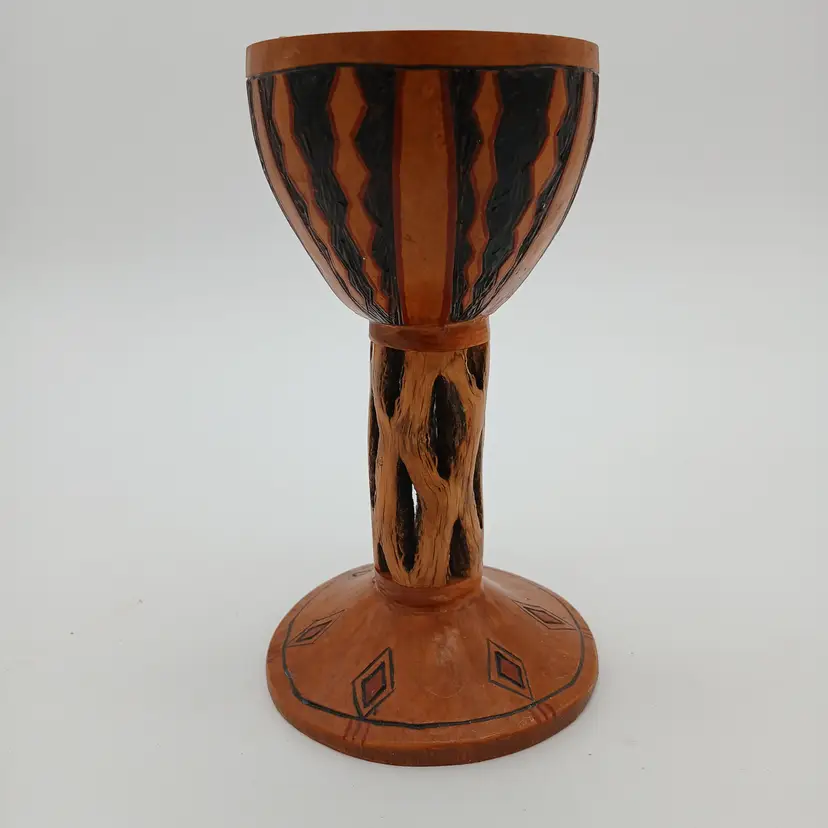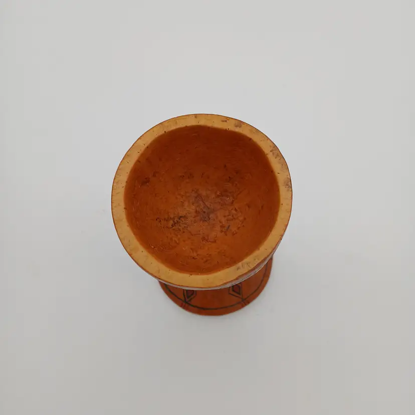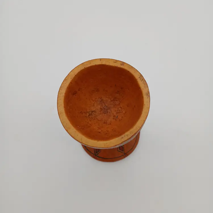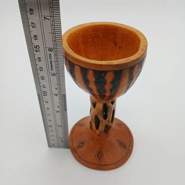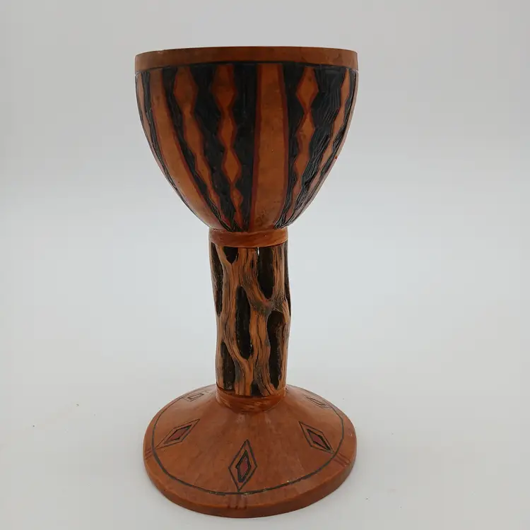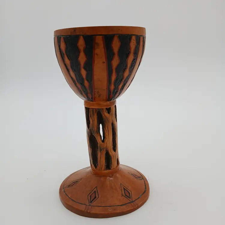 I am not sure of the materials used but this looks like a squash/gourd carving. About 6" tall.