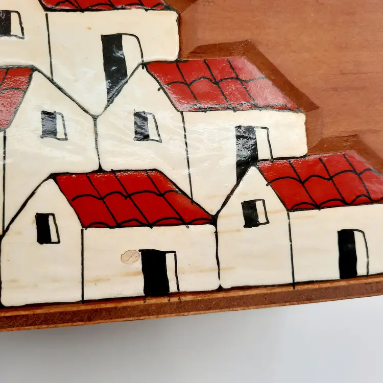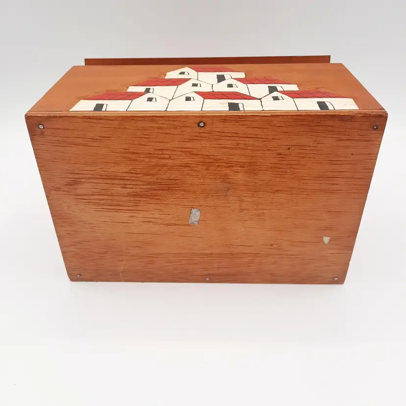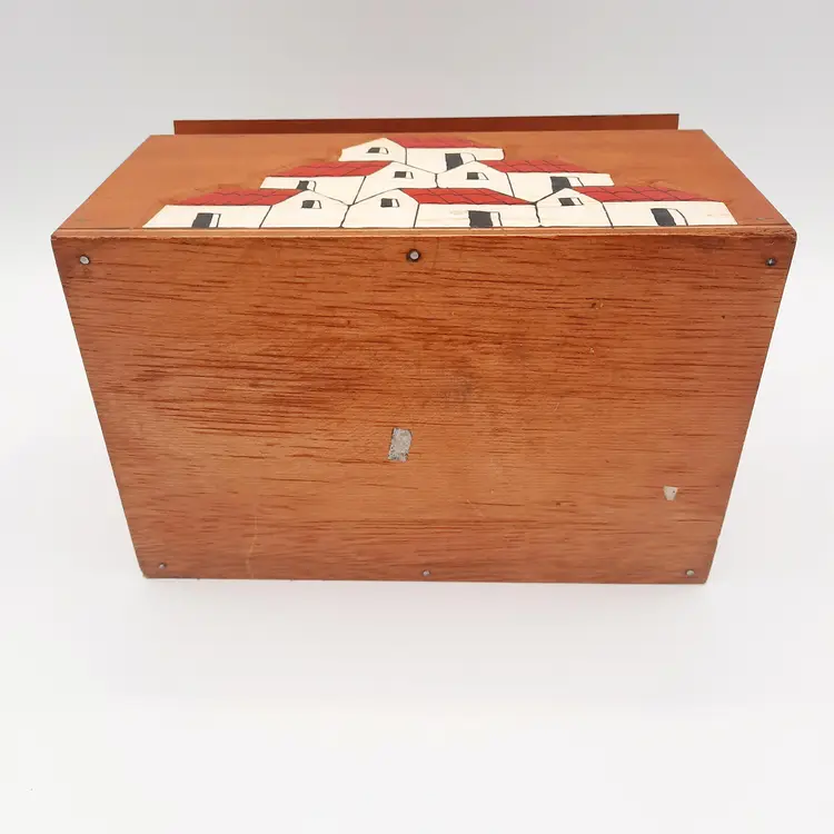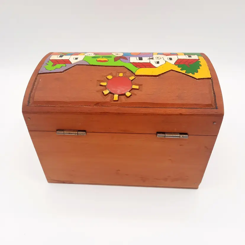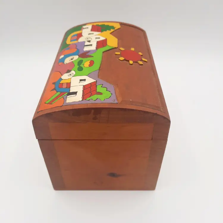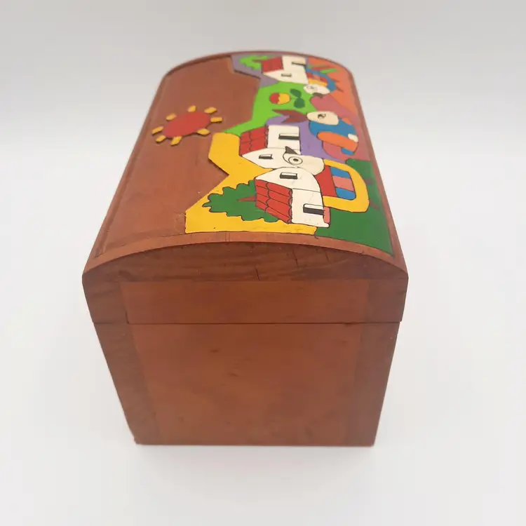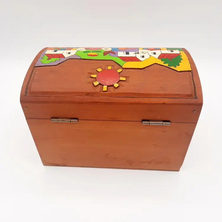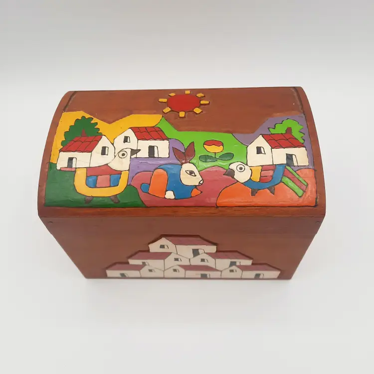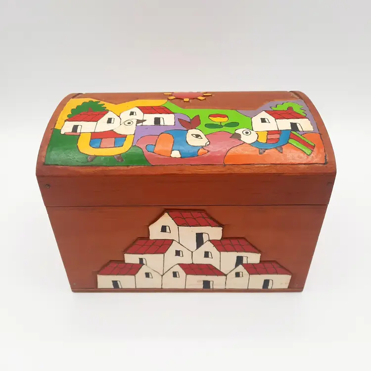 Fun bright colors on this 4 1/2"H x 6 1/2"L x 4 1/4"W handpainted box, has some light wear and a few blemishes in finish.