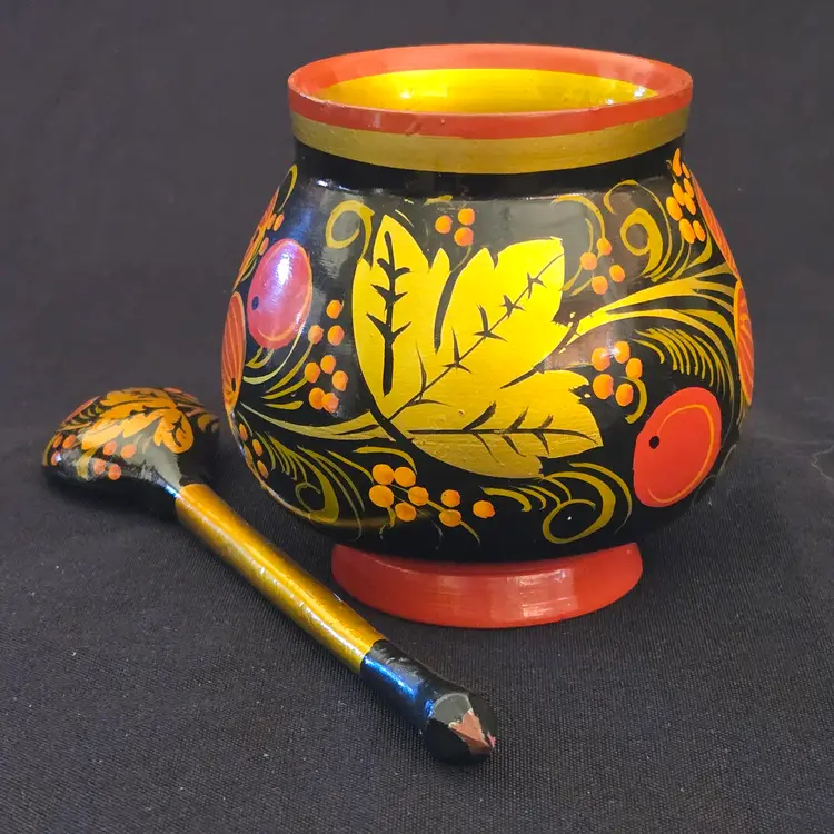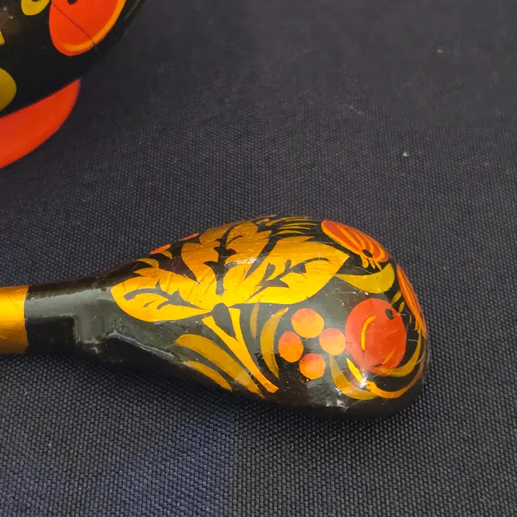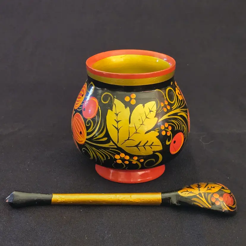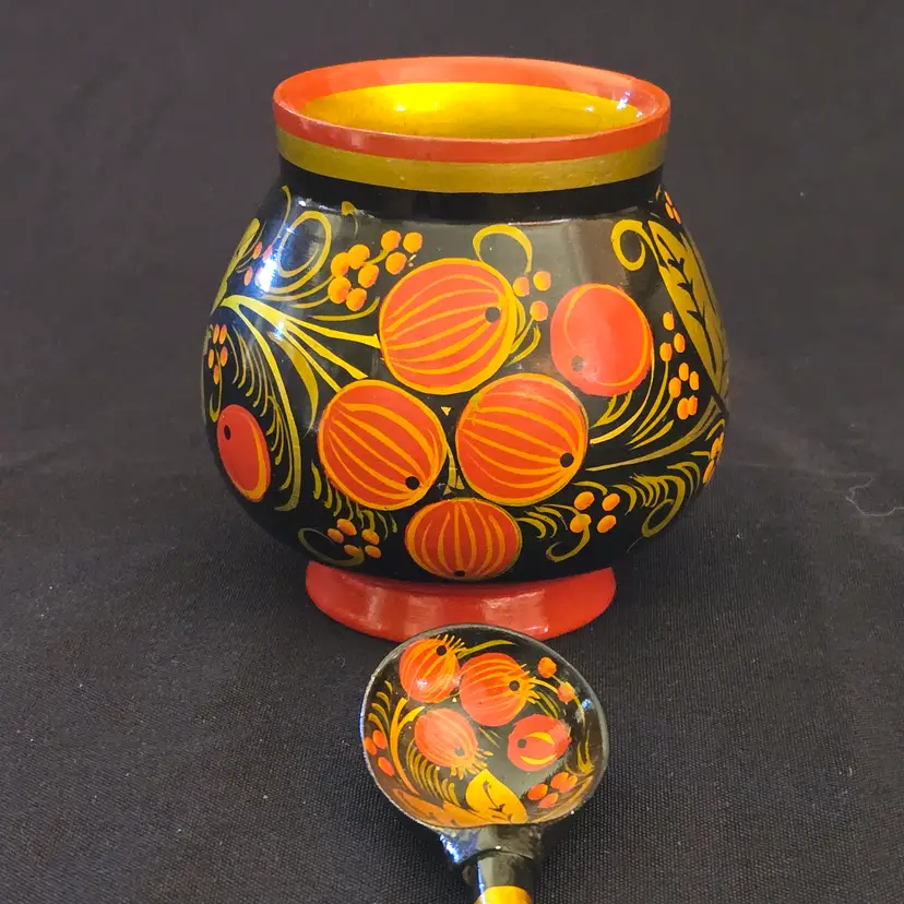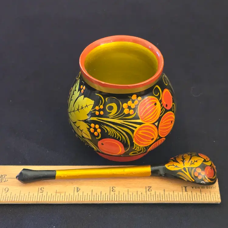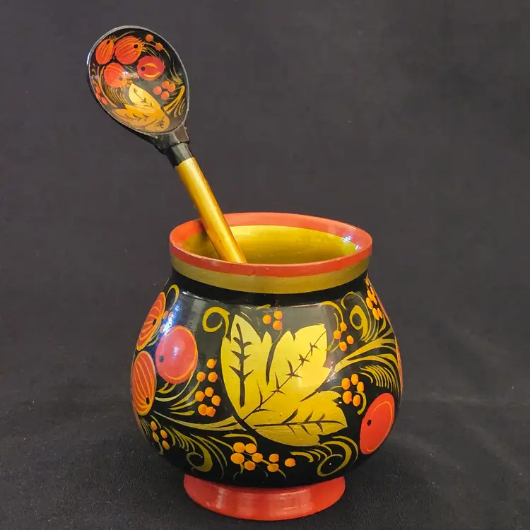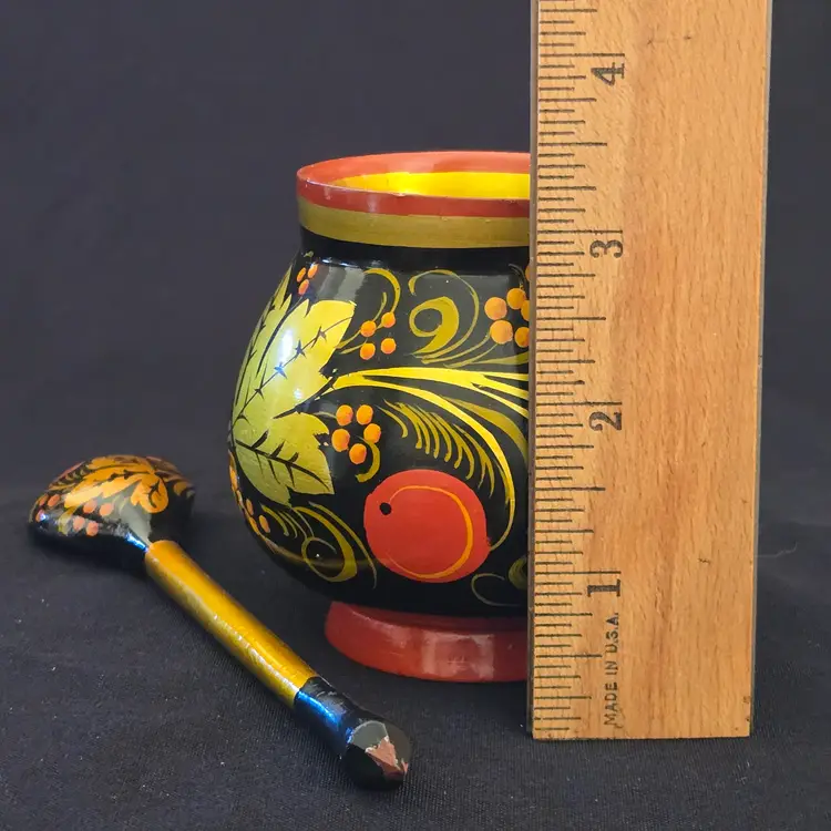 Folk Art Khokhloma Cup, Spoon Soviet Russian both Hand Painted Vintage with Condition Issues. Both have issues including dirt, edgewear, missing paint, spoon has problem with end looking as has been cut, cup has scratches, sticker residue. Please view all the photos and please ask any questions prior to purchase when possible.