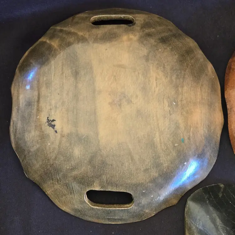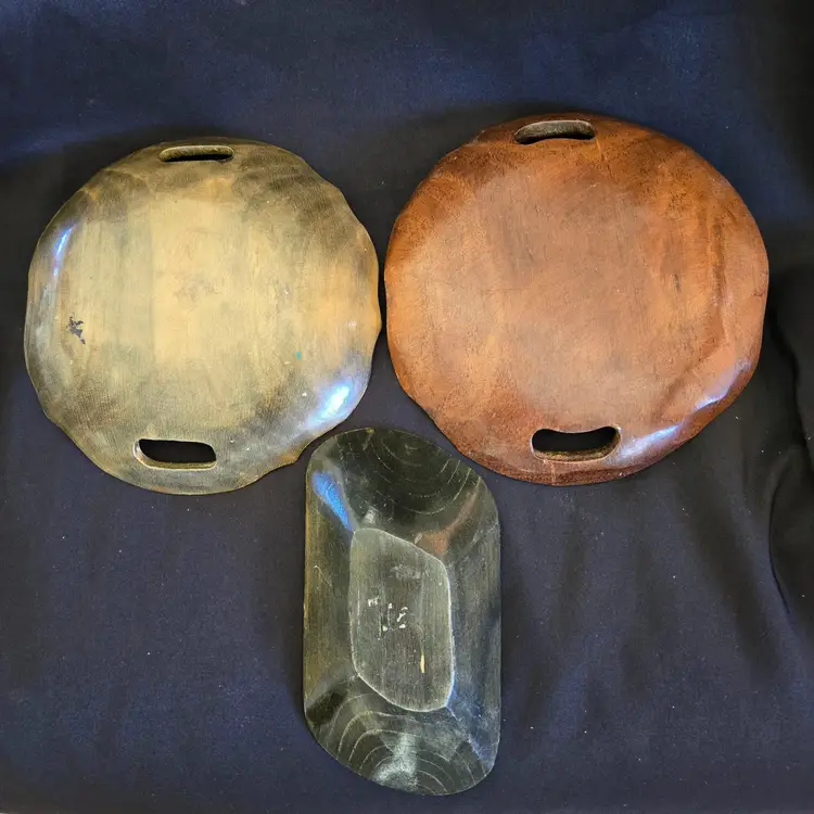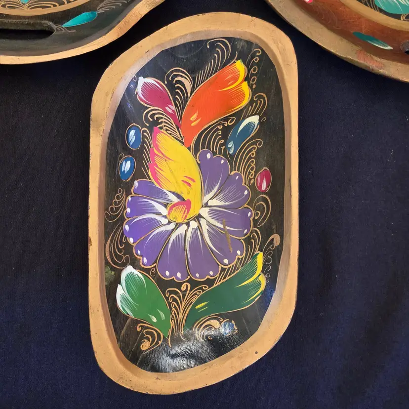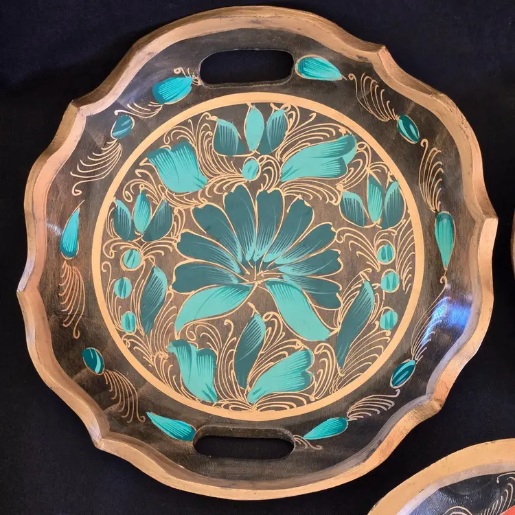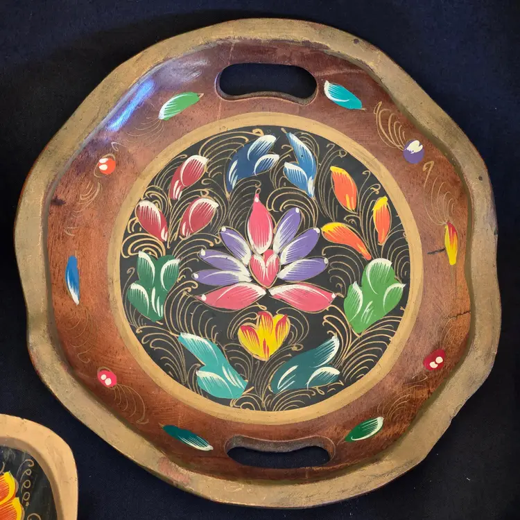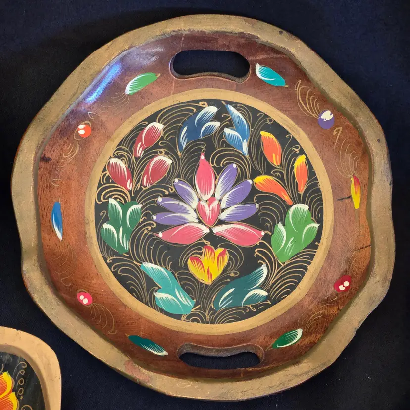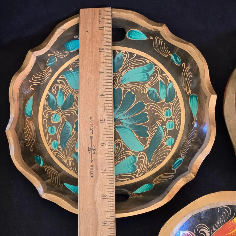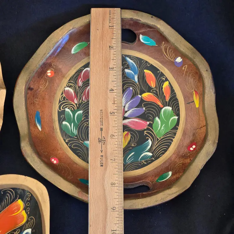 Folk Art Mexico Batea Floral Handmade and Hand Painted Carved Wood set of 3 Serving Trays Vintage. Used condition with some loss of color especially along rim, stains, dirt, scuffs, scratches, sticker residue, nicks, etc. Please view all the photos and read the entire item description and please ask any questions prior to purchase when possible.