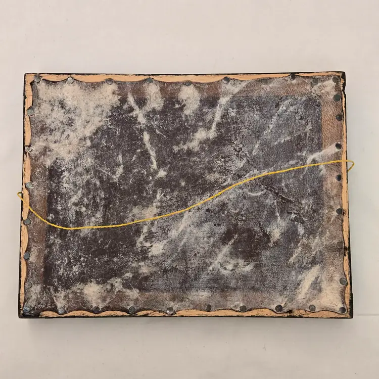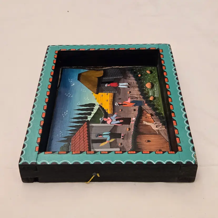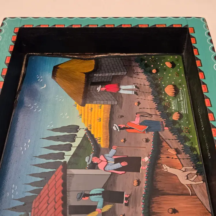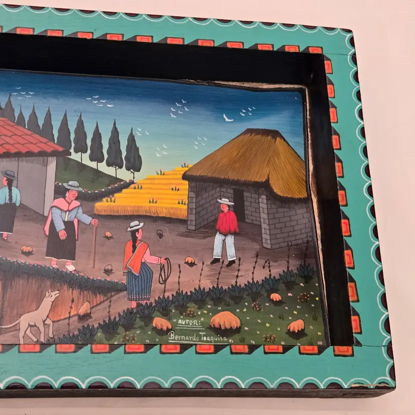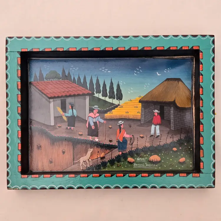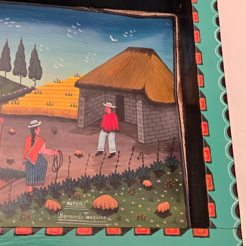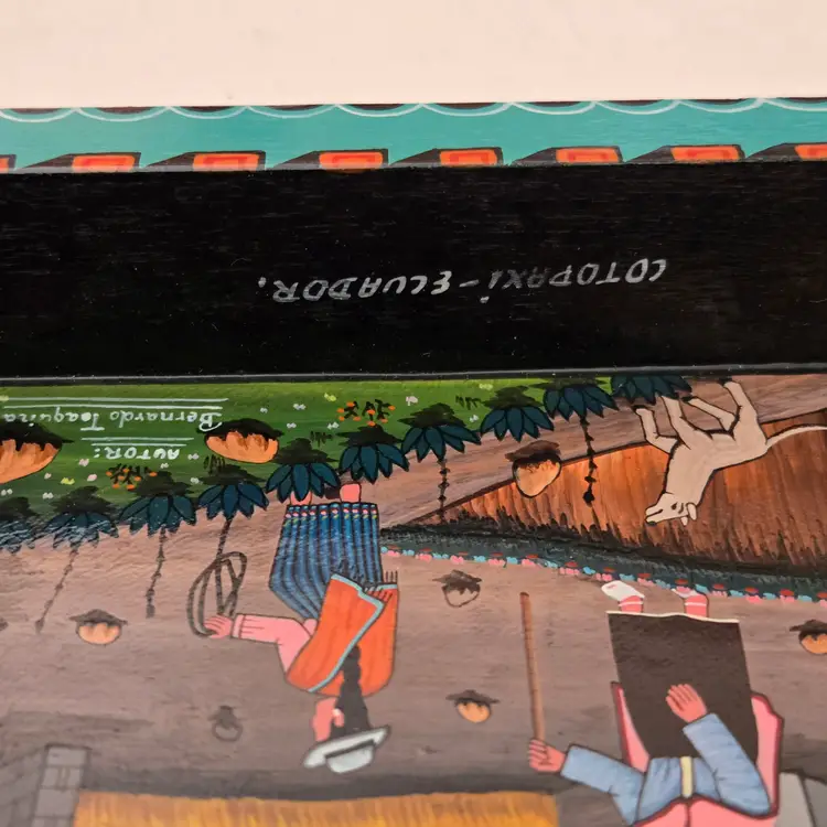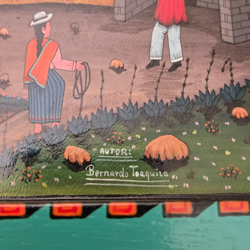 Tigua Folk Art Painting Bernardo Toaquiza Signed Framed Titled COTOPAXI-ECUADOR Indigenous Scene. May be painted on an animal skin and painted after nailed to frame. Used condition with cracks in painted frame, edgewear, material is lifting away from frame. Please view all the photos and read the entire item description and please ask any questions prior to purchase when possible.