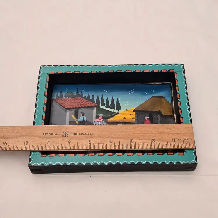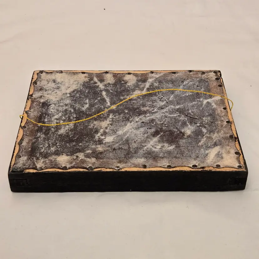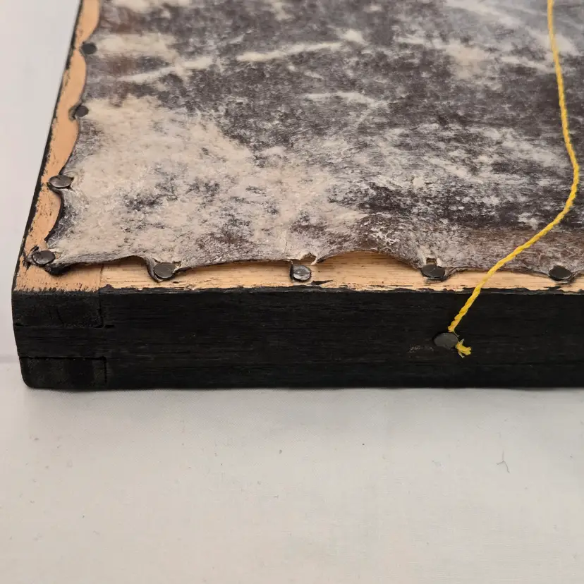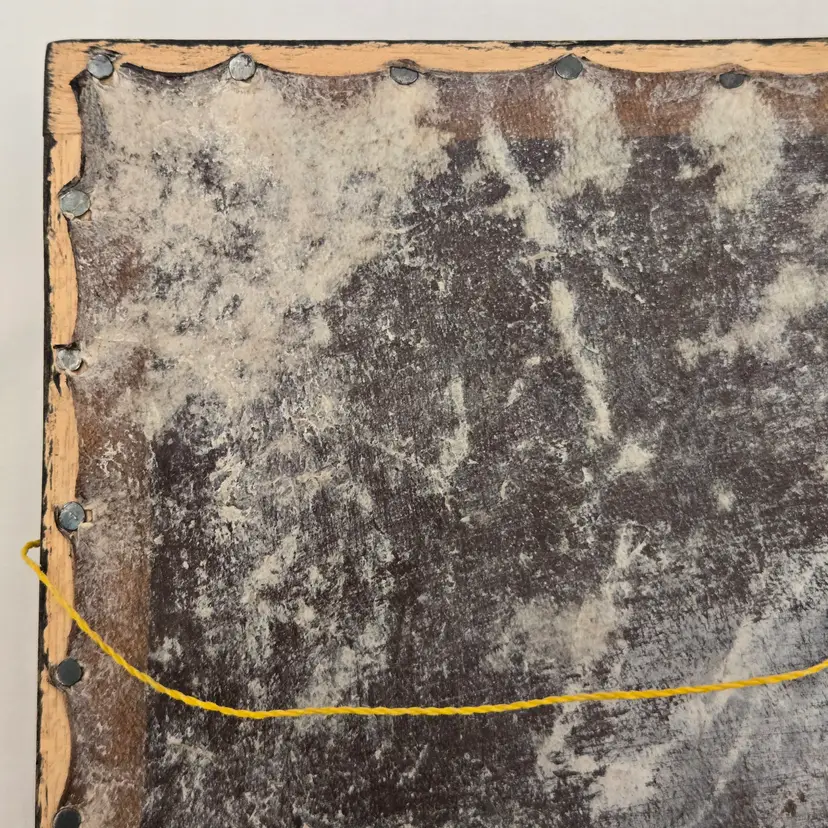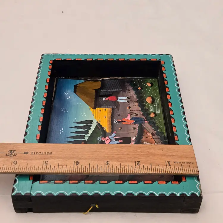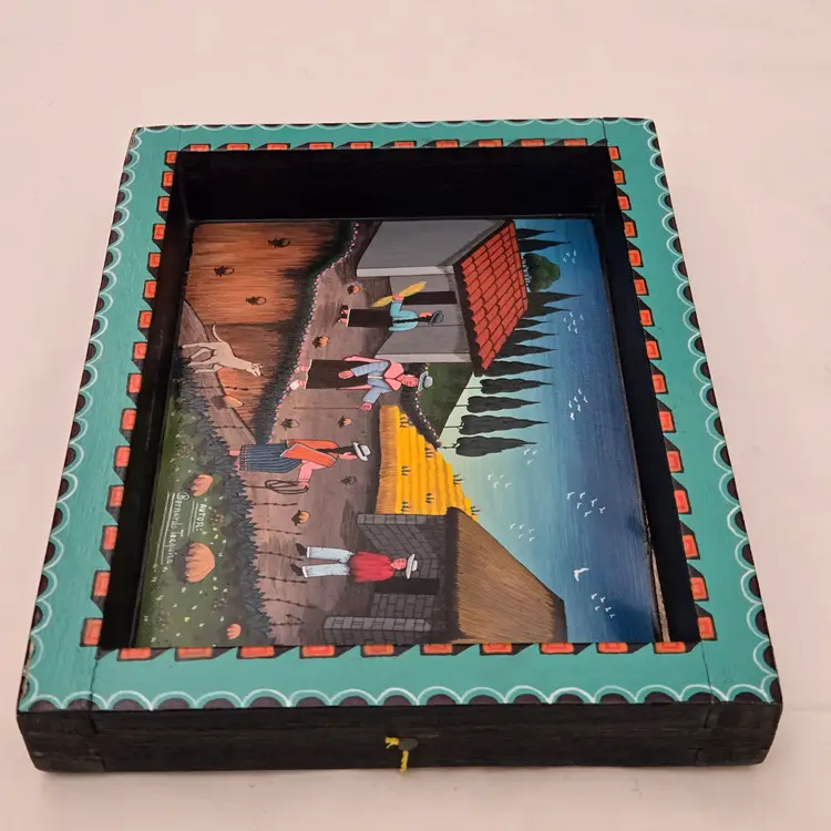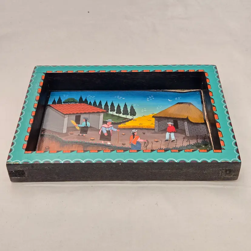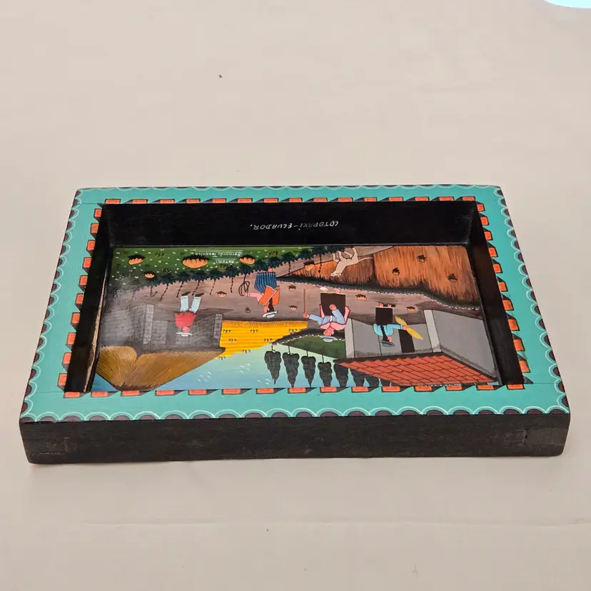 Tigua Folk Art Painting Bernardo Toaquiza Signed Framed Titled COTOPAXI-ECUADOR Indigenous Scene. May be painted on an animal skin and painted after nailed to frame. Used condition with cracks in painted frame, edgewear, material is lifting away from frame. Please view all the photos and read the entire item description and please ask any questions prior to purchase when possible.