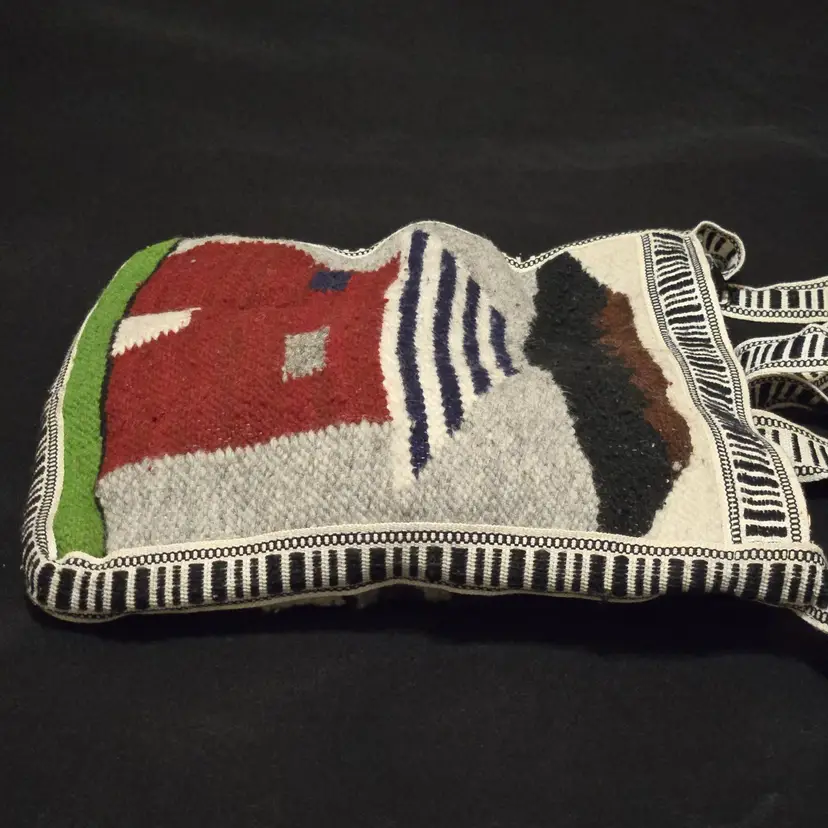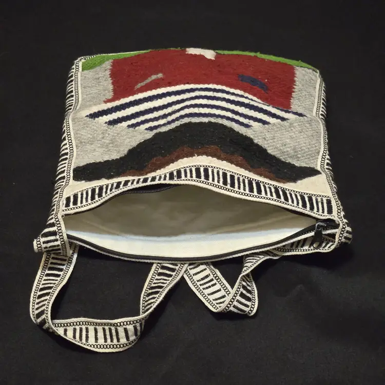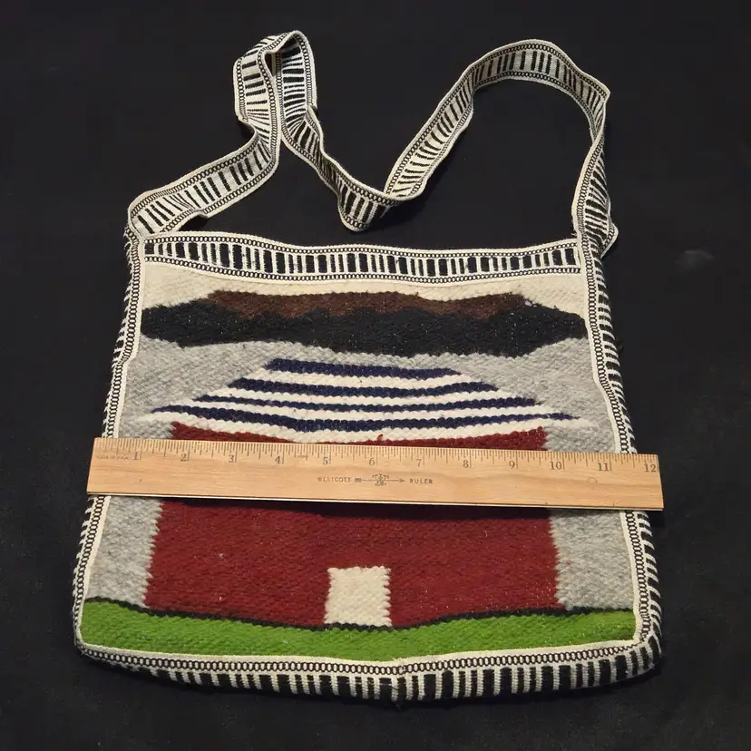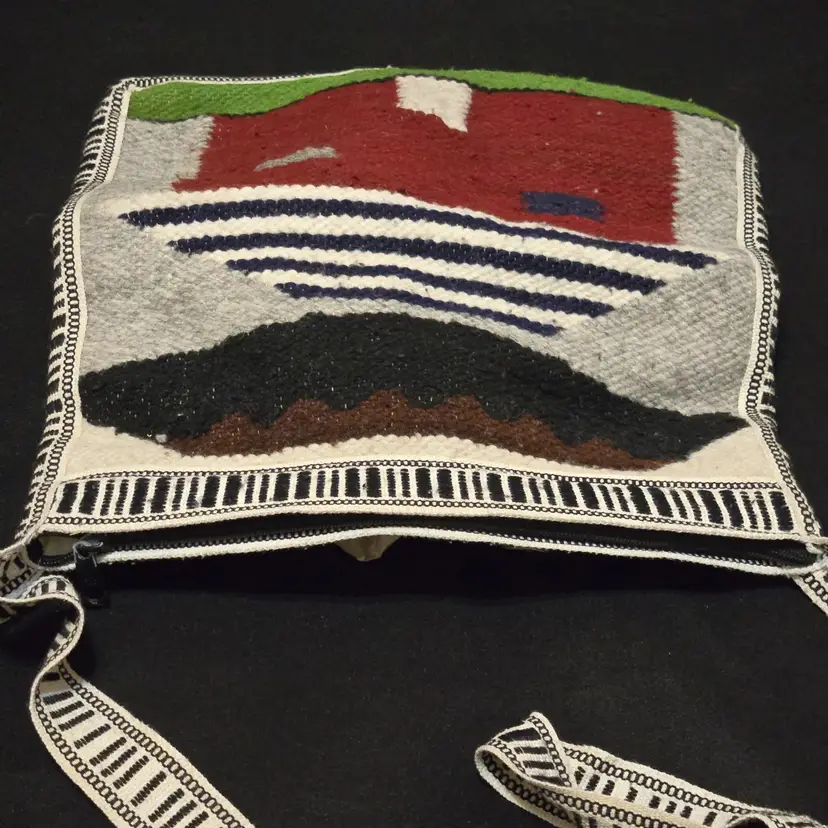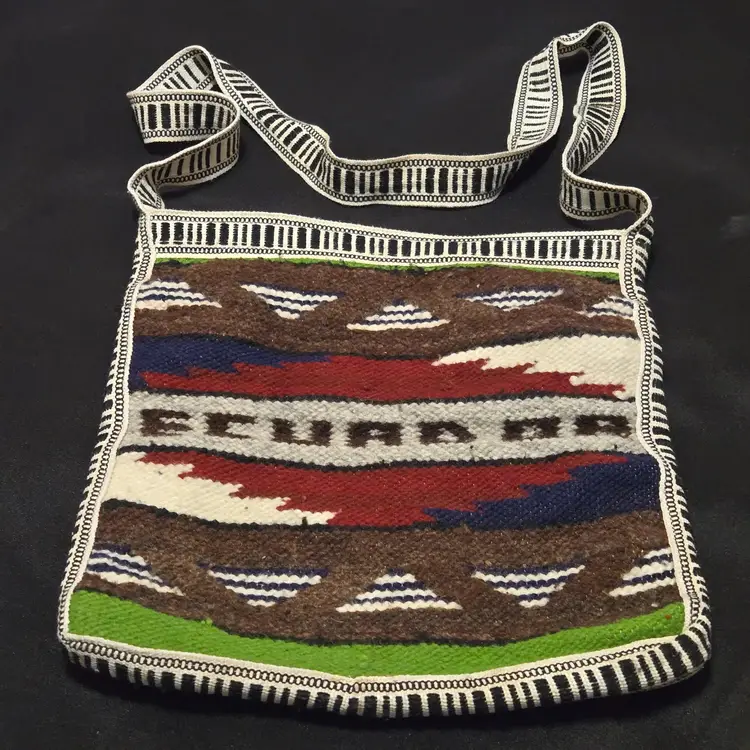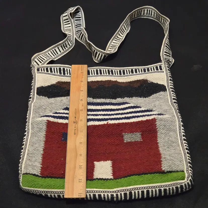 Folk Art Shoulder Bag Runa Kuarmi Woven 100% Wool House Landscape and Ecuador words 1980s Vintage. Used condition with a few loose threads, interior shows signs of use, etc. Please view all the photos and please ask any questions prior to purchase when possible.