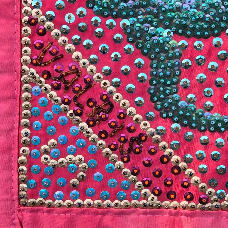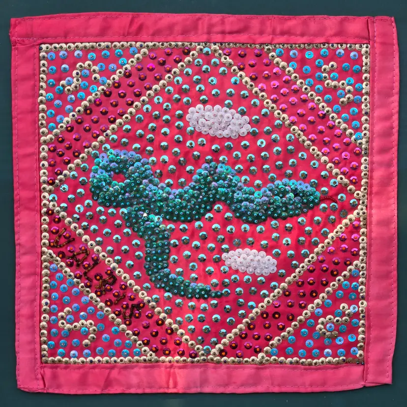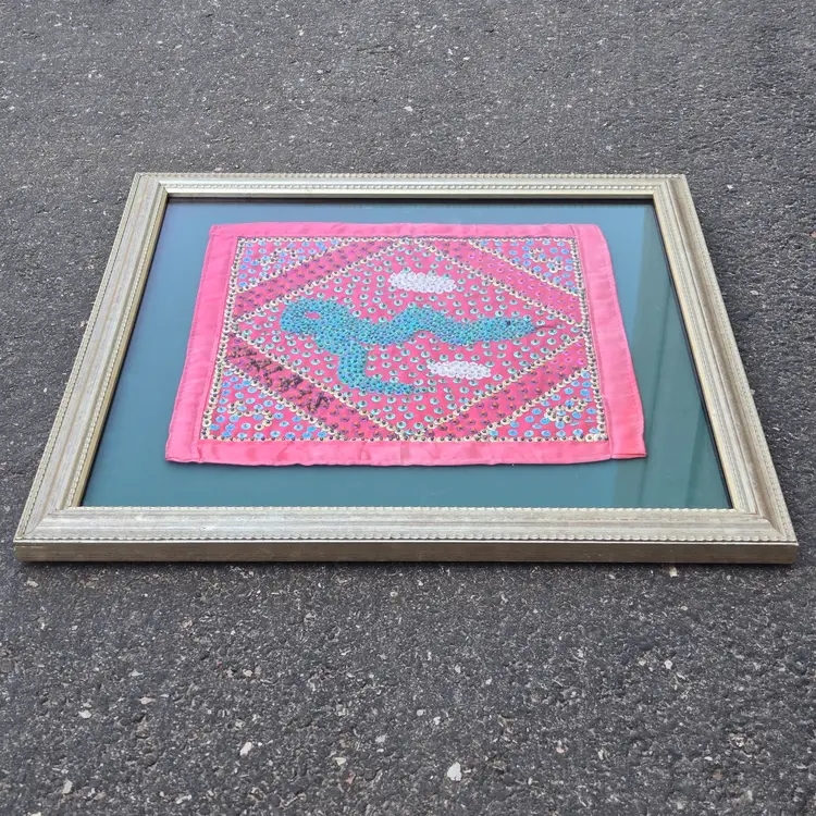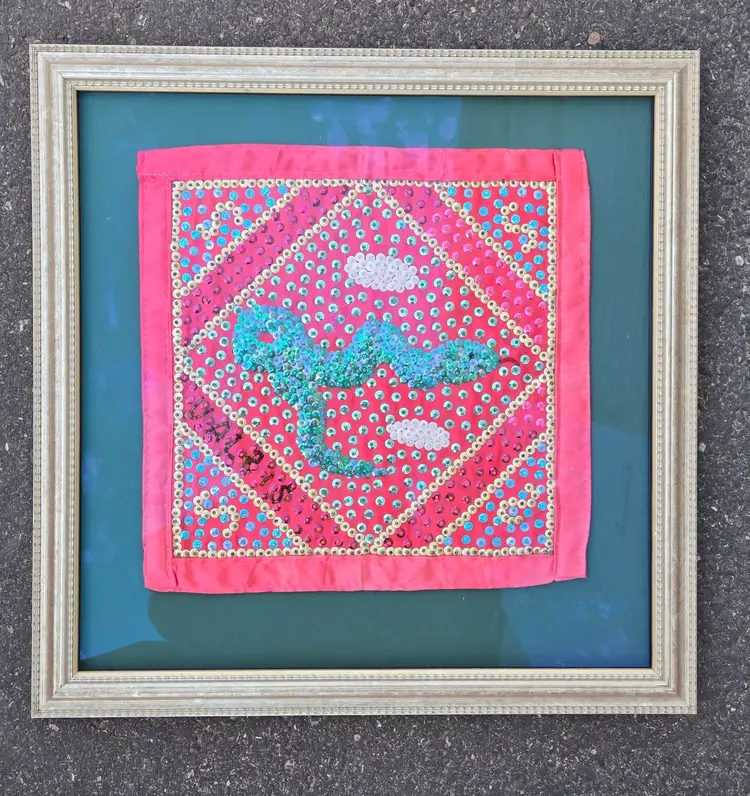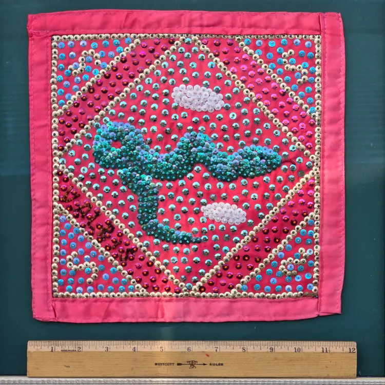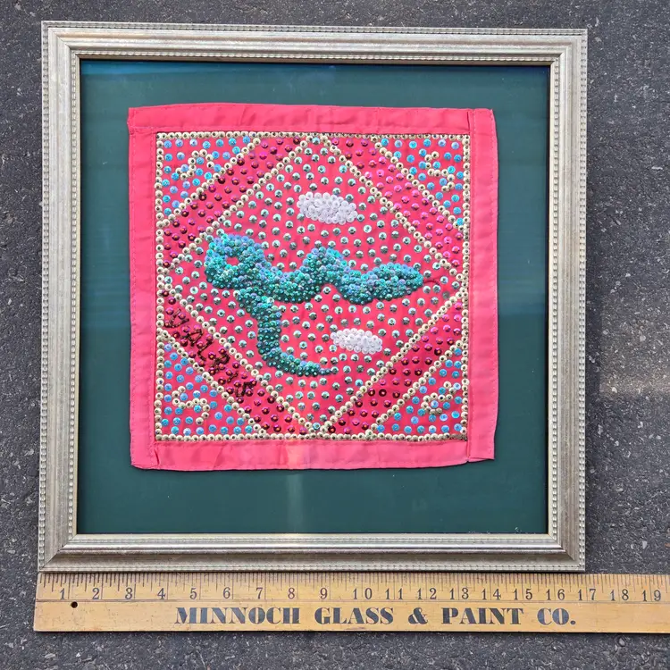 Folk Art Voodoo Flag by George Valris 11½" Square (Textile Only) Snake Haitian Signed (in sequins) Framed. Used condition with typical wear to frame and clear covering. Please view all the photos and please ask any questions prior to purchase when possible.