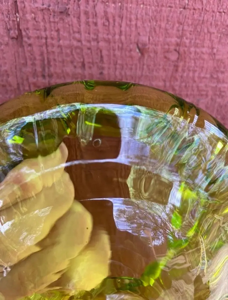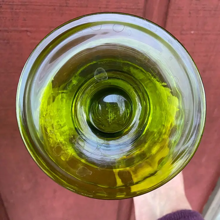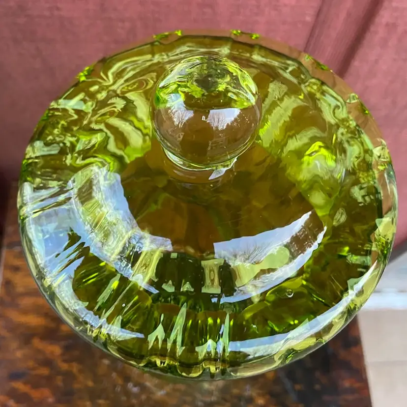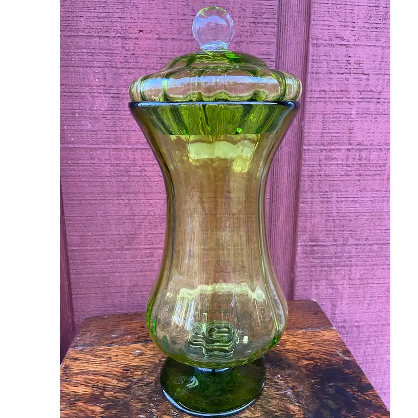 Footed Green Apothecary Jar With Lid. 12.5” Tall. Great Optics.