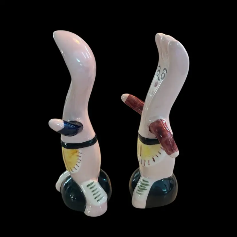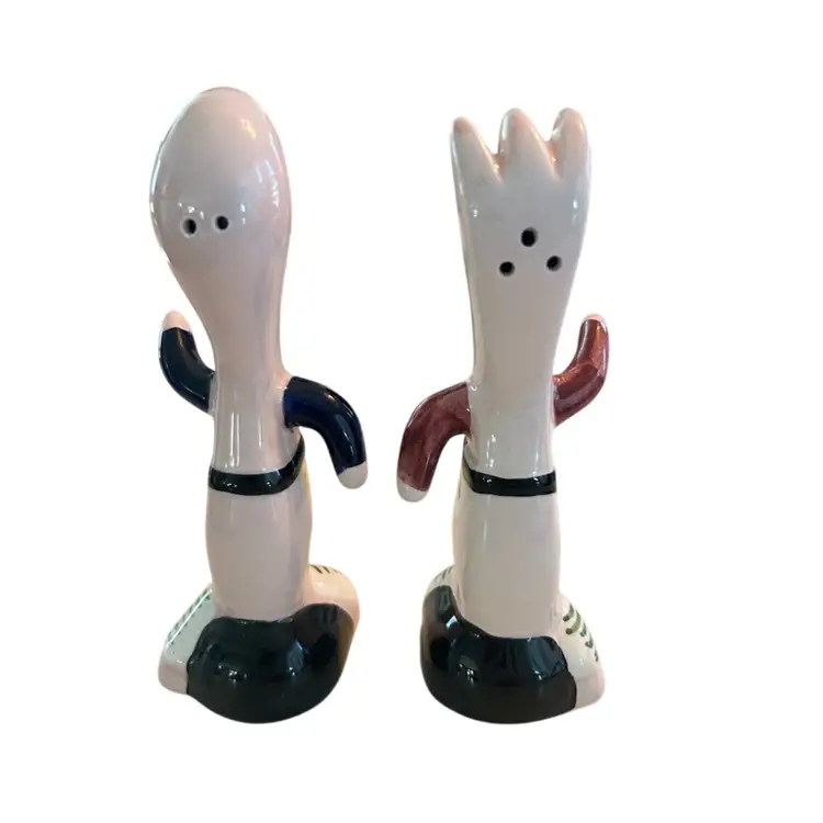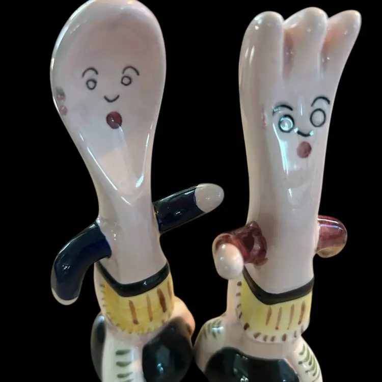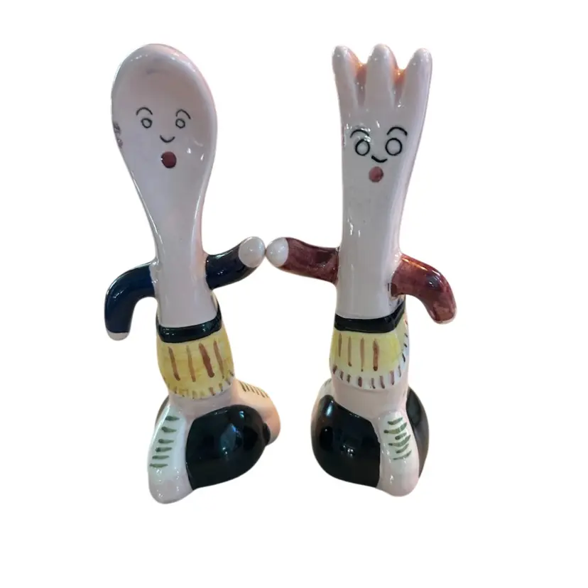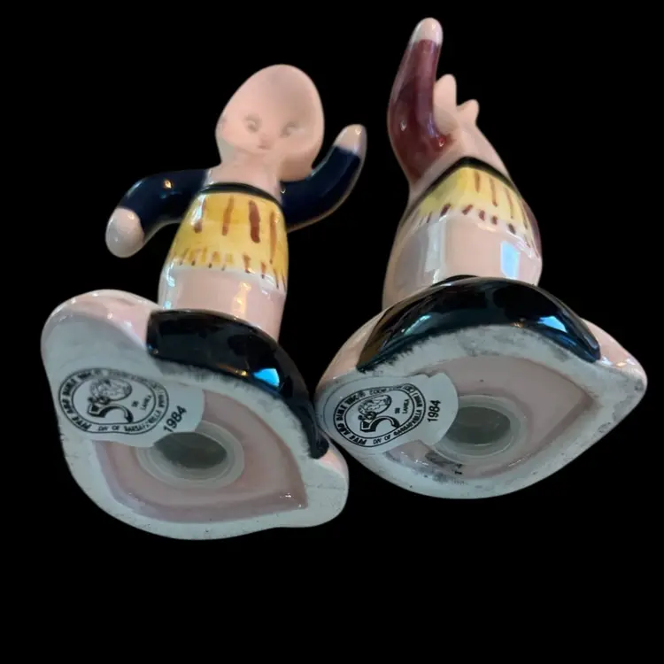 Super cute S&P shakers from 1984. Both have the original sticker on the bottom , Five & Dime, Inc. Each shaker has a slight chip as seen in the photos. They measure approximately 5” tall.
