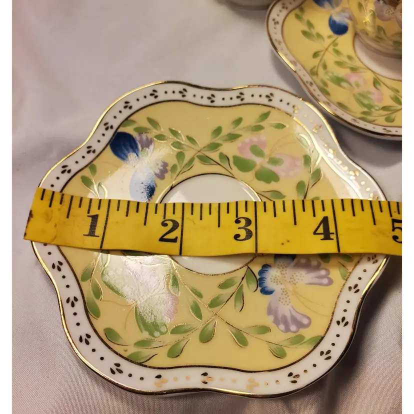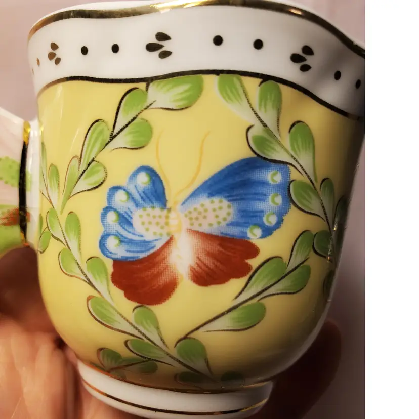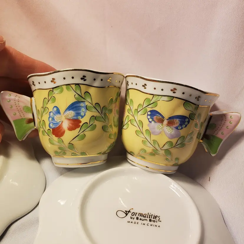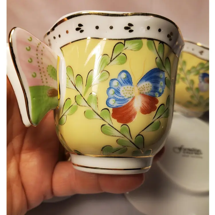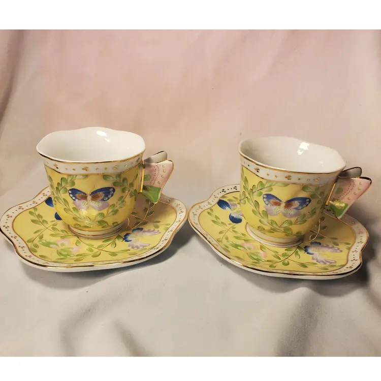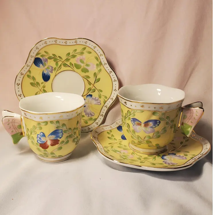 Sip your favorite tea or espresso with this charming set featuring delicate soft yellow background with butterfly and floral designs and gold trim edges. Includes two cups two saucers, perfect for a cozy afternoon. Preowned In excellent condition with no visible wear.